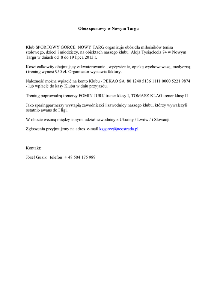 Obóz sportowy w Nowym Targu Klub SPORTOWY GORCE NOWY TARG organizuje obóz dla miłośników tenisa stołowego, dzieci i młodzieży, na obiektach naszego klubu Aleja Tysiąclecia 74 w Nowym Targu w dniach od 8 do 19 lipca 2013 r. Koszt całkowity obejmujący zakwaterowanie , wyżywienie, opiekę wychowawczą, medyczną i trening wynosi 950 zł. Organizator wystawia faktury. Należność można wpłacić na konto Klubu - PEKAO SA 80 1240 5136 1111 0000 5221 9874 - lub wpłacić do kasy Klubu w dniu przyjazdu. Trening poprowadzą trenerzy FOMIN JURIJ trener klasy I, TOMASZ KLAG trener klasy II Jako sparingpartnerzy wystąpią zawodniczki i zawodnicy naszego klubu, którzy wywalczyli ostatnio awans do I ligi. W obozie wezmą między innymi udział zawodnicy z Ukrainy / Lwów / i Słowacji. Zgłoszenia przyjmujemy na adres e-mail [email protected] Kontakt: Józef Guzik telefon: + 48 504 175 989