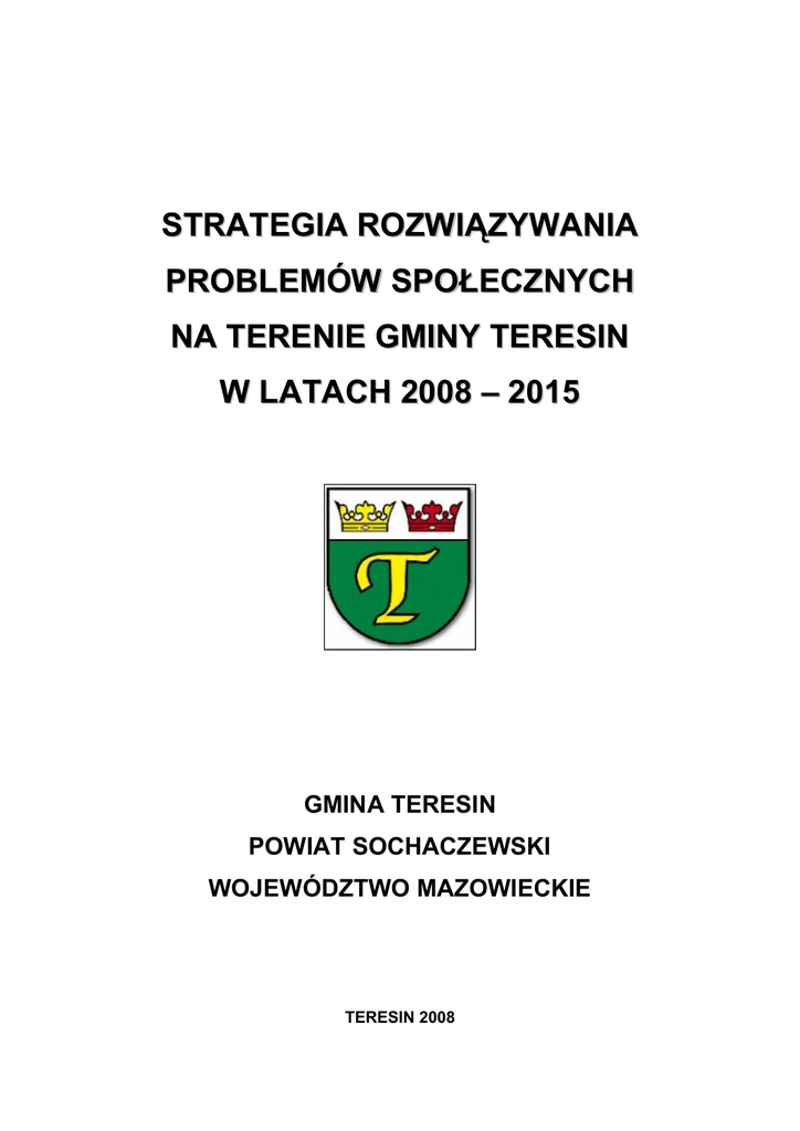 STRATEGIA ROZWIĄZYWANIA PROBLEMÓW SPOŁECZNYCH NA TERENIE GMINY TERESIN W LATACH 2008 – 2015 GMINA TERESIN POWIAT SOCHACZEWSKI WOJEWÓDZTWO MAZOWIECKIE TERESIN 2008 SPIS TREŚCI WSTĘP.....................................................................................................................................3 1. CEL I PROCES TWORZENIA STRATEGII ROZWIĄZYWANIA PROBLEMÓW SPOŁECZNYCH ......................................................................................................................5 1.1. UWAGI OGÓLNE .............................................................................................................5 1.2. PODSTAWA PRAWNA ....................................................................................................5 1.3. PODMIOTY UCZESTNICZĄCE W PRZYGOTOWANIU STRATEGII ROZWIĄZYWANIA PROBLEMÓW SPOŁECZNYCH NA TERENIE GMINY TERESIN .........................................8 1.4. OKRES REALIZACJI STRATEGII ...................................................................................8 1.5. WYKORZYSTANE ŹRÓDŁA............................................................................................8 2. CHARAKTERYSTYKA GMINY TERESIN...........................................................................9 2.1. PODSTAWOWE INFORMACJE O GMINIE .....................................................................9 2.1.1. POŁOŻENIE, POWIERZCHNIA, LUDNOŚĆ .............................................................9 2.1.2. INFRASTRUKTURA TECHNICZNA.........................................................................10 2.1.3. GOSPODARKA ........................................................................................................12 2.1.4. TURYSTYKA ............................................................................................................16 2.1.5. MIESZKAŃCY ..........................................................................................................18 2.2. SYSTEM POMOCY SPOŁECZNEJ W GMINIE TERESIN .............................................30 2.3. IDENTYFIKACJA PODSTAWOWYCH PROBLEMÓW SPOŁECZNYCH NA TERENIE GMINY TERESIN ...................................................................................................................38 2.3.1. ANALIZA ANKIET ....................................................................................................38 2.4. ANALIZA SWOT.............................................................................................................46 3. KIERUNKI ROZWOJU GMINY..........................................................................................53 3.1. WIZJA ROZWOJU GMINY .............................................................................................53 3.2. CEL GŁÓWNY I CELE SZCZEGÓŁOWE ......................................................................53 4. UWARUNKOWANIA ROZWIĄZYWANIA PROBLEMÓW SPOŁECZNYCH WYNIKAJĄCE Z DOKUMENTÓW PROGRAMOWYCH ......................................................63 4.1.DOKUMENTY PROGRAMOWE NA SZCZEBLU KRAJOWYM...................................63 4.2.DOKUMENTY PROGRAMOWE NA SZCZEBLU WOJEWÓDZTWA ..........................64 4.3.DOKUMENTY PROGRAMOWE NA SZCZEBLU POWIATU.......................................66 5. ZARZĄDZANIE REALIZACJĄ STRATEGII ......................................................................67 ZAKOŃCZENIE .....................................................................................................................68 SPIS TABEL ..........................................................................................................................68 SPIS WYKRESÓW ................................................................................................................69 SPIS RYSUNKÓW.................................................................................................................71 WESTMOR CONSULTING Strategia Rozwiązywania Problemów Społecznych na terenie Gminy Teresin w latach 2008 - 2015 2 WSTĘP Potrzeba opracowania strategii rozwiązywania problemów społecznych wynika z jednej strony z przepisów prawa, a z drugiej – z aktualnej sytuacji ekonomiczno – społecznej mieszkańców gminy. Ma ona bowiem stanowić podstawę do realizacji działań mających na celu wyeliminowanie niekorzystnych zjawisk społecznych mających miejsce na terenie danej jednostki samorządu terytorialnego. Należy bowiem pamiętać, że przed władzami samorządowymi oraz instytucjami pomocy społecznej na poziomie lokalnym stoją do rozwiązania trudne problemy społeczne. Pogłębiające się dysproporcje dochodowe rodzin, zjawiska związane ze sferą ubóstwa, niedostatek materialny rodzin, problemy egzystencji osób samotnych, starszych i niepełnosprawnych tworzą powiązany ze sobą konglomerat problemów społecznych, które decydują w istocie o sposobie odczuwania jakości życia przez społeczność lokalną. Od skuteczności ich rozwiązania zależy funkcjonowanie wspólnoty samorządowej. Rozwiązanie problemów społecznych jest procesem długofalowym i dlatego konieczne jest podejście strategiczne, również na poziomie lokalnym, do zagadnień związanych z szeroko pojętą polityką społeczną. Wyrazem tego procesu jest właśnie niniejsza strategia rozwiązywania problemów społecznych. Niezbędne jest, aby w proces jej tworzenia zaangażowały się zarówno władze samorządowe, jak i mieszkańcy gminy. Władze samorządowe pełnią bowiem kluczową rolę w rozwoju społeczno – gospodarczym każdej społeczności lokalnej. Kreują i realizują politykę rozwoju lokalnego. Należy jednak podkreślić, że władze samorządowe – jako podmiot gospodarujący i zarazem zarządzający funkcjonowaniem gminy – powinny w swoich działaniach być zorientowane na: − zapewnienie względnej równowagi pomiędzy potrzebami i preferencjami społecznymi, funkcjami oraz zagospodarowaniem przestrzeni; − eliminowanie lub 