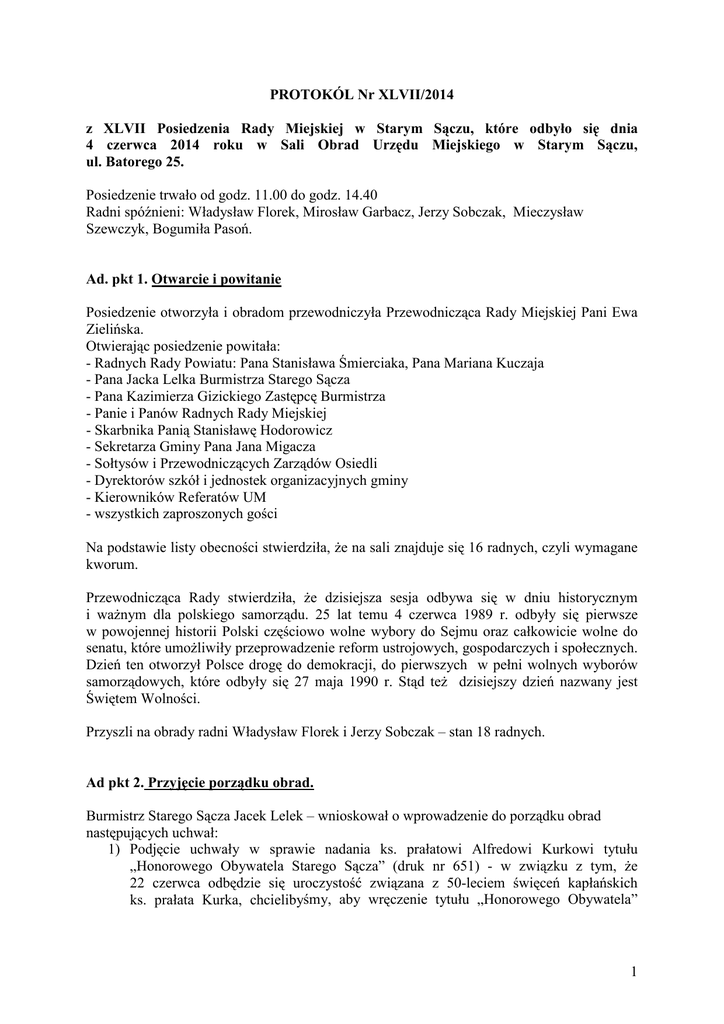 PROTOKÓL Nr XLVII/2014 z XLVII Posiedzenia Rady Miejskiej w Starym Sączu, które odbyło się dnia 4 czerwca 2014 roku w Sali Obrad Urzędu Miejskiego w Starym Sączu, ul. Batorego 25. Posiedzenie trwało od godz. 11.00 do godz. 14.40 Radni spóźnieni: Władysław Florek, Mirosław Garbacz, Jerzy Sobczak, Mieczysław Szewczyk, Bogumiła Pasoń. Ad. pkt 1. Otwarcie i powitanie Posiedzenie otworzyła i obradom przewodniczyła Przewodnicząca Rady Miejskiej Pani Ewa Zielińska. Otwierając posiedzenie powitała: - Radnych Rady Powiatu: Pana Stanisława Śmierciaka, Pana Mariana Kuczaja - Pana Jacka Lelka Burmistrza Starego Sącza - Pana Kazimierza Gizickiego Zastępcę Burmistrza - Panie i Panów Radnych Rady Miejskiej - Skarbnika Panią Stanisławę Hodorowicz - Sekretarza Gminy Pana Jana Migacza - Sołtysów i Przewodniczących Zarządów Osiedli - Dyrektorów szkół i jednostek organizacyjnych gminy - Kierowników Referatów UM - wszystkich zaproszonych gości Na podstawie listy obecności stwierdziła, że na sali znajduje się 16 radnych, czyli wymagane kworum. Przewodnicząca Rady stwierdziła, że dzisiejsza sesja odbywa się w dniu historycznym i ważnym dla polskiego samorządu. 25 lat temu 4 czerwca 1989 r. odbyły się pierwsze w powojennej historii Polski częściowo wolne wybory do Sejmu oraz całkowicie wolne do senatu, które umożliwiły przeprowadzenie reform ustrojowych, gospodarczych i społecznych. Dzień ten otworzył Polsce drogę do demokracji, do pierwszych w pełni wolnych wyborów samorządowych, które odbyły się 27 maja 1990 r. Stąd też dzisiejszy dzień nazwany jest Świętem Wolności. Przyszli na obrady radni Władysław Florek i Jerzy Sobczak – stan 18 radnych. Ad pkt 2. Przyjęcie porządku obrad. Burmistrz Starego Sącza Jacek Lelek – wnioskował o wprowadzenie do porządku obrad następujących uchwał: 1) Podjęcie uchwały w sprawie nadania ks. prałatowi Alfredowi Kurkowi tytułu „Honorowego Obywatela Starego Sącza” (druk nr 651) - w związku z tym, że 22 czerwca odbędzie się uroczystość związana z 50-leciem święceń kapłańskich ks. prałata Kurka, chcielibyśmy, aby wręczenie tytułu „Honorowego Obywatela” 1 mogło się odbyć wcześniej tj. w piątek 20 czerwca, stąd prośba, aby tę uchwałę podjąć dzisiaj, 2) Podjęcie uchwały w sprawie przyjęcia „Regulaminu amatorskiego połowu ryb na terenie „Dużego Stawu” w wodach będących we władaniu Gminy Stary Sącz” (druk nr 652) – w związku z unieważnieniem przez Wojewodę Zarządzenia Burmistrza w tej sprawie przedstawiony jest projekt uchwały do podjęcia przez Radę, do której kompetencji to należy. Jest to sprawa pilna, żeby nie było problemu z działaniem łowiska ryb w najbliższym okresie. Przyszedł na obrady radny Mirosław Garbacz – stan – 19 radnych. Przewodnicząca Rady zaproponowała wprowadzenie dodatkowych uchwał jako: - punkt nr 20 - uchwała druk nr 651 – „za” – 19 radnych, - punkt nr 26 – uchwała druk nr 652 – „za” – 19 radnych. Porządek obrad z wprowadzonymi zmianami został przyjęty jednogłośnie: „za” – 19 radnych. 1. Otwarcie i powitanie. 2. Przyjęcie porządku obrad. 3. Przyjęcie protokołu z XLVI posiedzenia Rady. 4. Sprawozdanie Burmistrza Starego Sącza. 5. Sprawozdanie Przewodniczącej Rady Miejskiej. 6. Interpelacje i zapytania radnych. 7. Zapytania Sołtysów i Przewodniczących Zarządów Osiedli oraz odpowiedzi. 8. Podjęcie uchwały w sprawie zatwierdzenia sprawozdania finansowego wraz ze sprawozdaniem z wykonania budżetu Gminy Stary Sącz za 2013 r. (druk nr 639). 9. Podjęcie uchwały w sprawie zatwierdzenia rocznego skonsolidowanego sprawozdania finansowego Gminy Stary Sącz za 2013 r. (druk nr 640). 10. Podjęcie uchwały w sprawie udzielenia absolutorium dla Burmistrza Starego Sącz za 2013 r. (druk nr 641): a). odczytanie opinii Regionalnej Izby Obrachunkowej o wykonaniu budżetu za rok 2013. b). zapoznanie się z wnioskiem Komisji Rewizyjnej Rady Miejskiej c). odczytanie opinii Regionalnej Izby Obrachunkowej w sprawie wniosku Komisji Rewizyjnej d). głosowanie nad uchwałą 11. Podjęcie uchwały w sprawie zmian wieloletniej prognozy finansowej Gminy Stary Sącz na lata 2014-2033 (druk nr 637). 12. Podjęcie uchwały w sprawie zmian uchwały budżetowej Nr XLII/546/2013 Rady Miejskiej w Starym Sączu z dnia 20.12.2013 r. w sprawie uchwalenia budżetu Gminy Stary Sącz na 2014 rok (druk nr 638). 13. Podjęcie uchwały w sprawie wydzierżawienia nieruchomości gruntowej położonej w Gołkowicach Górnych (druk nr 633). 14. Podjęcie uchwały intencyjnej w sprawie udostępnienia części nieruchomości stanowiącej własność gminy Stary Sącz, pod budowę kompleksu służącego Sądeckiemu WOPR (druk nr 634). 15. Podjęcie uchwały w sprawie nabycia nieruchomości położonych w Gołkowicach Górnych (druk nr 635). 16. Podjęcie uchwały w sprawie zmiany uchwały Nr XXIV/235/2012 z dnia 11 czerwca 2012 r. (druk nr 636). 17. Podjęcie uchwały w sprawie oddania w najem lokalu użytkowego położonego w budynku Rynek 22 w Starym Sączu (druk nr 642). 2 18. Podjęcie uchwały w sprawie zaliczenia drogi do kategorii dróg gminnych Gminy Stary Sącz i ustalenia jej przebiegu (druk nr 643.). 19. Podjęcie uchwały w sprawie udzielenia dotacji na prace konserwatorskie, restauratorskie lub roboty budowlane przy zabytku wpisanym do rejestru zabytków (druk nr 644). 20. Podjęcie uchwały w sprawie nadania ks. prałatowi Alfredowi Kurkowi tytułu „Honorowego Obywatela Starego Sącza” (druk nr 651) 21. Podjęcie uchwały w sprawie nadania statutu Zespołowi Szkół: Szkoła Podstawowa i Gimnazjum w Gołkowicach Górnych (druk nr 645). 22. Podjęcie uchwały w sprawie oddania w najem pomieszczeń kuchni w budynku Zespołu Szkół: Szkoła Podstawowa i Gimnazjum w Barcicach (druk nr 646). 23. Podjęcie uchwały w sprawie oddania w najem pomieszczeń kuchni wraz z zapleczem w budynku Sz
