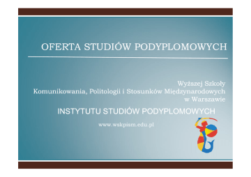 OFERTA STUDIÓW PODYPLOMOWYCH Wyższej Szkoły Komunikowania, Politologii i Stosunków Międzynarodowych w Warszawie INSTYTUTU STUDIÓW PODYPLOMOWYCH www.wskpism.edu.pl INSTYTUT STUDIÓW PODYPLOMOWYCH Wyższej Szkoły Komunikowania, Politologii i Stosunków Międzynarodowych Studia podyplomowe adresowane są do absolwentów szkół wyższych posiadających tytuł licencjata, magistra lub inżyniera, pragnących pogłębić wiedzę zdobytą w czasie studiów, a także uzyskać dodatkowe kwalifikacje. W szczególności adresujemy nasze studia do nauczycieli wszystkich placówek szkolnych i opiekuńczo – wychowawczych. Oferowane studia podyplomowe, to także propozycja dla instytucji oraz firm, które chcą podnieść kwalifikacje swoich pracowników w cenionych na rynku pracy zawodach. Kształcenie pracowników jest dla wielu pracodawców najtańszym, a zarazem najefektywniejszym sposobem zwiększenia wydajności pracy, uniknięcia zwolnień oraz unowocześnienia metod pracy. Wysoką jakość kształcenia prowadzonego przez Instytut Studiów Podyplomowych Wyższej Szkoły Komunikowania, Politologii i Stosunków Międzynarodowych zapewnia staranny dobór kadry nauczającej, w skład której wchodzą doświadczeni i cieszący się uznaniem praktycy, właściwe programy i metody nauczania, a także nowoczesne wyposażenie pomieszczeń w sprzęt ułatwiający realizację procesu dydaktycznego. Programy kształcenia realizowane są z zastosowaniem nowoczesnych metod dydaktycznych, w tym z wykorzystaniem technik kształcenia na odległość (e-learning). W ramach swojej działalności organizacyjnej Instytut Studiów Podyplomowych prowadzi współpracę z ośrodkami doskonalenia nauczycieli, oddziałami związku nauczycielstwa polskiego, zakładami doskonalenia zawodowego oraz uczelniami wyższymi w kraju i za granicą. Dzięki temu możemy zagwarantować naszym studentom wysoki poziom nauczania oraz wymagane praktyki zawodowe. Wiedza i umiejętności nabyte podczas oferowanego przez Instytut Studiów Podyplomowych kształcenia, którego ofertę prezentujemy, są pomocne w realizacji planów zawodowych tych, którzy dzięki solidnemu wykształceniu pragną sprostać wciąż rosnącym wymogom rzeczywistości. Zapraszamy do skorzystania z naszej oferty, Rafał Kosmulski Dyrektor Instytutu Studiów Podyplomowych Aleje Jerozolimskie 44, 00-024 Warszawa, tel. 790 790 316, www.wskpism.edu.pl Oferta na rok akademicki 2012/2013 Ilość semestrów Czesne za semestr 1. Oligofrenopedagogika 3 800 zł 2. Terapia Pedagogiczna 3 1000 zł 3. Socjoterapia 3 1000 zł 4. Przygotowanie pedagogiczne 3 800 zł 5. Zarządzanie oświatą 2 1200 zł 6. Edukacja wczesnoszkolna i przedszkolna 3 1000 zł 7. Logopedia 4 900 zł 8. Doradztwo zawodowe 3 1000 zł 9. Wczesne wspomaganie rozwoju dziecka 3 1000 zł 10. Edukator medyczny 2 1200 zł 11. Edukacja dla bezpieczeństwa 3 1000 zł 12. Bibliotekoznawstwo i informacja naukowa 2 1200 zł 13. Higiena i epidemiologia w higienie i promocji zdrowia 2 1200 zł 14. Mediacje i negocjacje 2 1200 zł 15. Organizacja pomocy społecznej 2 1200 zł 16. Zarządzanie bezpieczeństwem i higieną pracy 2 1200 zł Nazwa kierunku studia podyplomowe OLIGOFRENOPEDAGOGIKA Studia przeznaczone dla osób posiadających przygotowanie pedagogiczne, ukończone studia • Przedstawię wam klasęsłuchaczy i pokażę naszą salę magisterskie. StudiaX przygotowują do prowadzenia nauczania dzieci i młodzieży z niepełnosprawnością intelektualną..Ukończenie studiów pozwoli na twórcze rozwijanie swoich lekcyjną. zdolności i umiejętności pedagogicznych w zakresie oligofrenopedagogiki. Absolwenci studiów Opis studiów znacząco udoskonalą swoje umiejętności w dziedzinie komunikowania społecznego, pracy z osobą niepełnosprawną i jego rodziną. Ukształtowana podczas studiów świadomość odpowiedzialności etycznej i społecznej związanej z pracą z osobami niepełnosprawnymi pozwoli im dołączyć do grona specjalistów w zakresie oligofrenopedagogiki. • Jeśli podczas prezentacji ktoś będzie chciał zadać pytanie, proszę podnieść rękę i zaczekać Czas trwania 3 semestry (w tym jeden on-line) od 01.10.2012 do 30.06.2013, studia w trybie niestacjonarnym 1. Pedagogika specjalna 6. Kształcenie integracyjne na wywołanie. Ramowy program studiów łącznie 355 godz. 2. Oligofrenopedagogika 3. Podstawy psychologii i rewalidacji 7. Arteterapia w pracy z dzieckiem uposledzonym umysłowo 4. Metodyka nauczania i wychowania lekko upośledzonych umysłowo 8. Elementy psychiatrii i psychopatologii 9. Metodyka wychowania w internacie 10. Diagnoza i terapia pedagogiczna 11.Praca z dzieckiem ze specjalnymi potrzebami edukacyjnymi 5. Metodyka wychowania głębiej upośledzonych umysłowo Koszt studiów Miejsce zajęć 2400 zł (3 x 800 zł za semestr lub płatność ratalna 10 x 240 zł), opłata rekrutacyjna 100zł Powiatowy Ośrodek Doskonalenia Nauczycieli w Kluczborku, ul. Byczyńska 7 Rekrutacja: Powiatowy Ośrodek Doskonalenia Nauczycieli w Kluczborku, ul. Byczyńska 7, 46-200 Kluczbork tel 774187249 e-mail: [email protected] studia podyplomowe TERAPIA PEDAGOGICZNA Celem studiów jest poznanie teoretycznych podstaw terapii pedagogicznej i jej praktyczne zastosowanie w profilaktyce, diagnozie i korekcji zaburzeń w zachowaniu i uczeniu się człowieka od urodzenia, poprzez wczesne dzieciństwo, wiek przedszkolny i szkolny. Absolwenci studiów wyposażeni zostaną w umiejętności rozpoznawania objawów zaburzeń w zachowaniu i uczeniu się dzieci i młodzieży oraz w umiejętności podejmowania odpowiednich działań. Otrzymają również przygotowanie do prowadzenia terapii pedagogicznej dla dzieci z trudnościami w czytaniu i pisaniu. Świadectwo ukończenia studiów podyplomowych potwierdza uzyskanie kwalifikacji do pracy w grupach przedszkolnych i klasach szkolnych, w tym integracyjnych, oraz kwalifikacje do prowadzenia terapii pedagogicznej dzieci ze specjalnymi potrzebami edu