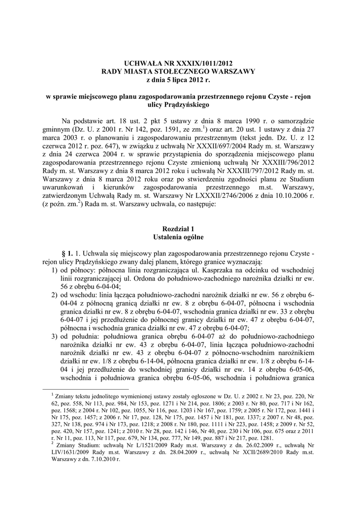 UCHWAŁA NR XXXIX/1011/2012 RADY MIASTA STOŁECZNEGO WARSZAWY z dnia 5 lipca 2012 r. w sprawie miejscowego planu zagospodarowania przestrzennego rejonu Czyste - rejon ulicy Prądzyńskiego Na podstawie art. 18 ust. 2 pkt 5 ustawy z dnia 8 marca 1990 r. o samorządzie gminnym (Dz. U. z 2001 r. Nr 142, poz. 1591, ze zm.1) oraz art. 20 ust. 1 ustawy z dnia 27 marca 2003 r. o planowaniu i zagospodarowaniu przestrzennym (tekst jedn. Dz. U. z 12 czerwca 2012 r. poz. 647), w związku z uchwałą Nr XXXII/697/2004 Rady m. st. Warszawy z dnia 24 czerwca 2004 r. w sprawie przystąpienia do sporządzenia miejscowego planu zagospodarowania przestrzennego rejonu Czyste zmienioną uchwałą Nr XXXIII/796/2012 Rady m. st. Warszawy z dnia 8 marca 2012 roku i uchwałą Nr XXXIII/797/2012 Rady m. st. Warszawy z dnia 8 marca 2012 roku oraz po stwierdzeniu zgodności planu ze Studium uwarunkowań i kierunków zagospodarowania przestrzennego m.st. Warszawy, zatwierdzonym Uchwałą Rady m. st. Warszawy Nr LXXXII/2746/2006 z dnia 10.10.2006 r. (z poźn. zm.2) Rada m. st. Warszawy uchwala, co następuje: Rozdział 1 Ustalenia ogólne § 1. 1. Uchwala się miejscowy plan zagospodarowania przestrzennego rejonu Czyste rejon ulicy Prądzyńskiego zwany dalej planem, którego granice wyznaczają: 1) od północy: północna linia rozgraniczająca ul. Kasprzaka na odcinku od wschodniej linii rozgraniczającej ul. Ordona do południowo-zachodniego narożnika działki nr ew. 56 z obrębu 6-04-04; 2) od wschodu: linia łącząca południowo-zachodni narożnik działki nr ew. 56 z obrębu 604-04 z północną granicą działki nr ew. 8 z obrębu 6-04-07, północna i wschodnia granica działki nr ew. 8 z obrębu 6-04-07, wschodnia granica działki nr ew. 33 z obrębu 6-04-07 i jej przedłużenie do północnej granicy działki nr ew. 47 z obrębu 6-04-07, północna i wschodnia granica działki nr ew. 47 z obrębu 6-04-07; 3) od południa: południowa granica obrębu 6-04-07 aż do południowo-zachodniego narożnika działki nr ew. 43 z obrębu 6-04-07, linia łącząca południowo-zachodni narożnik działki nr ew. 43 z obrębu 6-04-07 z północno-wschodnim narożnikiem działki nr ew. 1/8 z obrębu 6-14-04, północna granica działki nr ew. 1/8 z obrębu 6-1404 i jej przedłużenie do wschodniej granicy działki nr ew. 14 z obrębu 6-05-06, wschodnia i południowa granica obrębu 6-05-06, wschodnia i południowa granica 1 Zmiany tekstu jednolitego wymienionej ustawy zostały ogłoszone w Dz. U. z 2002 r. Nr 23, poz. 220, Nr 62, poz. 558, Nr 113, poz. 984, Nr 153, poz. 1271 i Nr 214, poz. 1806; z 2003 r. Nr 80, poz. 717 i Nr 162, poz. 1568; z 2004 r. Nr 102, poz. 1055, Nr 116, poz. 1203 i Nr 167, poz. 1759; z 2005 r. Nr 172, poz. 1441 i Nr 175, poz. 1457; z 2006 r. Nr 17, poz. 128, Nr 175, poz. 1457 i Nr 181, poz. 1337; z 2007 r. Nr 48, poz. 327, Nr 138, poz. 974 i Nr 173, poz. 1218; z 2008 r. Nr 180, poz. 1111 i Nr 223, poz. 1458; z 2009 r. Nr 52, poz. 420, Nr 157, poz. 1241; z 2010 r. Nr 28, poz. 142 i 146, Nr 40, poz. 230 i Nr 106, poz. 675 oraz z 2011 r. Nr 11, poz. 113, Nr 117, poz. 679, Nr 134, poz. 777, Nr 149, poz. 887 i Nr 217, poz. 1281. 2 Zmiany Studium: uchwałą Nr L/1521/2009 Rady m.st. Warszawy z dn. 26.02.2009 r., uchwałą Nr LIV/1631/2009 Rady m.st. Warszawy z dn. 28.04.2009 r., uchwałą Nr XCII/2689/2010 Rady m.st. Warszawy z dn. 7.10.2010 r. działki nr ew. 2 z obrębu 6-14-04, południowa i zachodnia granica działki nr ew. 67 z obrębu 6-14-03, południowa granica obrębu 6-05-05 aż do przedłużenia wschodniej granicy działki nr ew. 29/6 do południowej granicy działki nr ew. 30 z obrębu 6-05-05; 4) od zachodu: przedłużenie wschodniej granicy działki nr ew. 29/6 do południowej granicy działki nr ew. 30 z obrębu 6-05-05, wschodnia i północna granica działki nr ew. 29/6 z obrębu 6-05-05, północna granica działki nr ew. 29/7 z obrębu 6-05-05, wschodnia linia rozgraniczająca ul. Ordona do północnej linii rozgraniczającej ul. Kasprzaka. 2. Granice obszaru planu, o których mowa w ust. 1 pokazano na rysunku planu sporządzonym w skali 1:1000, stanowiącym załącznik nr 1 do niniejszej uchwały. 3. Załącznikami nr 2 i 3 do planu są: załącznik nr 2 – rozstrzygnięcia o sposobie rozpatrzenia uwag do projektu planu, załącznik nr 3 – rozstrzygnięcia o sposobie realizacji, zapisanych w planie, inwestycji z zakresu infrastruktury technicznej, które należą do zadań własnych gminy, oraz zasadach ich finansowania, zgodnie z przepisami o finansach publicznych. § 2. 1. Ilekroć w dalszych przepisach uchwały jest mowa o: 1) uchwale – należy przez to rozumieć niniejszą uchwałę, o ile z treści przepisu nie wynika inaczej; 2) rysunku planu – należy przez to rozumieć rysunek planu na mapach w skali 1:1000, stanowiący załącznik graficzny do uchwały; 3) przepisach szczególnych lub odrębnych - należy przez to rozumieć inne przepisy poza ustawą o planowaniu i zagospodarowaniu przestrzennym; 4) obszarze planu – należy przez to rozumieć obszar objęty planem w granicach określonych w § 1 ust. 1 oraz na rysunku planu; 5) terenie - należy przez to rozumieć fragment obszaru planu o określonym przeznaczeniu i zasadach zagospodarowania, wydzielony na rysunku planu liniami rozgraniczającymi; 6) zabudowie – należy przez to rozumieć budynki istniejące i/lub projektowane; 7) działce budowlanej – należy przez to rozumieć nieruchomość gruntową lub działkę gruntu, której wielkość, cechy geometryczne, dostęp do drogi publicznej oraz wyposażenie w urządzenia infrastruktury technicznej spełniają wymogi realizacji obiektów budowlanych wynikające z odrębnych przepisów i aktów prawa miejscowego; 8) działce inwestycyjnej – należy przez to rozumieć część lub całość terenu objętą jedną decyzją administracyjną o pozwoleniu na budowę; 9) przeznaczeniu podstawowym – należy przez to rozumieć ustalone w planie przeznaczenie prze