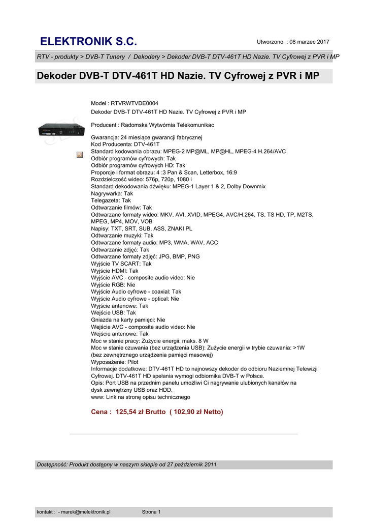 ELEKTRONIK S.C. Utworzono : 08 marzec 2017 RTV - produkty > DVB-T Tunery / Dekodery > Dekoder DVB-T DTV-461T HD Nazie. TV Cyfrowej z PVR i MP Dekoder DVB-T DTV-461T HD Nazie. TV Cyfrowej z PVR i MP Model : RTVRWTVDE0004 Dekoder DVB-T DTV-461T HD Nazie. TV Cyfrowej z PVR i MP Producent : Radomska Wytwórnia Telekomunikac Gwarancja: 24 miesiące gwarancji fabrycznej Kod Producenta: DTV-461T Standard kodowania obrazu: MPEG-2 MP@ML, MP@HL, MPEG-4 H.264/AVC Odbiór programów cyfrowych: Tak Odbiór programów cyfrowych HD: Tak Proporcje i format obrazu: 4 :3 Pan & Scan, Letterbox, 16:9 Rozdzielczość wideo: 576p, 720p, 1080 i Standard dekodowania dźwięku: MPEG-1 Layer 1 & 2, Dolby Downmix Nagrywarka: Tak Telegazeta: Tak Odtwarzanie filmów: Tak Odtwarzane formaty wideo: MKV, AVI, XVID, MPEG4, AVC/H.264, TS, TS HD, TP, M2TS, MPEG, MP4, MOV, VOB Napisy: TXT, SRT, SUB, ASS, ZNAKI PL Odtwarzanie muzyki: Tak Odtwarzane formaty audio: MP3, WMA, WAV, ACC Odtwarzanie zdjęć: Tak Odtwarzane formaty zdjęć: JPG, BMP, PNG Wyjście TV SCART: Tak Wyjście HDMI: Tak Wyjście AVC - composite audio video: Nie Wyjście RGB: Nie Wyjście Audio cyfrowe - coaxial: Tak Wyjście Audio cyfrowe - optical: Nie Wyjście antenowe: Tak Wejście USB: Tak Gniazda na karty pamięci: Nie Wejście AVC - composite audio video: Nie Wejście antenowe: Tak Moc w stanie pracy: Zużycie energii: maks. 8 W Moc w stanie czuwania (bez urządzenia USB): Zużycie energii w trybie czuwania: >1W (bez zewnętrznego urządzenia pamięci masowej) Wyposażenie: Pilot Informacje dodatkowe: DTV-461T HD to najnowszy dekoder do odbioru Naziemnej Telewizji Cyfrowej. DTV-461T HD spełania wymogi odbiornika DVB-T w Polsce. Opis: Port USB na przednim panelu umożliwi Ci nagrywanie ulubionych kanałów na dysk zewnętrzny USB oraz HDD. www: Link na stronę opisu technicznego Cena : 125,54 zł Brutto ( 102,90 zł Netto) Dostępność: Produkt dostępny w naszym sklepie od 27 październik 2011 kontakt : - [email protected] Strona 1