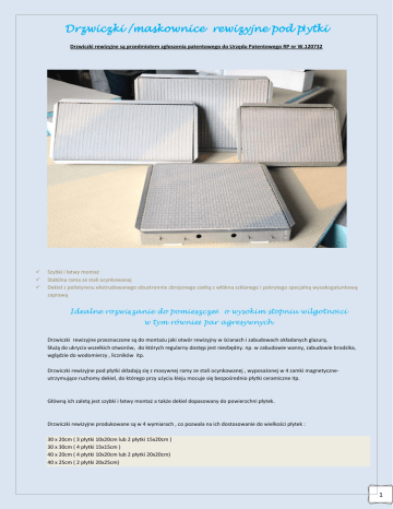 Drzwiczki /maskownice rewizyjne pod płytki Drzwiczki rewizyjne są przedmiotem zgłoszenia patentowego do Urzędu Patentowego RP nr W.120732 Szybki i łatwy montaż Stabilna rama ze stali ocynkowanej Dekiel z polistyrenu ekstrudowanego obustronnie zbrojonego siatką z włókna szklanego i pokrytego specjalną wysokogatunkową zaprawą Idealne rozwiązanie do pomieszczeń o wysokim stopniu wilgotności w tym również par agresywnych Drzwiczki rewizyjne przeznaczone są do montażu jaki otwór rewizyjny w ścianach i zabudowach okładanych glazurą. Służą do ukrycia wszelkich otworów, do których regularny dostęp jest niezbędny. np. w zabudowie wanny, zabudowie brodzika, wglądzie do wodomierzy , liczników itp. Drzwiczki rewizyjne pod płytki składają się z masywnej ramy ze stali ocynkowanej , wyposażonej w 4 zamki magnetyczneutrzymujące ruchomy dekiel, do którego przy użyciu kleju mocuje się bezpośrednio płytki ceramiczne itp. Główną ich zaletą jest szybki i łatwy montaż a także dekiel dopasowany do powierzchni płytek. Drzwiczki rewizyjne produkowane są w 4 wymiarach , co pozwala na ich dostosowanie do wielkości płytek : 30 x 20cm ( 3 płytki 10x20cm lub 2 płytki 15x20cm ) 30 x 30cm ( 4 płytki 15x15cm ) 40 x 20cm ( 4 płytki 10x20cm lub 2 płytki 20x20cm) 40 x 25cm ( 2 płytki 20x25cm) 1 P.P.U.H. „EUKLIDES” Małgorzata Kordys-Homa Mystków 354 , 33-334 Kamionka Wielka Tel./ fax: 0048 (18) 548-62-12 tel.kom.: 0048 692-901-315 e-mail: [email protected] 2