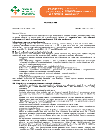 OGŁOSZENIE Nasz znak: CAZ.SZ.551.1.1.2014 Brzesko, dnia 13.03.2014 r. Szanowni Państwo, W odpowiedzi na wniosek osoby uprawnionej o skierowanie na szkolenie wskazane, Powiatowy Urząd Pracy w Brzesku zaprasza do złożenia oferty na przeprowadzenie szkolenia pn. „Spawanie blach i rur spoinami pachwinowymi i blach spoinami czołowymi metodą TIG - stal nierdzewna”. I. Podstawa prawna organizacji szkoleń: Zasady organizacji szkoleń dla osób bezrobotnych określają przepisy Ustawy z dnia 20 kwietnia 2004 r. o promocji zatrudnienia i instytucjach rynku pracy (Dz. U. z 2013 r., poz. 674 z późn. zm.) oraz Rozporządzenia Ministra Pracy i Polityki Społecznej z dnia 14 września 2010 r. w sprawie standardów i warunków prowadzenia usług rynku pracy (Dz. U. z dnia 28 września 2010 r. Nr 177 poz. 1193 z późn. zm.). II. Zasady wyboru i oceny instytucji szkoleniowej: W celu zapewnienia konkurencyjności oraz najwyższej jakości szkolenia przy dokonywaniu wyboru instytucji szkoleniowej, której zostanie zlecone przeprowadzone szkolenia, powiatowy urząd pracy uwzględnia: • dostosowanie zakresu szkolenia odpowiednio do identyfikowanego na rynku pracy zapotrzebowania na kwalifikacje • jakość oferowanego programu szkolenia, w tym wykorzystanie standardów kwalifikacji zawodowych i modułowych programów szkoleń zawodowych, dostępnych w bazach danych, o których mowa w art. 4 ust. 1 pkt 7 lit. e przytaczanej wyżej ustawy • certyfikaty jakości usług posiadane przez instytucję szkoleniową • dostosowanie kwalifikacji i doświadczenia kadry dydaktycznej do zakresu szkolenia • dostosowanie wyposażenia dydaktycznego i pomieszczeń do potrzeb szkolenia, z uwzględnieniem bezpiecznych i higienicznych warunków realizacji szkolenia • rodzaj dokumentów potwierdzających ukończenie szkolenia i uzyskanie kwalifikacji • koszty szkolenia • sposób organizacji zajęć praktycznych określonych w programie szkolenia. Przy wyborze Wykonawcy do realizacji szkolenia Urząd zastosuje „Kryteria wyboru instytucji szkoleniowej” , stanowiące Załącznik Nr 2 do niniejszego pisma. III. Warunki oraz wymagania dotyczące realizacji szkolenia: • Przedmiotem zamówienia jest przeprowadzenie szkolenia pn. „Spawanie blach i rur spoinami pachwinowymi i blach spoinami czołowymi metodą TIG - stal nierdzewna” dla 1 osoby bezrobotnej. • Szkolenie finansowane jest ze środków publicznych. • Instytucja szkoleniowa winna posiadać wpis do Rejestru Instytucji Szkoleniowych prowadzonego przez wojewódzki urząd pracy właściwy ze względu na siedzibę instytucji szkoleniowej, wpis musi być aktualny na 2014 r. • Szkolenie musi zostać zrealizowane zgodnie z aktualnymi wytycznymi Instytutu Spawalnictwa w Gliwicach. • Szkolenie winno obejmować 206 h (w tym: zajęcia teoretyczne - 20 h, zajęcia praktyczne - 170 h, egzaminy - 16 h. /Osoba kierowana na szkolenie posiada uprawnienia spawania blach i rur spoinami pachwinowymi metodą TIG i MAG (1.1, 1.2, 1.4 - stal zwykła)/. • Przewidywany termin realizacji: rozpoczęcie szkolenia nie wcześniej niż 14.04.2014 r. • Miejsce przeprowadzenia szkolenia: miejscowość w promieniu 60 km od Brzeska, z dobrym, bezpośrednim połączeniem komunikacyjnym. • Zajęcia winny odbywać się od poniedziałku do piątku, z wyjątkiem świąt i dni ustawowo wolnych od pracy, zgodnie z harmonogramem zajęć. Plan nauczania musi obejmować przeciętnie nie mniej niż 25 godzin zegarowych w tygodniu, jeżeli przepisy nie stanowią inaczej. Za godzinę zegarową uznaje się 45 minut zajęć edukacyjnych oraz 15 minut przerwy. Zajęcia szkoleniowe nie mogą trwać dłużej niż 8 godzin zegarowych dziennie. • Nie dopuszcza się prowadzenia zajęć w formule kształcenia na odległość. • Szkolenie musi zakończyć się wydaniem zaświadczenia lub innego dokumentu potwierdzającego ukończenie szkolenia i uzyskanie kwalifikacji, zgodnego z Rozporządzeniem Ministra Pracy i Polityki Społecznej z dnia 14 września 2010 r. w sprawie standardów i warunków prowadzenia usług rynku pracy (Dz. U. z 2010 r., Nr 177, poz. 1193 z późn. zm.), o ile przepisy odrębne nie stanowią inaczej. Zgodnie z § 75 ust. 3 ww. Rozporządzenia wydany dokument winien zawierać: numer z rejestru, imię i nazwisko oraz PESEL uczestnika szkolenia, a w przypadku cudzoziemca numer dokumentu stwierdzającego • • • • tożsamość, nazwę instytucji szkoleniowej przeprowadzającej szkolenie, formę i nazwę szkolenia, okres trwania szkolenia, miejsce i datę wydania zaświadczenia lub innego dokumentu potwierdzającego ukończenie szkolenia i uzyskanie kwalifikacji, tematy i wymiar godzin zajęć edukacyjnych, podpis osoby upoważnionej przez instytucję szkoleniową przeprowadzającą szkolenie. W przypadku wydania zaświadczenia o ukończeniu kursu, określonego w § 18 ust. 2 (Załącznik Nr 5) rozporządzenia Ministra Edukacji Narodowej z dnia 11 stycznia 2012 r. w sprawie kształcenia ustawicznego w formach pozaszkolnych, konieczne jest załączenie suplementu zawierającego informacje dotyczące okresu trwania szkolenia, tematyki i wymiaru godzin zajęć edukacyjnych oraz numeru z rejestru zaświadczenia, do którego suplement jest dodatkiem, wraz z podpisem osoby upoważnionej do reprezentowania wykonawcy. W sytuacji, gdy uczestnik szkolenia nie zaliczy pozytywnie egzaminu będącego warunkiem uzyskania dokumentu na podstawie odrębnych przepisów, Wykonawca winien wydać temu uczestnikowi zaświadczenie lub inny dokument potwierdzający ukończenie szkolenia zgodny z przytoczonym wyżej rozporządzeniem w sprawie standardów. Absolwent otrzymuje po zdanym egzaminie świadectwo egzaminu kwalifikacyjnego spawacza oraz książkę spawacza wydane przez Instytut Spawalnictwa w Gliwicach. Wykonawca ma obowiązek ubezpieczyć od następstw nieszczęśliwych wypadków powstałych w związku ze szkoleniem oraz w drodze do miejsca szkolenia i z powrotem : - osob