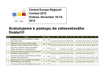16-18 Central Europe Regional Contest 2012 Kraków, November 16-18, 2012 , 2012 Gratulujeme k postupu do celosvetového finále!!!! Rank 1 Name Comenius University (Tomáš Belan, Vladimír Boža, Peter Fulla) Score Time 10 A B C D E F G H I J K 1 5 1 3 1 1 1 1 1 1 1205 (0:45) (4:42) (0:14) (1:58) (0:36) (2:46) (0:19) (2:24) (1:15) (3:03) 2 Jagiellonian University in Krakow (Jakub Adamek, Grzegorz Guśpiel, Jonasz Pamuła) 10 1304 2 2 1 1 1 1 1 1 2 2 (0:51) (3:38) (0:25) (3:02) (1:46) (2:43) (0:16) (1:10) (1:54) (4:35) 3 University of Warsaw (Tomasz Kociumaka, Marcin Andrychowicz, Maciej Klimek) 9 1012 1 (0:16) 4 University of Warsaw (Jakub Oćwieja, Mirosław Michalski, Jarosław Błasiok) 9 1124 1 1 1 1 2 2 1 2 3 (0:45) (2:12) (0:59) (3:02) (2:33) (4:45) (0:13) (1:35) (0:57) 5 University of Wroclaw (Anna Piekarska, Damian Straszak, Jakub Tarnawski) 9 1233 4 (1:17) - 6 Jagiellonian University in Krakow (Piotr Bejda, Michał Sapalski, Igor Adamski) 8 887 1 (0:39) 25 7 University of Warsaw (Dawid Dąbrowski, Adam 8 972 2 - 3 1 1 2 1 1 3 2 1 (0:39) (2:11) (1:40) (4:06) (0:11) (2:30) (0:54) (3:01) - 1 2 1 2 1 1 3 1 (0:16) (3:17) (1:04) (3:57) (0:24) (2:21) (1:03) (4:30) 1 3 1 2 1 7 2 (0:14) (2:19) (1:02) (1:33) (0:20) (4:49) (0:28) 1 2 1 - 2 1 - 2 2 1 Rank Name Karczmarz, Adrian Jaskółka) Score Time A (0:43) B C D E F G H (0:22) (3:56) (1:56) (2:10) (0:13) I J K (1:01) (4:27) 8 University of Zagreb (Ivan Katanic, Stjepan Glavina, Goran Žužić) 8 987 3 (0:26) - 2 4 1 5 1 (0:43) (1:18) (1:25) (3:40) (0:08) - 1 4 (1:00) (3:25) 9 Jagiellonian University in Krakow (Jacek Szmigiel, Michał Zgliczyński, Wojciech Łopata) 7 791 2 (1:22) - 2 2 1 3 1 (0:53) (2:04) (1:42) (4:04) (0:41) - 1 (0:43) 10 University of Wroclaw (Bartłomiej Dudek, Maciej Dulęba, Mateusz Gołębiewski) 7 845 1 (1:11) 5 1 5 1 (0:44) (4:33) (2:43) - 1 (0:06) - 2 1 (0:31) (2:34) 11 University of Warsaw (Wojciech Nadara, Grzegorz Prusak, Marcin Smulewicz ) 7 999 3 (1:51) - 3 1 4 (1:05) (3:52) (2:59) - 1 3 3 (0:10) (1:12) (1:47) 4 12 University of Wroclaw (Paweł Michalak, Artur Kraska, Krzysztof Pieprzak) 7 1109 2 (1:07) - 4 1 3 (0:46) (2:28) (3:28) 4 1 9 1 (0:14) (4:23) (1:20) - 13 Jagiellonian University in Krakow (Wojciech Lis, Andrzej Dorobisz, Kamil Sałaś) 6 569 1 (0:43) - 1 (0:24) 14 Charles University in Prague (Jakub Zíka, Filip Hlásek, Lukáš Folwarczný) 6 586 1 (0:28) - 1 6 1 (0:13) (4:38) (1:16) - 15 Jagiellonian University in Krakow (Wiktor Kuropatwa, Michał Bejda, Dawid Pustułka) 6 586 1 (2:05) - 1 3 2 (0:14) (2:58) (1:53) 16 University of Zagreb (Goran Gasic, Filip Pavetic, Bruno Rahle) 6 637 1 (0:51) - 1 (0:34) 6 1 (0:43) 6 6 1 713 (1:03) - 17 Budapest University of Technology and Economics (Gergely Gábor Nagy, Szilveszter Szebeni, István Lám) 18 University of Wroclaw (Karol Konaszyński, Wiktor Janas, Adam Kunysz) 6 719 3 (1:38) - 1 2 4 (0:20) (1:52) (4:20) 19 University of Zagreb (Gustav Matula, Ivica Kicic, Adrian Satja Kurdija) 6 775 3 (1:10) 1 1 2 (0:31) (4:59) 5 3 1 1 (2:19) (3:20) (0:28) - - 2 (1:13) - 1 (0:19) 10 2 (0:50) - - 1 (0:21) - 1 (1:12) 1 3 (2:41) 1 1 1 2 (0:11) (3:44) (1:33) - 1 (2:18) - 1 (0:22) - 3 1 (1:49) (4:56) 10 1 (0:11) - 1 (1:35) - 2 2 1 (0:11) (2:53) (1:28) - 4 - - Rank 20 Name University of Warsaw (Łukasz Marecik, Kamil Yurtsever, Piotr Smulewicz) Score Time 6 A 1 806 (0:39) B 2 C 1 (1:03) D - E F 2 (2:19) G - H 1 (0:17) I - J K 4 2 (2:49) (4:35) 10 AGH University of Science and Technology (Szymon Gut, Martyna Wałaszewska, Adam Obuchowicz) 2 (1:20) 3 (3:57) - 1 (0:20) - 6 3 814 (1:17) - 21 1 1 (0:57) (4:01) 22 University of Warsaw (Tom Macieszczak , Adam Nieżurawski, Bartłomiej Gajewski) 6 859 1 (1:27) - 1 5 4 (1:32) (4:49) (3:13) - 1 (0:14) 2 1 (0:41) 23 Eötvös Loránd University (Gábor Gévay, Ferenc Bencs, Péter Englert) 6 880 4 (2:59) - 1 (0:58) - - - 2 1 1 2 (1:14) (2:36) (0:31) (4:40) 24 Poznan University of Technology (Aleksander Kędzierski, Piotr Żurkowski, Konrad Baumgart) 6 892 1 (1:19) - 1 (0:56) - 2 (3:53) - 1 2 4 (0:22) (4:29) (2:10) 1 25 Jagiellonian University in Krakow (Bartosz Szabucki, Michał Feret, Dominik Dudzik) 6 1058 2 (1:42) - 1 5 (0:52) (4:43) - - 3 1 3 (0:23) (4:37) (2:19) - 26 AGH University of Science and Technology (Maciej Kruk, Paweł Lipski, Miłosz Łakomy) 6 1239 2 (2:38) 1 1 5 2 (1:08) (4:37) (4:06) - 1 (0:06) - 8 (3:42) - 27 University of Wroclaw (Piotr Jagiełło, Tadeusz Dul, Grzegorz Głuch) 5 362 1 (1:06) - 1 (0:42) 17 2 (2:50) - 1 (0:13) - 1 (0:50) - 28 Masaryk University (Jaromír Kala, Tomáš Lamser, David Klaska) 5 491 1 (1:52) - 1 (0:43) - 3 (3:10) - 1 (0:11) - 2 (1:13) 1 29 Charles University in Prague (Karel Tesař, Jan Bok, Vlastimil Dort) 5 515 1 (2:31) - 1 (0:33) - 4 (3:05) - 1 (0:19) - 1 (1:05) - 30 Comenius University (Marián Horňák, Michal Anderle, Ján Hozza) 5 550 2 (2:18) - 1 (1:22) 1 3 (3:38) - 1 (0:08) - 1 (0:42) - 1 (0:44) - 2 (3:03) - 1 (0:20) - 2 (3:54) - 5 1 625 (1:40) - 31 Budapest University of Technology and Economics (Zoltán Mártonka, Tamás Peregi, Tamás Berghammer) - 7 - Rank 32 Name Adam Mickiewicz University (Lukasz Kalinowski, Andrzej Ruminski, Dawid Jewko) Score Time 5 A 2 815 (3:43) B - C D 1 3 (2:14) (2:13) E 6 F - G 3 H 2 (0:44) I - J 2 (2:59) K - 2 (4:44) - 1 (0:34) - 10 - 33 University of Ljubljana (Žiga Ham, Matej Aleksandrov, Nace Hudobivnik) 4 432 1 (1:09) - 1 (0:24) - 34 University of Ljubljana (Žiga Gosar, Jure Slak, Maks Kolman) 4 444 2 (2:05) - 1 (1:01) - 3 - - 1 (0:33) - 2 (3:03) - 35 University of Wroclaw (Konrad Cichy, Wojciech Kozaczewski, Michał Łowicki) 4 525 3 (1:47) - 3 (2:04) - 4 - - 2 (0:21) - 2 (2:31) - 36 Adam Mickiewicz University (Piotr Zdanowicz, Miłosz Makowski, Szymon Kałasz) 4 625 1 (2:56) - 3 (1:54) 2 - - - 1 (0:21) - 3 (3:53) - 37 Czech Technical University in Prague (Jérémie Dumas, Erik Derner, Vojtěch Cvrček) 4 639 2 (1:04) - 4 (3:37) 6 2 - - 1 (0:38) - 2 (3:39) - 38 Eötvös Loránd University (András Mészáros, Ágoston Weisz, Attila J