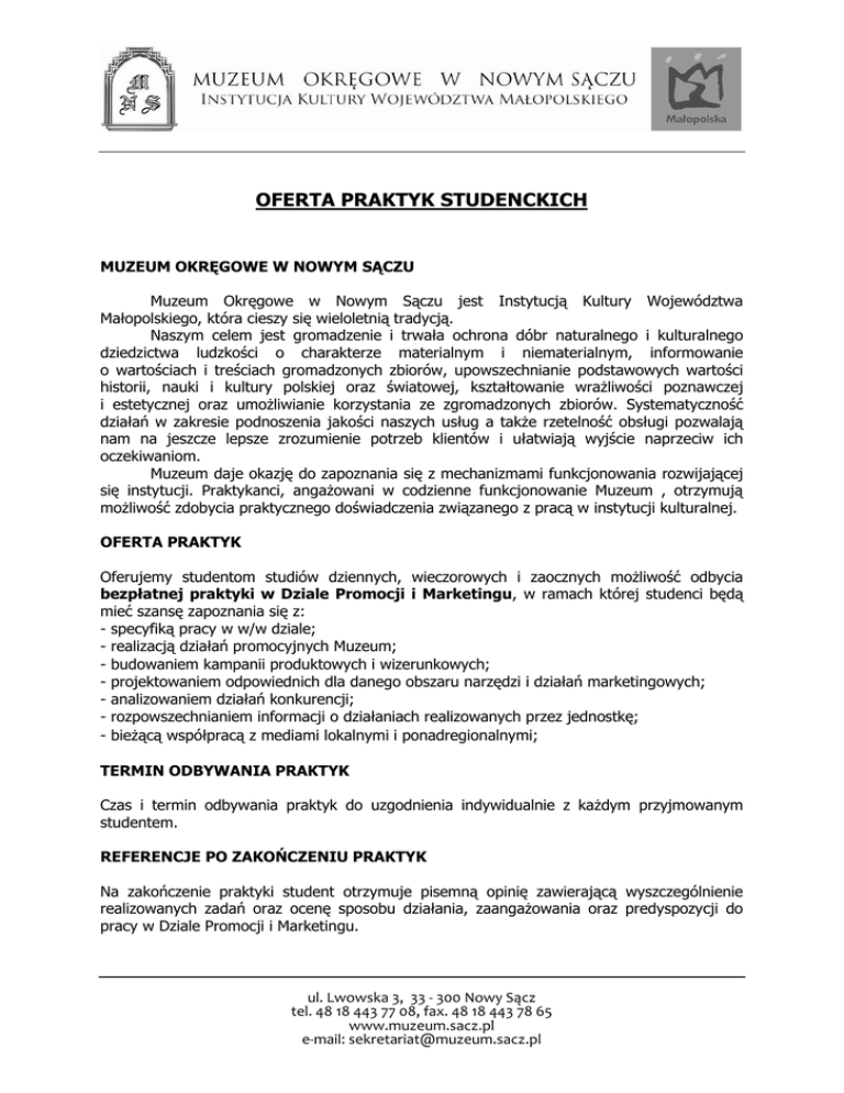 OFERTA PRAKTYK STUDENCKICH MUZEUM OKRĘGOWE W NOWYM SĄCZU Muzeum Okręgowe w Nowym Sączu jest Instytucją Kultury Województwa Małopolskiego, która cieszy się wieloletnią tradycją. Naszym celem jest gromadzenie i trwała ochrona dóbr naturalnego i kulturalnego dziedzictwa ludzkości o charakterze materialnym i niematerialnym, informowanie o wartościach i treściach gromadzonych zbiorów, upowszechnianie podstawowych wartości historii, nauki i kultury polskiej oraz światowej, kształtowanie wrażliwości poznawczej i estetycznej oraz umożliwianie korzystania ze zgromadzonych zbiorów. Systematyczność działań w zakresie podnoszenia jakości naszych usług a także rzetelność obsługi pozwalają nam na jeszcze lepsze zrozumienie potrzeb klientów i ułatwiają wyjście naprzeciw ich oczekiwaniom. Muzeum daje okazję do zapoznania się z mechanizmami funkcjonowania rozwijającej się instytucji. Praktykanci, angażowani w codzienne funkcjonowanie Muzeum , otrzymują możliwość zdobycia praktycznego doświadczenia związanego z pracą w instytucji kulturalnej. OFERTA PRAKTYK Oferujemy studentom studiów dziennych, wieczorowych i zaocznych możliwość odbycia bezpłatnej praktyki w Dziale Promocji i Marketingu, w ramach której studenci będą mieć szansę zapoznania się z: - specyfiką pracy w w/w dziale; - realizacją działań promocyjnych Muzeum; - budowaniem kampanii produktowych i wizerunkowych; - projektowaniem odpowiednich dla danego obszaru narzędzi i działań marketingowych; - analizowaniem działań konkurencji; - rozpowszechnianiem informacji o działaniach realizowanych przez jednostkę; - bieżącą współpracą z mediami lokalnymi i ponadregionalnymi; TERMIN ODBYWANIA PRAKTYK Czas i termin odbywania praktyk do uzgodnienia indywidualnie z każdym przyjmowanym studentem. REFERENCJE PO ZAKOŃCZENIU PRAKTYK Na zakończenie praktyki student otrzymuje pisemną opinię zawierającą wyszczególnienie realizowanych zadań oraz ocenę sposobu działania, zaangażowania oraz predyspozycji do pracy w Dziale Promocji i Marketingu. ul. Lwowska 3, 33 - 300 Nowy Sącz tel. 48 18 443 77 08, fax. 48 18 443 78 65 www.muzeum.sacz.pl e-mail: [email protected] REKRUTACJA PRAKTYKANTÓW Osoby zainteresowane odbyciem praktyk w Muzeum Okręgowym w Nowym Sączu powinny złożyć (przesłać) aplikację zawierającą CV oraz list motywacyjny. KONTAKT W SPRAWIE PRAKTYK Małgorzata Łukasik-Kogut Dział Promocji i Marketingu tel.: 18 443 77 08, wew. 119 fax: 18 443 78 65 kom.: 0 723 454 384 e-mail: [email protected] Muzeum Okręgowe w Nowym Sączu Instytucja Kultury Województwa Małopolskiego ul. Lwowska 3 33-300 Nowy Sącz www.muzeum.sacz.pl ul. Lwowska 3, 33 - 300 Nowy Sącz tel. 48 18 443 77 08, fax. 48 18 443 78 65 www.muzeum.sacz.pl e-mail: [email protected]