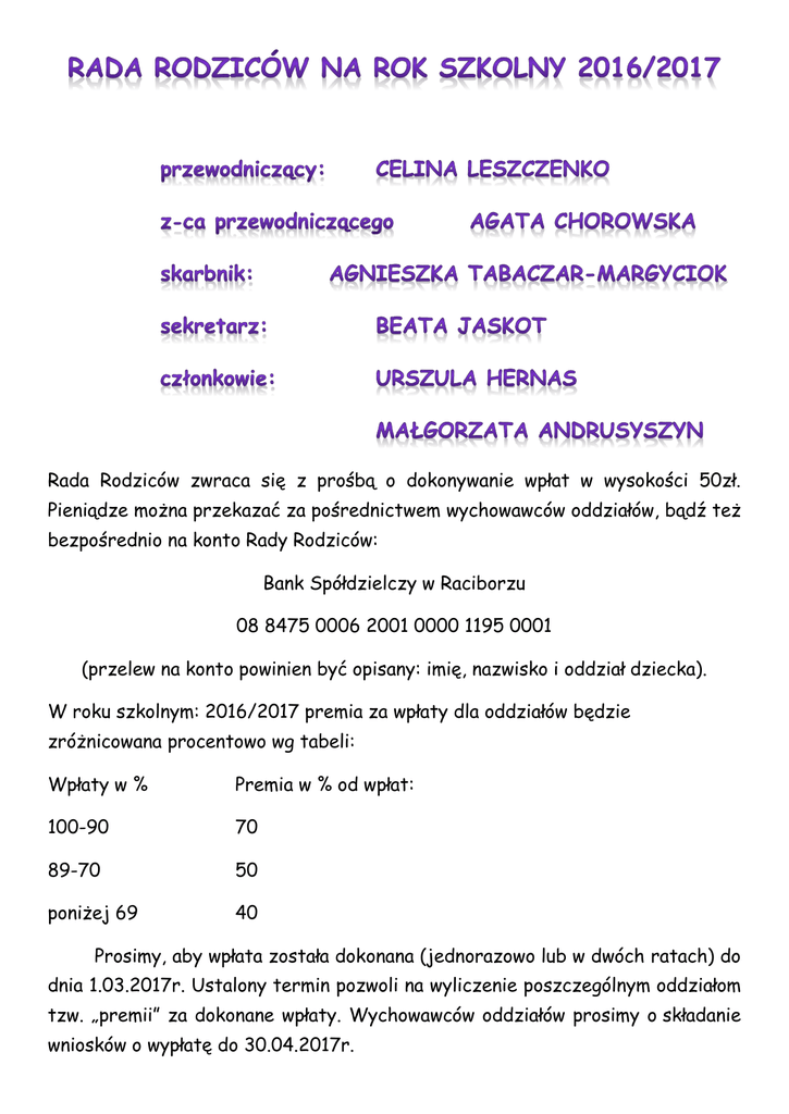 Rada Rodziców zwraca się z prośbą o dokonywanie wpłat w wysokości 50zł. Pieniądze można przekazać za pośrednictwem wychowawców oddziałów, bądź też bezpośrednio na konto Rady Rodziców: Bank Spółdzielczy w Raciborzu 08 8475 0006 2001 0000 1195 0001 (przelew na konto powinien być opisany: imię, nazwisko i oddział dziecka). W roku szkolnym: 2016/2017 premia za wpłaty dla oddziałów będzie zróżnicowana procentowo wg tabeli: Wpłaty w % Premia w % od wpłat: 100-90 70 89-70 50 poniżej 69 40 Prosimy, aby wpłata została dokonana (jednorazowo lub w dwóch ratach) do dnia 1.03.2017r. Ustalony termin pozwoli na wyliczenie poszczególnym oddziałom tzw. „premii” za dokonane wpłaty. Wychowawców oddziałów prosimy o składanie wniosków o wypłatę do 30.04.2017r.