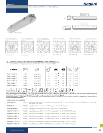 MAH/A-PS Oprawa pyłoszczelna / Dustproof lighting fitting MAH-1118/A-PS – 657 MAH-1136/A-PS – 1265 MAH-1158/A-PS – 1565 106 100 MAH-1218 – 657 MAH-1236 – 1265 MAH-1258 – 1565 106 150 MAH/A-PS krzywa rozsyłu światłości / curve of intensity distribution η = 72% 135° krzywa rozsyłu światłości / curve of intensity distribution η = 86% 135° 135° 120° 120° krzywa rozsyłu światłości / curve of intensity distribution η = 70% krzywa rozsyłu światłości / curve of intensity distribution η = 80% 135° 135° 120° 120° 135° 135° 120° 120° 135° 135° 120° 120° 120 135° 135° 120° 120° 135° 150 120 120 100 80 120° krzywa rozsyłu światłości / curve of intensity distribution η = 73% krzywa rozsyłu światłości / curve of intensity distribution η = 74% 120 90 80 60 125 100 100 75 60 40 150 125 120° 80 75 50 50 105° 105° 105° 105° 105° 105° 105° 105° 105° 105° 90° 90° 90° 90° 90° 90° 90° 90° 90° 90° 90° 90° 75° 75° 75° 75° 75° 75° 75° 75° 75° 75° 75° 75° 60° 60° 60° 60° 60° 60° 60° 60° 60° 60° 60° 45° 45° 45° 45° 45° 45° 45° 45° 45° 45° 105° cd/klm cd/klm 45° 30° C0-C180 15° 0° 15° 30° C90-C270 30° C0-C180 MAH-1118/A-PS cd/klm 15° 0° 15° C90-C270 30° cd/klm 30° C0-C180 MAH-1136/A-PS 15° 0° 15° 30° cd/klm 30° C90-C270 C0-C180 15° 0° 15° 30° C90-C270 60° cd/klm 30° C0-C180 MAH-1218/A-PS MAH-1158/A-PS 105° 15° 0° 15° C90-C270 30° 45° 30° C0-C180 MAH-1236/A-PS 15° 0° 15° 30° C90-C270 MAH-1258/A-PS podstawa: tworzywo ABS / zatrzaski: poliwęglan (PC) / klosz: polistyren (PS) base: ABS material / clips: polycarbonate (PC) / lampshade: polystyrene (PS) MAH-1118/A-PS 04510 szary / grey 18 VVG B2 1/-/10 MAH-1136/A-PS 04511 szary / grey 36 VVG B2 1/-/6 2150 MAH-1158/A-PS 04512 szary / grey 58 VVG B2 1/-/6 2810 MAH-1218/A-PS 04513 szary / grey 2 x 18 VVG B2 1/-/8 1810 MAH-1236/A-PS 04514 szary / grey 2 x 36 VVG B2 1/-/4 3410 MAH-1258/A-PS 04515 szary / grey 2 x 58 VVG B2 1/-/4 4700 220-240V~ 1450 50/60Hz 3 x 2,5 0,5 65 02 łatwy montaż oprawy do podłoża przy użyciu dołączonych zatrzaskowych uchwytów mocujących / w podstawie zamaskowany otwór, służący do zasilania przelotowego / uszczelniający dławik, służący do wprowadzenia przewodu zasilającego simple assembling of the fitting to the base using snap fastening holders (included) / masked hole in the base, to be used for through-feed supply system / sealing choke for feeder cable AKCESORIA / ACCESSORIES ROPE-NT 150 07870 linka stalowa (podwójna) do zawieszenia opraw serii MAH, 2 szt. w komplecie / steel cord (double) for hanging serii MAH, 2 pcs in set CL-MAH/A 72304 zapinka plastikowa do opraw MAH / plastic clips for MAH fittings CL-MAH/A-INOX 72308 zapinka metalowa do opraw MAH / metal clips for MAH fittings GL-MAH-1118/A-PS 72362 klosz PS do opraw MAH-1118/A-PS / lampshade PS for MAH-1118/A-PS fittings GL-MAH-1136/A-PS 72364 klosz PS do opraw MAH-1136/A-PS / lampshade PS for MAH-1136/A-PS fittings GL-MAH-1158/A-PS 72366 klosz PS do opraw MAH-1158/A-PS / lampshade PS for MAH-1158/A-PS fittings GL-MAH-1218/A-PS 72363 klosz PS do opraw MAH-1218/A-PS / lampshade PS for MAH-1218/A-PS fittings GL-MAH-1236/A-PS 72365 klosz PS do opraw MAH-1236/A-PS / lampshade PS for MAH-1236/A-PS fittings GL-MAH-1258/A-PS 72367 klosz PS do opraw MAH-1258/A-PS / lampshade PS for MAH-1258/A-PS fittings www.kanlux.com 59