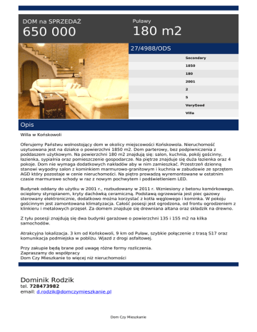Puławy DOM na SPRZEDAŻ 180 m2 650 000 27/4988/ODS Secondary 1850 180 2001 2 5 VeryGood Villa Opis Willa w Końskowoli Oferujemy Państwu wolnostojący dom w okolicy miejscowości Końskowola. Nieruchomość usytuowana jest na działce o powierzchni 1850 m2. Dom parterowy, bez podpiwniczenia z poddaszem użytkowym. Na powierzchni 180 m2 znajdują się: salon, kuchnia, pokój gościnny, łazienka, sypialnia oraz pomieszczenie gospodarcze. Na piętrze znajduje się duża łazienka oraz 4 pokoje. Dom nie wymaga dodatkowych nakładów aby w nim zamieszkać. Przestrzeń dzienną stanowi wygodny salon z kominkiem marmurowo-granitowym i kuchnia w zabudowie ze sprzętem AGD który pozostaje w cenie nieruchomości. Na piętro prowadzą wyremontowane w ostatnim czasie marmurowe schody w raz z nowym pochwytem i podświetleniem LED. Budynek oddany do użytku w 2001 r., rozbudowany w 2011 r. Wzniesiony z betonu komórkowego, ocieplony styropianem, kryty dachówką ceramiczną. Podstawą ogrzewania jest piec gazowy sterowany elektronicznie, dodatkowo można korzystać z kotła węglowego i kominka. W pokoju gościnnym jest zamontowana klimatyzacja. Całość posesji jest ogrodzona, od frontu ogrodzeniem z klinkieru i metalowych przęseł. Za domem znajduje się drewniana altana oraz składzik na drewno. Z tyłu posesji znajdują się dwa budynki garażowe o powierzchni 135 i 155 m2 na kilka samochodów. Atrakcyjna lokalizacja. 3 km od Końskowoli, 9 km od Puław, szybkie połączenie z trasą S17 oraz komunikacja podmiejska w pobliżu. Wjazd z drogi asfaltowej. Przy zakupie będą brane pod uwagę różne formy rozliczenia. Zapraszamy do współpracy Dom Czy Mieszkanie to więcej niż nieruchomości Dominik Rodzik tel. 728473982 email: [email protected] Dom Czy Mieszkanie Dom Czy Mieszkanie Powered by TCPDF (www.tcpdf.org)