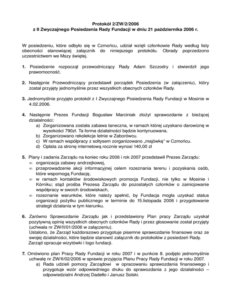 Protokół 2/ZW/2/2006 z II Zwyczajnego Posiedzenia Rady Fundacji w dniu 21 października 2006 r. W posiedzeniu, które odbyło się w Czmońcu, udział wzięli członkowie Rady według listy obecności stanowiącej załącznik do niniejszego protokółu. Obrady poprzedzono uczestnictwem we Mszy świętej. 1. Posiedzenie rozpoczął przewodniczący Rady Adam Szczodry i stwierdził jego prawomocność. 2. Następnie Przewodniczący przedstawił porządek Posiedzenia (w załączeniu), który został przyjęty jednomyślnie przez wszystkich obecnych członków Rady. 3. Jednomyślnie przyjęto protokół z I Zwyczajnego Posiedzenia Rady Fundacji w Mosinie w 4.02.2006. 4. Następnie Prezes Fundacji Bogusław Marciniak złożył sprawozdanie z bieżącej działalności: a) Zorganizowana została zabawa taneczna, w ramach której uzyskano darowiznę w wysokości 790zł. Ta forma działalności będzie kontynuowana. b) Zorganizowano rekolekcje letnie w Zaborówcu. c) W ramach współpracy z sołtysem zorganizowano „majówkę” w Czmońcu. d) Opłata za stronę internetową rocznie wynosi 140,00 zł 5. Plany i zadania Zarządu na koniec roku 2006 i rok 2007 przedstawił Prezes Zarządu: • organizacja zabawy andrzejkowej, • przeprowadzenie akcji informacyjnej celem rozeznania terenu i pozyskania osób, które wspomogą Fundację, • w ramach kontaktów środowiskowych promocja Fundacji, nie tylko w Mosinie i Kórniku; stąd prośba Prezesa Zarządu do pozostałych członków o zainicjowanie współpracy w swoich środowiskach, • rozeznanie warunków, które należy spełnić, by Fundacja mogła uzyskać status organizacji pożytku publicznego w terminie do 15.listopada 2006 i przygotowanie strategii działania w tym kierunku. 6. Zarówno Sprawozdanie Zarządu jak i przedstawiony Plan pracy Zarządu uzyskał pozytywną opinię wszystkich obecnych członków Rady i przez głosowanie został przyjęty (uchwała nr ZW/II/01/2006 w załączeniu). Ustalono, że Zarząd każdorazowo przygotuje pisemne sprawozdanie finansowe oraz ze swojej działalności, które będzie stanowić załącznik do protokołów z posiedzeń Rady. Zarząd opracuje wizytówki i logo fundacji. 7. Omówiono plan Pracy Rady Fundacji w roku 2007 i w punkcie 8. podjęto jednomyślnie uchwałę nr ZW/II/02/2006 w sprawie przyjęcia Planu Pracy Rady Fundacji w roku 2007. a) Rada udzieli pomocy Zarządowi w opracowaniu sprawozdania finansowego i przygotuje wzór odpowiedniego druku do sprawozdania z jego działalności – odpowiedzialni Andrzej Dadełło i Janusz Solski. b) Członkowie Rady ds. nadzoru merytorycznego przygotują regulamin dofinansowania ze środków Fundacji, do dyskusji na kolejnym Posiedzeniu Rady. 8. Patrz punkt 7. 9. Przewodniczący Rady Fundacji przedstawił ujednolicony projekt Regulaminu Rady, uwzględniający uwagi członków Rady wniesione na poprzednim Posiedzeniu Rady w Mosinie. Rada Fundacji podjęła jednomyślnie uchwałę nr ZW/II/03/2006w sprawie przyjęcia Regulaminu pracy Rady Fundacji „Dom na Skale”. 10. W celu uszczegółowienia podziału zadań pomiędzy członkami Rad Fundacji podjęto jednomyślnie uchwałę nr ZW/II/04/2006 w sprawie przyjęcia kierunkowego podziału zadań wśród członków Rady. 11. W sprawach różnych omówiono: • Protokoły z posiedzeń Rady, będą przekazywane przed kolejnym spotkaniem Rady, celem wcześniejszego zapoznania się, co umożliwi sprawny przebieg głosowania i dalszej części samego już spotkania. • Siostra Sara poinformowała o istniejącej stronie internetowej. Z zamieszczonych informacji skorzystały dwie rodziny, które wzięły udział w rekolekcjach. Na stronie tej powinny być zamieszczane informacje o spotkaniach, posiedzeniach Rady, o działalności Fundacji i o Wspólnocie Sióstr Uczennic Krzyża. • Sprawy dotyczące projektu budowy domu rekolekcyjnego, którego inwestorem będzie Wspólnota Sióstr Uczennic Krzyża przedstawiła Siostra Stefania. Na najbliższym posiedzeniu Rady przedstawiona zostanie koncepcja architektoniczna domu. • W posiedzeniach Rady uczestniczą, w miarę możliwości, przedstawicielki Wspólnoty Sióstr Uczennic Krzyża. 12. Przewodniczący Rady ogłosił zamknięcie obrad. Protokołowała: Katarzyna Plenzler