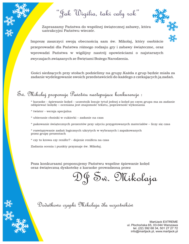 “Jak Wigilia, taki caly rok” Zapraszamy Pañstwa do wspólnej œwi¹tecznej zabawy, która uatrakcyjni Pañstwu wieczór. Imprezê zaszczyci swoj¹ obecnoœci¹ sam œw. Miko³aj, który osobiœcie przeprowadzi dla Pañstwa ró¿nego rodzaju gry i zabawy œwi¹teczne, oraz wprowadzi Pañstwa w wigilijny nastrój opowieœciami o najstarszych zwyczajach zwi¹zanych ze Œwiêtami Bo¿ego Narodzenia. Goœci siedz¹cych przy sto³ach podzielimy na grupy.Ka¿da z grup bêdzie mia³a za zadanie wydelegowanie swoich przedstawicieli do ka¿dego z czekaj¹cych j¹ zadañ. , Sw. Mikolaj proponuje Panstwu nastepujace konkurencje : * karaoke - œpiewanie kolêd - uczestnik losuje tytu³ jednej z kolêd po czym grupa ma za zadanie odœpiewaæ kolêdê – oceniana jest znajomoœæ tekstu, poprawnoœæ wykonania * twister - wersja specjalna * ubieranie choinki w cukierki – zadanie na czas * pakowanie œwi¹tecznych prezentów przy u¿yciu przygotowanych materia³ów – liczy siê czas * rozwi¹zywanie zadañ logicznych ukrytych w wybranych i zapakowanych przez grupê prezentach * czy to krowa czy renifer? - dojenie renifera na czas Zadania ocenia i punkty przyznaje œw. Miko³aj. Poza konkursami proponujemy Pañstwu wspólne œpiewanie kolêd oraz œwi¹teczn¹ dyskotekê z karaoke prowadzon¹ przez , DJ Sw. Mikolaja , Dodatkowo czapki Mikolaja dla uczestnikow MartJack EXTREME ul. P³ochoñska 65, 03-044 Warszawa tel. (22) 392 68 34, 501 27 27 72 [email protected], www.martjack.pl