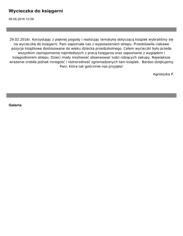 Wycieczka do księgarni 09.05.2016 12:59 29.02.2016r. Korzystając z pięknej pogody i realizując tematykę dotyczącą książek wybraliśmy się na wycieczkę do księgarni. Pani zapoznała nas z wyposażeniem sklepu. Przedstawiła ciekawe pozycje książkowe dostosowane do wieku dziecka przedszkolnego. Celem wycieczki było przede wszystkim zaznajomienie najmłodszych z pracą księgarza oraz zapoznanie z wyglądem i księgozbiorem sklepu. Dzieci miały możliwość obserwować ludzi robiących zakupy. Największe wrażenie zrobiła jednak mnogość i różnorodność zgromadzonych tam książek. Bardzo dziękujemy Pani, która tak gościnnie nas przyjęła! Agnieszka P. Galeria