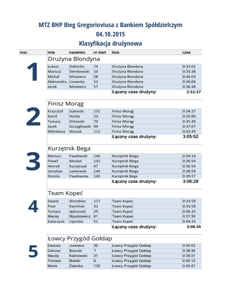 MTZ BHP Bieg Gregorioviusa z Bankiem Spółdzielczym 04.10.2015 Klasyfikacja drużynowa msc 1 imie nazwisko nr start klub czas Drużyna Blondyna Drużyna Blondyna Drużyna Blondyna Drużyna Blondyna Drużyna Blondyna 0:32:02 0:33:38 0:34:03 0:36:06 0:36:38 Drużyna Blondyna Łukasz Mariusz Michał Aleksandra Jacek Oskierko Dembowski Misiewicz Lisowska Misiewicz 74 10 58 52 57 Łączny czas drużyny: 2 3 4 Finisz Morąg Krzysztof Kamil Tomasz Jacek Miłosława Sulewski Horba Orłowski Szczygłowski Wasiak 151 23 70 99 112 Finisz Morąg Finisz Morąg Finisz Morąg Finisz Morąg Finisz Morąg 0:34:27 0:35:00 0:35:39 0:37:07 0:43:39 Łączny czas drużyny: 3:05:52 Kurzętnik Biega Kurzętnik BIega Kurzętnik Biega Kurzętnik Biega Kurzętnik Bega 0:34:14 0:36:54 0:36:54 0:38:59 0:39:27 Łączny czas drużyny: 3:06:28 Team Kopec Team Kopeć Team Kopeć 0:33:59 0:35:58 0:36:25 Kurzętnik Bega Mariusz Paweł Henryk Jarosław Dorota Pawłowski Moskal Kuciejczyk Laskowski Pawłowska 146 142 47 144 145 Team Kopeć Dawid Piotr Tomasz Worobiec Kamiński Jędraszek 117 32 29 Maciej Myszkiewicz 61 Team Kopeć 0:37:39 Katarzyna Lipnicka Team Kopeć 0:44:33 51 Łączny czas drużyny: 5 2:52:27 3:08:34 Łowcy Przygód Gołdap Dariusz Dariusz Maciej Tomasz Marta Jurewicz Borucki Kalinowski Bielski Żabicka 30 7 31 6 130 Łowcy Przygód Gołdap Łowcy Przygód Gołdap Łowcy Przygód Gołdap Łowcy Przygód Gołdap Łowcy Przygód Gołdap 0:34:53 0:38:36 0:39:31 0:40:12 0:45:47 Łączny czas drużyny: 6 Team Kopeć 1 Krzysztof Mirosław Karol Łukasz Magdalena Kaweczyński Ruczyński Januszewski Zakrzewski Zielińska 37 139 27 124 128 Team Kopeć 1 Team Kopeć 1 Team Kopeć 1 Team Kopeć 1 Team Kopeć 1 Łączny czas drużyny: 7 Arkadiusz Dariusz Andrzej Beata Krzysztof Kasperski Skoneczny Zyskowski Gawrońska Sokołowski 35 90 129 16 91 AKM Olimp Olsztyn/sklepbiegowy.com AKM Olimp Olsztyn/sklep biegowy.com AKM Olimp Olsztyn/sklepbiegowy.com AKM Olimp Olsztyn/sklep biegowy.com AKM Olimp Olsztyn/sklepbiegowy.com Bogusław Zbigniew Andrzej Bartosz Małgorzata Kulesza Załęcki Łaguna Zając Kulesza 183 125 54 123 49 New Hair Olsztyn New Hair Olsztyn New Hair Olsztyn New Hair Olsztyn New Hair Olsztyn 0:37:49 0:39:16 0:41:00 0:42:47 0:45:23 3:26:15 0:42:07 0:42:14 0:43:12 0:45:20 0:51:52 3:44:45 Nidzica Biega Andrzej Kamil Grzegorz Adam Barbara Marcjanik Olszewski Misztal Olszewski Jeszko 56 66 59 64 28 Nidzica Biega Nidzica Biega Nidzica Biega Nidzica Biega Nidzica Biega Łączny czas drużyny: 10 3:25:26 New Hair Olsztyn Łączny czas drużyny: 9 0:37:52 0:39:10 0:39:50 0:41:30 0:47:04 AKM Olimp Olsztyn sklepbiegowy.com Łączny czas drużyny: 8 3:18:59 0:44:08 0:45:58 0:49:00 0:50:13 0:51:13 4:00:32 Kiepscy Krzysztof Julia Ewa Katarzyna Michał Osełkowski Osełkowska Lisek Osełkowska Szpakowski 73 71 165 72 103 Kiepscy Kiepscy Kiepscy Kiepscy Kiepscy Łączny czas drużyny: 0:42:38 0:48:37 0:48:48 0:58:03 0:59:02 4:17:08