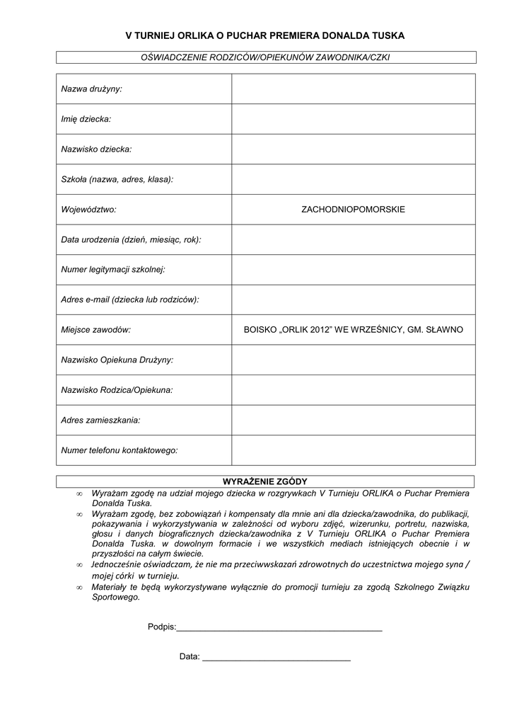 V TURNIEJ ORLIKA O PUCHAR PREMIERA DONALDA TUSKA OŚWIADCZENIE RODZICÓW/OPIEKUNÓW ZAWODNIKA/CZKI Nazwa drużyny: Imię dziecka: Nazwisko dziecka: Szkoła (nazwa, adres, klasa): Województwo: ZACHODNIOPOMORSKIE Data urodzenia (dzień, miesiąc, rok): Numer legitymacji szkolnej: Adres e-mail (dziecka lub rodziców): Miejsce zawodów: BOISKO „ORLIK 2012” WE WRZEŚNICY, GM. SŁAWNO Nazwisko Opiekuna Drużyny: Nazwisko Rodzica/Opiekuna: Adres zamieszkania: Numer telefonu kontaktowego: • • WYRAŻENIE ZGÓDY Wyrażam zgodę na udział mojego dziecka w rozgrywkach V Turnieju ORLIKA o Puchar Premiera Donalda Tuska. Wyrażam zgodę, bez zobowiązań i kompensaty dla mnie ani dla dziecka/zawodnika, do publikacji, pokazywania i wykorzystywania w zależności od wyboru zdjęć, wizerunku, portretu, nazwiska, głosu i danych biograficznych dziecka/zawodnika z V Turnieju ORLIKA o Puchar Premiera Donalda Tuska. w dowolnym formacie i we wszystkich mediach istniejących obecnie i w przyszłości na całym świecie. • Jednocześnie oświadczam, że nie ma przeciwwskazań zdrowotnych do uczestnictwa mojego syna / mojej córki w turnieju. • Materiały te będą wykorzystywane wyłącznie do promocji turnieju za zgodą Szkolnego Związku Sportowego. Podpis:___________________________________________ Data: _______________________________
