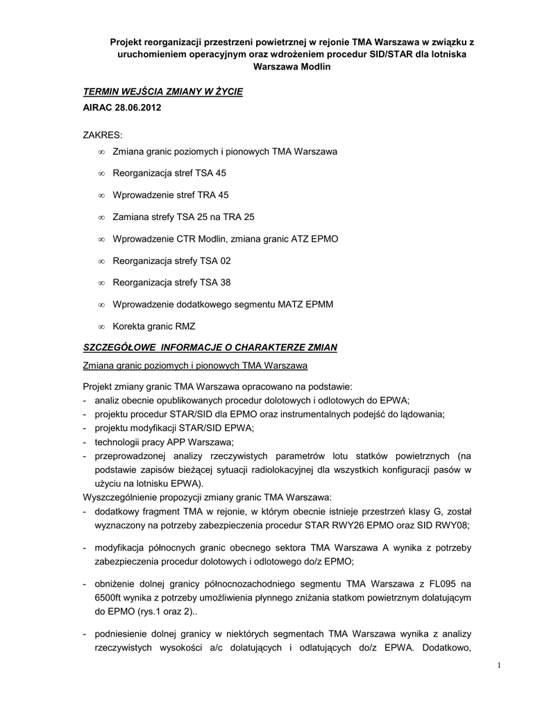 Projekt reorganizacji przestrzeni powietrznej w rejonie TMA Warszawa w związku z uruchomieniem operacyjnym oraz wdrożeniem procedur SID/STAR dla lotniska Warszawa Modlin TERMIN WEJŚCIA ZMIANY W ŻYCIE AIRAC 28.06.2012 ZAKRES: • Zmiana granic poziomych i pionowych TMA Warszawa • Reorganizacja stref TSA 45 • Wprowadzenie stref TRA 45 • Zamiana strefy TSA 25 na TRA 25 • Wprowadzenie CTR Modlin, zmiana granic ATZ EPMO • Reorganizacja strefy TSA 02 • Reorganizacja strefy TSA 38 • Wprowadzenie dodatkowego segmentu MATZ EPMM • Korekta granic RMZ SZCZEGÓŁOWE INFORMACJE O CHARAKTERZE ZMIAN Zmiana granic poziomych i pionowych TMA Warszawa Projekt zmiany granic TMA Warszawa opracowano na podstawie: - analiz obecnie opublikowanych procedur dolotowych i odlotowych do EPWA; - projektu procedur STAR/SID dla EPMO oraz instrumentalnych podejść do lądowania; - projektu modyfikacji STAR/SID EPWA; - technologii pracy APP Warszawa; - przeprowadzonej analizy rzeczywistych parametrów lotu statków powietrznych (na podstawie zapisów bieżącej sytuacji radiolokacyjnej dla wszystkich konfiguracji pasów w użyciu na lotnisku EPWA). Wyszczególnienie propozycji zmiany granic TMA Warszawa: - dodatkowy fragment TMA w rejonie, w którym obecnie istnieje przestrzeń klasy G, został wyznaczony na potrzeby zabezpieczenia procedur STAR RWY26 EPMO oraz SID RWY08; - modyfikacja północnych granic obecnego sektora TMA Warszawa A wynika z potrzeby zabezpieczenia procedur dolotowych i odlotowego do/z EPMO; - obniżenie dolnej granicy północnozachodniego segmentu TMA Warszawa z FL095 na 6500ft wynika z potrzeby umożliwienia płynnego zniżania statkom powietrznym dolatującym do EPMO (rys.1 oraz 2).. - podniesienie dolnej granicy w niektórych segmentach TMA Warszawa wynika z analizy rzeczywistych wysokości a/c dolatujących i odlatujących do/z EPWA. Dodatkowo, 1 przeanalizowano zmianę w kontekście publikacji procedur dolotowych i odlotowych do/z EPMO oraz modyfikację SID/STAR dla EPWA (rys.1 oraz 2).. Reorganizacja stref TSA 45 Reorganizacja granic poziomych i pionowych obecnie publikowanych segmentów strefy TSA45 wynika z lokalizacji lotniska Modlin, z zaprojektowanych procedur SID/STAR EPMO oraz z profilów lotu operacji dolotowych i odlotowych do/z EPMO oraz do/z EPWA (rys.3). W celu pogodzenia potrzeb użytkowników przestrzeni powietrznej w rejonie TMA Warszawa, pozostawiając możliwość wykonywania lotów szybowcowych z EPBC w rejonie TMA Warszawa, opracowano modyfikację granic strefy. Uwzględniając aspekty elastycznego zarządzania przestrzenią powietrzną oraz utrzymanie poziomu bezpieczeństwa ruchu lotniczego w TMA, dostępność poszczególnych segmentów TSA45 oraz ich górne granice będą uzależnione od aktualnie wykorzystywanych kierunków startów i lądowań na lotniskach EPWA oraz EPMO (rys.4 oraz 5). Granice poszczególnych segmentów TSA45 oraz ich wysokości zostały dostosowane do przebiegu zaprojektowanych tras dolotowych i odlotowych do/z EPWA i do/z EPMO z uwzględnieniem przyjętych gradientów zniżania i naboru a/c, restrykcji wysokościowych na poszczególnych punktach meldunkowych oraz z zastosowaniem zasady konieczności utrzymania przez APP Warszawa statku powietrznego w odległości od stref TSA wynoszącej ½ separacji radarowej. Przedmiotowy projekt zmian uwzględnia wnioski z przeprowadzonej symulacji RTS w Ośrodku Szkolenia PAŻP Wprowadzenie strefy TRA 45 Dodatkowo na potrzeby zabezpieczenia skoków spadochronowych z lądowiska Chrcynno wyznaczona została strefa TRA 45. W segmentach A-C (2000ft – FL145) przestrzeń klasy C, służba kontroli ruchu lotniczego będzie zapewniana przez APP Warszawa. Segmenty B oraz C będą przeznaczone do naboru a/c (w zależności od specyfiki ruchu), natomiast segment A będzie wykorzystywany na potrzeby przeprowadzenia zrzutu skoczków (rys.3). W segmencie D (GND – 2000ft), przestrzeń klasy G, służba zapewniana przez FIS Olsztyn. Zamiana strefy TSA 25 na TRA 25 Obecna strefa TSA25 zostanie zamieniona na TRA25, z wyznaczona klasą G, w której służba informacji powietrznej zapewniana będzie przez FIS Warszawa. Granice poziome i pionowe nie ulegną zmianie. Wprowadzenie CTR Modlin, zmiana granic ATZ Modlin 2 Projekt zakłada wprowadzenie CTR Modlin w granicach pionowych GND – 610m (2000ft) na potrzeby zabezpieczenia przyrządowych procedur podejścia do lądowania oraz operacji do/z lotniska EPMO. CTR Modlin będzie aktywny w okresie zapewniania służby ruchu lotniczego przez TWR Modlin, w pozostałych okresach funkcjonować będzie przestrzeń ATZ (klasa G) o w której zapewniana będzie certyfikowana lotniskowa służba informacji powietrznej (AFIS Modlin). Zaproponowany kształt CTR wynika z konieczności zabezpieczenia pierwszorzędnych stref chronionych procedur podejścia do lądowania na oba kierunki EPMO wraz z procedurami nieudanego podejścia oraz procedur odlotowych. Obecne granice ATZ Modlin ulegną zmianie i zostaną dostosowane do granic CTR Modlin Reorganizacja strefy TSA 02 oraz TSA 38 W związku z planowanym poszerzeniem północno-wschodnich granic TMA Warszawa i koniecznością odsunięcia lotów szybowcowych z rejonu EPMO w kierunku północnowschodnim uzgodniono z przedstawicielami SSRL modyfikację granic TSA02E oraz TSA38A.: - strefa TSA 02E zostanie podzielona na dwa segmenty: we wschodniej części obecnego segmentu granice pionowe zostaną nie zmienione (2300ft-FL195) natomiast w zachodnim fragmencie dolna granica zostanie podniesiona do 6500ft (nowy segment TSA 02H - 6500ftFL195). - graniceTSA38A zostaną pomniejszone o zachodni fragment obecnie opublikowanej strefy zwiększając tym samym dostępność dla lotnictwa G/A. - dodatkowo nieznaczna korekta granic poziomych segmentów TSA 02 C oraz D (dostosowanie do nowych granic TMA Warszawa) (rys.6). W wyniku w/w reorganizacji granic TSA02E, w przypadku aktywności lotnictwa wojskowego, przestrzeń powietrzna poniżej do