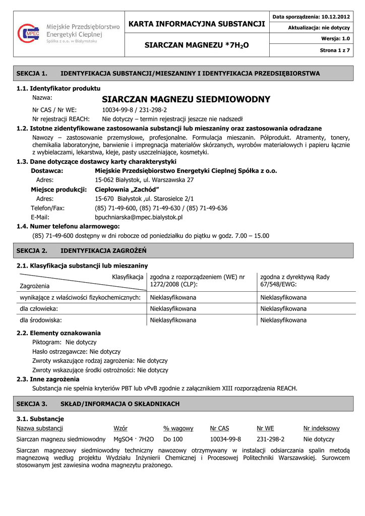 Data sporządzenia: 10.12.2012 KARTA INFORMACYJNA SUBSTANCJI Aktualizacja: nie dotyczy Wersja: 1.0 SIARCZAN MAGNEZU *7H2O SEKCJA 1. Strona 1 z 7 IDENTYFIKACJA SUBSTANCJI/MIESZANINY I IDENTYFIKACJA PRZEDSIĘBIORSTWA 1.1. Identyfikator produktu Nazwa: SIARCZAN MAGNEZU SIEDMIOWODNY Nr CAS / Nr WE: 10034-99-8 / 231-298-2 Nr rejestracji REACH: Nie dotyczy – termin rejestracji jeszcze nie nadszedł 1.2. Istotne zidentyfikowane zastosowania substancji lub mieszaniny oraz zastosowania odradzane Nawozy – zastosowanie przemysłowe, profesjonalne. Formulacja mieszanin. Półprodukt. Atramenty, tonery, chemikalia laboratoryjne, barwienie i impregnacja materiałów skórzanych, wyrobów materiałowych i papieru łącznie z wybielaczami, lekarstwa, kleje, pasty uszczelniające, kosmetyki. 1.3. Dane dotyczące dostawcy karty charakterystyki Dostawca: Adres: Miejskie Przedsiębiorstwo Energetyki Cieplnej Spółka z o.o. 15-062 Białystok, ul. Warszawska 27 Miejsce produkcji: Adres: Ciepłownia „Zachód” 15-670 Białystok ,ul. Starosielce 2/1 Telefon/Fax: (85) 71-49-600, (85) 71-49-630 / (85) 71-49-636 E-Mail: [email protected] 1.4. Numer telefonu alarmowego: (85) 71-49-600 dostępny w dni robocze od poniedziałku do piątku w godz. 7.00 – 15.00 SEKCJA 2. IDENTYFIKACJA ZAGROŻEŃ 2.1. Klasyfikacja substancji lub mieszaniny Zagrożenia zgodna z rozporządzeniem (WE) nr 1272/2008 (CLP): zgodna z dyrektywą Rady 67/548/EWG: wynikające z właściwości fizykochemicznych: Nieklasyfikowana Nieklasyfikowana dla człowieka: Nieklasyfikowana Nieklasyfikowana dla środowiska: Nieklasyfikowana Nieklasyfikowana Klasyfikacja 2.2. Elementy oznakowania Piktogram: Nie dotyczy Hasło ostrzegawcze: Nie dotyczy Zwroty wskazujące rodzaj zagrożenia: Nie dotyczy Zwroty wskazujące środki ostrożności: Nie dotyczy 2.3. Inne zagrożenia Substancja nie spełnia kryteriów PBT lub vPvB zgodnie z załącznikiem XIII rozporządzenia REACH. SEKCJA 3. SKŁAD/INFORMACJA O SKŁADNIKACH 3.1. Substancje Nazwa substancji Wzór % wagowy Nr CAS Nr WE Nr indeksowy Siarczan magnezu siedmiowodny MgSO4 · 7H2O Do 100 10034-99-8 231-298-2 Nie dotyczy Siarczan magnezowy siedmiowodny techniczny nawozowy otrzymywany w instalacji odsiarczania spalin metodą magnezową według projektu Wydziału Inżynierii Chemicznej i Procesowej Politechniki Warszawskiej. Surowcem stosowanym jest zawiesina wodna magnezytu prażonego. Data sporządzenia: 10.12.2012 KARTA INFORMACYJNA SUBSTANCJI Aktualizacja: nie dotyczy Wersja: 1.0 SIARCZAN MAGNEZU *7H2O SEKCJA 4. Strona 2 z 7 ŚRODKI PIERWSZEJ POMOCY 4.1. Opis środków pierwszej pomocy Wdychanie: Środki specjalne nie są wymagane. W przypadku pojawienia się niepokojących objawów skonsultować się z lekarzem. Kontakt ze skórą: Zmyć pył ze skóry dużą ilością wody. W przypadku utrzymujących się objawów podrażnienia skonsultować się z lekarzem. Kontakt z oczami: Jeśli pył dostanie się do oczu, przemyć dużą ilością wody. W przypadku utrzymujących się objawów podrażnienia skonsultować się z lekarzem. Połknięcie: Podać do wypicia dużą ilość wody. W przypadku złego samopoczucia skonsultować się z lekarzem. 4.2. Najważniejsze ostre i opóźnione objawy oraz skutki narażenia Może wystąpić lekkie podrażnienie skóry i oczu. 4.3. Wskazania dotyczące wszelkiej natychmiastowej pomocy lekarskiej i szczególnego postępowania z poszkodowanym Wdychanie gazów powstających podczas pożaru, zawierających tlenki siarki może działać drażniąco i żrąco na drogi oddechowe. Mogą wystąpić problemy z płucami. SEKCJA 5. POSTĘPOWANIE W PRZYPADKU POŻARU 5.1. Środki gaśnicze Odpowiednie środki gaśnicze: substancja niepalna. Stosować środki gaśnicze odpowiednie do palącego się otoczenia. Niewłaściwe środki gaśnicze: nie są znane. 5.2. Szczególne zagrożenia związane z substancją lub mieszaniną W środowisku pożaru mogą tworzyć się trujące gazy: tlenki siarki (SOx). 5.3. Informacje dla straży pożarnej Nie dopuścić do przedostania się ścieków po gaszeniu pożaru do kanalizacji, wód i gleby. W przypadku pożaru stosować odzież ochronną i aparaty oddechowe z niezależnym dopływem powietrza. Otworzyć okna i drzwi pomieszczenia, aby umożliwić wentylację. SEKCJA 6. POSTĘPOWIANIE W PRZYPADKU NIEZAMIERZONEGO UWOLNIENIA DO ŚRODOWISKA 6.1. Indywidualne środki ostrożności, wyposażenie ochronne i procedury w sytuacjach awaryjnych Stosować środki ochrony indywidualnej – zob. sekcja 8 karty informacyjnej. Unikać tworzenia się pyłu oraz jego rozprzestrzeniania. Zapewnić odpowiednią wentylację pomieszczeń. Unikać kontaktu z oczami, skórą i odzieżą. 6.2. Środki ostrożności w zakresie ochrony środowiska Unikać tworzenia się pyłu. 6.3. Metody i materiały zapobiegające rozprzestrzenianiu się skażenia i służące do usuwania skażenia Zebrać i w miarę możliwości odzyskać lub unieszkodliwić. Aby uniknąć tworzenia się pyłu w powietrzu, substancję można odkurzyć na sucho lub zmyć na mokro przy użyciu urządzeń mechanicznych. 6.4. Odniesienia do innych sekcji Odnieść się również do sekcji 8 i 13 karty informacyjnej. SEKCJA 7. POSTĘPOWANIE Z SUBSTANCJAMI I MIESZANINAMI ORAZ ICH MAGAZYNOWANIE 7.1. Środki ostrożności dotyczące bezpiecznego postępowania Podczas stosowania produktu nie jeść, nie pić, nie palić. Myć ręce po zakończeniu pracy z produktem. Unikać długotrwałego kontaktu ze skórą. Unikać tworzenia się pyłu. Nie wdychać pyłu. Stosować środki ochrony Data sporządzenia: 10.12.2012 KARTA INFORMACYJNA SUBSTANCJI Aktualizacja: nie dotyczy Wersja: 1.0 SIARCZAN MAGNEZU *7H2O Strona 3 z 7 indywidualnej – zob. sekcja 8 karty informacyjnej. 7.2. Warunki bezpiecznego magazynowania, łącznie z informacjami dotyczącymi wszelkich wzajemnych niezgodności Magazynować w suchym, dobrze wentylowanym pomieszczeniu, z dala od źródeł ciepła, bezpośredniego nasłonecznienia, wilg