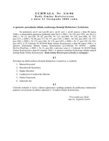 UCHWAŁA Nr I/6/06 Rady Gminy Kościerzyna z dnia 21 listopada 2006 roku w sprawie: powołania składu osobowego Komisji Rolnictwa i Leśnictwa Na podstawie art.21 ust.1,art.40 ust.1, art.41 ust.1 i art.42 ustawy z dnia 08 marca 1990 r. o samorządzie gminnym (jednolity tekst Dz.U.z 2001 r. Nr 142, poz.1591, zm. Dz.U.z 2002 r. Nr 23, poz.220, Nr 62, poz.558, Nr 113, poz.984, Nr 214, poz.1806, Nr 153, poz.1271, z 2003 r. Nr 80, poz.717, Nr 177, poz.1725, z 2004 r. Nr 102, poz.1055 i Nr 177, poz.1203, z 2005 r. Nr 172, poz.1441, Nr 175, poz.1457, z 2006 r. Nr 17, poz.128 i Nr 181, poz.1457), § 25 Uchwały Nr II/54/96 Rady Gminy Kościerzyna z dnia 06 marca 1996 r. w sprawie uchwalenia Statutu Gminy Kościerzyna (j.t.Uchwała Nr II/9/02 - publik. Dz.Urz.Woj.Pom. z 2003 r. Nr 31, poz.366 z póź.zm.) oraz § 1 Uchwały Nr II/6/94 Rady Gminy Kościerzyna z dnia 05 sierpnia 1994 r. w sprawie ustalenia liczbowego składu stałych komisji Rady Gminy Kościerzyna - Rada Gminy Kościerzyna uchwala co następuje : §1 Powołuje się skład osobowy Komisji Rolnictwa i Leśnictwa, w osobach: 1. Bławat Krzysztof 2. Brzoskowski Kazimierz 3. Hapka Mirosław 4. Lamkiewicz-Czechowska Mariola 5. Niklas Franciszek 6. Sadowski Jan §2 Uchwała wchodzi w życie z dniem ogłoszenia i podlega podaniu do publicznej wiadomości poprzez wywieszenie na tablicy ogłoszeń w Urzędzie Gminy Kościerzyna. Przewodniczący Rady mgr inż. Zygmunt Szulist