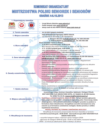 1. Organizatorzy zawodów Ø Urząd Miasta Gdańska www.gdansk.pl Ø Polski Związek Judo www.pzjudo.pl Ø Sekcja Judo KS AZS AWFiS Gdańsk www.judo-team.pl 2. Termin zawodów 3. Miejsce zawodów 4. Biuro zawodów 5. Dane teleadresowe 6. Zasady uczestnictwa w zawodach 7. Opłata startowa 8. Miejsce zakwaterowania 9. Weryfikacja do losowania Ø 4-6.10.2013 (piątek-niedziela) Hala Widowiskowo-Sportowa AWFiS Gdańsk (ul. Kazimierza Górskiego 1, 80-336 Gdańsk) p. Grzegorz Skoczko ([email protected]), Tel. 663-245-663 p. Andrzej Rybak ([email protected]), Tel. 501-065-200 Biuro zawodów czynne w dniach: Ø 3.10.2013 (czwartek) godz. 16:00-22:00 Best Western Plus Arkon Park Hotel, ul. Śląska 10, 80-384 Gdańsk Ø 4 i 5. 10.2013 (piątek) godz. 9:00-18:00 Hala AWFiS Gdańsk, ul. K. Górskiego 1, 80-336 Gdańsk Ø 6.10.2013 (niedziela) godz. 9:00-zakończenie zawodów Hala AWFiS Gdańsk, ul. K. Górskiego 1, 80-336 Gdańsk Ø Klub Sportowy AZS AWFiS Gdańsk, ul. Czyżewskiego 29, 80-336 Gdańsk, [email protected] , (058) 552-47-21, www.judo-team.pl Ø Zawody zostaną rozegrane na trzech matach (zgodnie z Regulaminem Sportowym PZJudo) Ø Zgłoszeni zawodnicy muszą posiadać aktualną licencję PZJudo oraz aktualne badania lekarskie Ø Zawody zostaną rozegrane systemem zgodnie z liczbą zgłoszonych zawodniczek/zawodników (Regulamin Sportowy PZJudo). W sytuacji, gdy w danej kategorii wagowej po weryfikacji ostatecznej odnotowana jest mniejsza liczba uczestników od liczby rozlosowanej i dla tej liczby uczestników Regulamin przewiduje inny system rozegrania zawodów kategoria ta zostanie przelosowana. Przelosowanie nastąpi niezwłocznie po weryfikacji ostatecznej po poinformowaniu zainteresowanych przedstawicieli Klubów i trenerów. Ø Kluby dokonujące zgłoszeń zawodników musza posiadać aktualną licencję klubową Ø Koszty uczestnictwa w zawodach pokrywają zainteresowane Kluby Ø Opłata startowa wynosi 35 złotych od każdego zgłoszonego zawodnika/zawodniczki Uczestniczące ekipy, Komisarz Zawodów, Sędziowie i Delegaci PZJudo BEST WESTERN PLUS ARKON PARK HOTEL, Ul. ŚLĄSKA 10, 80-384 Gdańsk, Tel. (058) 731-55-56, [email protected] Ø Rezerwacja zakwaterowania do dnia 3.09.2013. Po tym terminie zgłoszenia będą przyjmowane zgodnie z aktualną dostępnością pokoi. Rezerwację należy złożyć zgodnie z formularzem zamówienia noclegów i przesłać na podane w formularzu dane teleadresowe. Szczegółowe warunki rezerwacji oraz ceny zawarte są w formularzu zamówienia noclegów. Bardzo prosimy o solidne wypełnienie formularza. PROSZĘ TRZYMAĆ SIĘ TERMINU ZAMÓWIENIA NOCLEGU! Weryfikację do losowania przeprowadza Komisarz Zawodów w terminie: 3.10.2013 (czwartek) godz. 18:00-20:00 - Sala konferencyjna BEST WESTERN PLUS ARKON PARK HOTEL – wszystkie kategorie kobiet i mężczyzn oprócz kategorii OPEN - zgłoszenie do kategorii OPEN do godz. 16:00 na Hali AWFiS, losowanie kategorii OPEN – 15 minut po zakończeniu walk w sobotę 5.10.2013r. 10. Wiek startujących. 11. Konferencja techniczna i losowanie 12. Komisarz Zawodów 13. Judogi 14. Zgłoszenia do zawodów 15. Ważenie i kontrola badań lekarskich Roczniki 1995 i starsi 3.10.2013 (czwartek) godz. 21:00 - Sala konferencyjna BEST WESTERN PLUS ARKON PARK HOTEL Ø Zawody kobiet i mężczyzn we wszystkich kategoriach wagowych oprócz kategorii OPEN Ø Kategoria OPEN w dniu 5.10.2013 (sobota) po zakończeniu zawodów na Hali AWFiS. Zawody kobiet i mężczyzn w kategorii OPEN P. Krzysztof Rogulski, tel. 534-651-939, email: [email protected] 1.Obowiązują judoki białe i niebieskie. Pierwszy wyczytany zawodnik/zawodniczka ubiera judogi białą, drugi zawodnik/zawodniczka judogi niebieskie. 2.Kontrola judog odbywa się zgodnie z zasadami Sokuteiki. 3.Do dekoracji obowiązuje judogi koloru białego. 4. Back numbers – Dopuszczone, Imię i Nazwisko – Klub – dopuszczone 5. Koszulki kobiet – zgodnie z przepisami walk 6. Reklamy i inne elementy na judogi spełniające wymogi przepisów PZJ. Kluby dokonują zgłoszeń co najmniej na 5 dni przed zawodami - Do 29.09.2013 włącznie(niedziela, godz. 24:00) -tylko przez system elektroniczny PZJudo zgodnie z Regulaminem Sportowym PZJudo. Zgłoszenia dokonane w innym trybie (mail, fax,, itp.) nie będą uwzględnione! Ø Zgłoszenie dokonane po terminie (system przyjmuje tego typu zgłoszenia) – kara regulaminowa zgodnie z Regulaminem Sportowym PZJudo wniesiona podczas weryfikacji. Bez dokonania opłaty zgłoszony zawodnik/zawodniczka nie będą rozlosowani Ø Korekta zgłoszenia – zmiana kategorii wagowej, wykreślenie z zawodów (nie dotyczy dokonania zgłoszenia nowej osoby do zawodów) Ø Tryb dokonywania korekt – do 2.10.2013 drogą elektroniczną przez system. Po 2.10.2013 mail na adres: : [email protected], [email protected], [email protected] lub podczas weryfikacji do zawodów. Inny tryb dokonywania korekt nie będzie uwzględniony Ø Waga kontrolna – zawody kobiet i mężczyzn: 3.10.2013 (czwartek) w godz. 16:00 – 22:00 BEST WESTERN PLUS ARKON PARK HOTEL Ul. ŚLĄSKA 10, 80-384 Gdańsk 4 i 5.10.2013 (piątek, sobota) w godz. 10:00 – 22:00 BEST WESTERN PLUS ARKON PARK HOTEL Ul. ŚLĄSKA 10, 80-384 Gdańsk Ø Waga nieoficjalna – zawody kobiet i mężczyzn: 4,5, 6.10.2013 (piątek) w godz. 6:00 – 7:00 BEST WESTERN PLUS ARKON PARK HOTEL, Ul. ŚLĄSKA 10, 80-384 Gdańsk Ø Waga oficjalna i kontrola badań lekarskich – zawody kobiet i mężczyzn: Podczas ważenia należy posiadać dokument tożsamości oraz ważne badania lekarskie 4.10.2013 (piątek) w godz. 7:00 – 9:00 BEST WESTERN PLUS ARKON PARK HOTEL, Ul. ŚLĄSKA 10, 80-384 Gdańsk Kobiety: +78 kg, 78 kg, 70 kg, 63 kg Mężczyźni: + 100 kg, 100 kg, 90 kg 5.10.2013 (sobota) w godz. 7:00 – 9:00 BEST WESTERN PLUS ARKON PARK HOTEL, Ul. ŚLĄSKA 10, 80-384 Gdańsk Kobiety: 57 kg, 52 kg, 48 kg Mężczyźni: 81 kg, 73 kg, 66 kg, 60 kg 6.10.2013 (niedziela) w godz. 7:00 – 9:00 BEST WESTERN PLUS AR