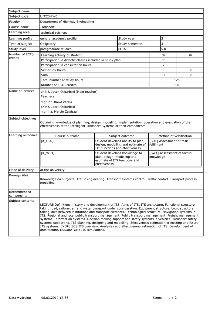 Subject name Subject code L:32247W0 Faculty Department of Highway Engineering Course name Transport Learning area technical sciences Learning profile general academic profile Study year 2 Type of subject Obligatory Study semester 3 Study level postgraduate studies ECTS 5.0 Number of ECTS credits Learning activity of student ch Participation in didactic classes included in study plan 60 Participation in consultation hours sh 7 Self-study hours 58 Sum Name of lecturer 67 58 Total number of study hours 125 Number of ECTS credits 5.0 dr inż. Jacek Oskarbski (Main teacher) Teachers: mgr inż. Karol Żarski dr inż. Jacek Oskarbski mgr inż. Marcin Zawisza Subject objectives Obtaining knowledge of planning, design, modeling, implementation, operation and evaluation of the effectiveness of the Intelligent Transport Systems or their components Learning outcomes Mode of delivery Course outcome Subject outcome Method of veryfication [K_U20] . Student develops abality to plan, design, modelling and estimate of ITS functions and efectiveness. [SU1] Assessment of task fulfilment [K_W13] . Student develops knowledge to plan, design, modelling and estimate of ITS functions and efectiveness. [SW1] Assessment of factual knowledge at the university Prerequisites Knowledge on subjects: Traffic engineering. Transport systems control. Traffic control. Transport process modelling. Recommended components Subject contents LECTURE Definitions, history and development of ITS. Aims of ITS. ITS arcitecture. Functional structure taking road, railway, air and water transport under consideration. Equipment structure. Logic structure taking links between institutions and transport elements. Technological structure. Navigation systems in ITS. Regional and local public transport management. Public transport management. Freight management systems. Information systems. Decision making support and safety systems in vehicles. Transport safety systems supporting. ITS planning, designing and modelling. Efectiveness estimation of existing and future ITS systems. EXERCISES ITS overview. Analysies and effectiveness estimation of ITS. Develompent of architecture. LABORATORY ITS simulations. Data wydruku: 08.03.2017 12:36 Strona 1 z 2 Recommended and required reading Required reading 1. Jamroz K. i inni.: Systemy sterowania ruchem ulicznym. WKŁ, 1984 r. 2. Krystek R. i inni: Komputerowe systemy sterowania ruchem ulicznym i drogowym. Przykłady zastosowań. WKŁ 1984 3. Leśko M., Guzik J.: Sterowanie ruchem drogowym. WPŚ, 2000. 4. Gaca S., Suchorzewski W., Tracz M.: Inżynieria Ruchu Drogowego WKŁ 2008 5. Malarski M.: Inżynieria Ruchu Lotniczego OWPW, 2005 6. Krystek R i inni: Węzły drogowe i autostradowe. WKŁ 2008 7. System nawigacyjny Galileo. Aspekty strategiczne, naukowe i techniczne. WKŁ Warszawa 2006. 8. Januszewski J.: Systemy satelitarne GPS Galilei i inne. PWN Warszawa 2006. Recommeded reading 1. Periodics: Transport Miejski i Regionalny, Traffic Engineering & Control, Przegląd ITS, Autostrady 2. Strony www. Lesson type and method of instruction Lesson type Number of study hours Lecture Tutorial Laboratory Project Seminar 30.0 15.0 15.0 0.0 0.0 Total number of study hours per semester included in study plan 60 e-learning hours included: 0.0 Assesment methods and criteria Subject passing criteria Passing threshold Percentage of the final grade 60.0 60.0 laboratory 100.0 20.0 exercises 100.0 20.0 Exam Example issues / example questions / tasks being completed Development of ITS architecture. Modelling of ITS components. Language of instructions Polish Work placement Not applicable Data wydruku: 08.03.2017 12:36 Strona 2 z 2
