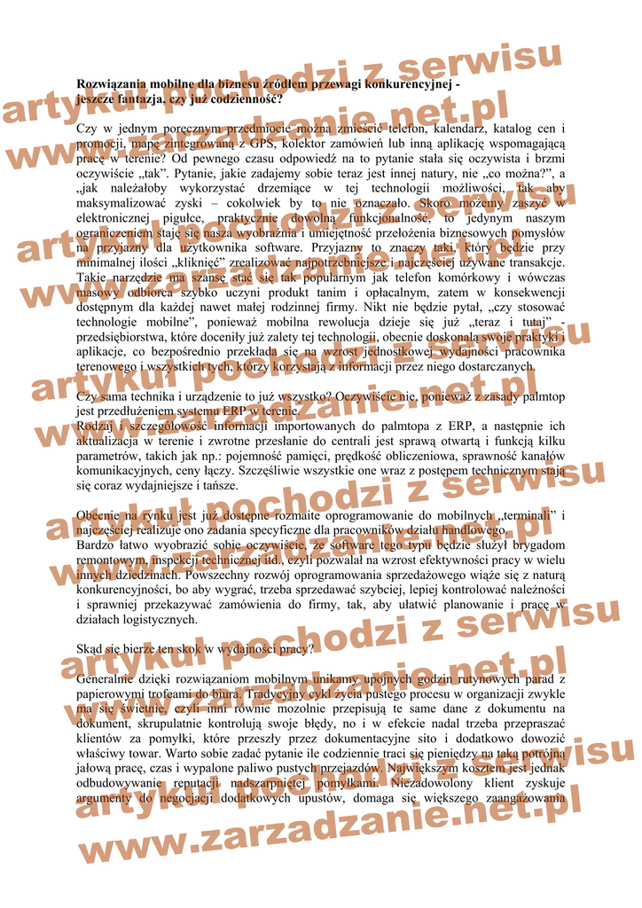 u s i w r e s z i z d o h c o p ł u k l p . arty t e n . e i n a z d a z r a z . w w w u s i w r e s z i z d o h c o p ł u k l p . arty t e n . e i n a z d a z r a z . w w w u s i w r e s z i z d o h c o p ł u k y l p . art t e n . e i n a z d a z r a z . w ww u s i w r e s z i z d o h c o p ł u k y l p . art t e n . e i n a z d a z r a z . w w w u s i w r e s z i z d o h c o p ł u k l p . arty t e n . e i n a z d a z r a z . w w w u s i w r e s z i z d o h c o p ł u k l p . arty t e n . e i n a z d a z r a z . w w w Rozwiązania mobilne dla biznesu źródłem przewagi konkurencyjnej jeszcze fantazja, czy już codzienność? Czy w jednym poręcznym przedmiocie można zmieścić telefon, kalendarz, katalog cen i promocji, mapę zintegrowaną z GPS, kolektor zamówień lub inną aplikację wspomagającą pracę w terenie? Od pewnego czasu odpowiedź na to pytanie stała się oczywista i brzmi oczywiście „tak”. Pytanie, jakie zadajemy sobie teraz jest innej natury, nie „co można?”, a „jak należałoby wykorzystać drzemiące w tej technologii możliwości, tak aby maksymalizować zyski – cokolwiek by to nie oznaczało. Skoro możemy zaszyć w elektronicznej pigułce, praktycznie dowolną funkcjonalność, to jedynym naszym ograniczeniem staję się nasza wyobraźnia i umiejętność przełożenia biznesowych pomysłów na przyjazny dla użytkownika software. Przyjazny to znaczy taki, który będzie przy minimalnej ilości „kliknięć” zrealizować najpotrzebniejsze i najczęściej używane transakcje. Takie narzędzie ma szansę stać się tak popularnym jak telefon komórkowy i wówczas masowy odbiorca szybko uczyni produkt tanim i opłacalnym, zatem w konsekwencji dostępnym dla każdej nawet małej rodzinnej firmy. Nikt nie będzie pytał, „czy stosować technologie mobilne”, ponieważ mobilna rewolucja dzieje się już „teraz i tutaj” przedsiębiorstwa, które doceniły już zalety tej technologii, obecnie doskonalą swoje praktyki i aplikacje, co bezpośrednio przekłada się na wzrost jednostkowej wydajności pracownika terenowego i wszystkich tych, którzy korzystają z informacji przez niego dostarczanych. Czy sama technika i urządzenie to już wszystko? Oczywiście nie, ponieważ z zasady palmtop jest przedłużeniem systemu ERP w terenie. Rodzaj i szczegółowość informacji importowanych do palmtopa z ERP, a następnie ich aktualizacja w terenie i zwrotne przesłanie do centrali jest sprawą otwartą i funkcją kilku parametrów, takich jak np.: pojemność pamięci, prędkość obliczeniowa, sprawność kanałów komunikacyjnych, ceny łączy. Szczęśliwie wszystkie one wraz z postępem technicznym stają się coraz wydajniejsze i tańsze. Obecnie na rynku jest już dostępne rozmaite oprogramowanie do mobilnych „terminali” i najczęściej realizuje ono zadania specyficzne dla pracowników działu handlowego. Bardzo łatwo wyobrazić sobie oczywiście, że software tego typu będzie służył brygadom remontowym, inspekcji technicznej itd., czyli pozwalał na wzrost efektywności pracy w wielu innych dziedzinach. Powszechny rozwój oprogramowania sprzedażowego wiąże się z naturą konkurencyjności, bo aby wygrać, trzeba sprzedawać szybciej, lepiej kontrolować należności i sprawniej przekazywać zamówienia do firmy, tak, aby ułatwić planowanie i pracę w działach logistycznych. Skąd się bierze ten skok w wydajności pracy? Generalnie dzięki rozwiązaniom mobilnym unikamy upojnych godzin rutynowych parad z papierowymi trofeami do biura. Tradycyjny cykl życia pustego procesu w organizacji zwykle ma się świetnie, czyli inni równie mozolnie przepisują te same dane z dokumentu na dokument, skrupulatnie kontrolują swoje błędy, no i w efekcie nadal trzeba przepraszać klientów za pomyłki, które przeszły przez dokumentacyjne sito i dodatkowo dowozić właściwy towar. Warto sobie zadać pytanie ile codziennie traci się pieniędzy na taką potrójną jałową pracę, czas i wypalone paliwo pustych przejazdów. Największym kosztem jest jednak odbudowywanie reputacji nadszarpniętej pomyłkami. Niezadowolony klient zyskuje argumenty do negocjacji dodatkowych upustów, domaga się większego zaangażowania u s i w r e s z i z d o h c o p ł u k l p . arty t e n . e i n a z d a z r a z . w w w u s i w r e s z i z d o h c o p ł u k l p . arty t e n . e i n a z d a z r a z . w w w u s i w r e s z i z d o h c o p ł u k y l p . art t e n . e i n a z d a z r a z . w ww u s i w r e s z i z d o h c o p ł u k y l p . art t e n . e i n a z d a z r a z . w w w u s i w r e s z i z d o h c o p ł u k l p . arty t e n . e i n a z d a z r a z . w w w u s i w r e s z i z d o h c o p ł u k l p . arty t e n . e i n a z d a z r a z . w w w zasobów i w końcu odchodzi a firma ponosi coraz większe koszty handlowe związane ze zdobyciem nowych klientów, których nie potrafi utrzymać przy sobie. Wprowadzając rozwiązania mobilne, automatyzujemy działania robocze, standaryzujemy procedury według prostego algorytmu narzuconego przez aplikację, zwiększamy ich tempo, eliminujemy niepotrzebne etapy i błędy z nich wynikające, zmniejszamy straty czasu oraz ograniczamy ilość ludzi pośredniczących w procesie, zyskujemy elastyczność w zmianie parametrów zamówień i eliminujemy błędy wynikające z papierowych poprawek. Oszczędności wypływające w powyższych zmian są w dużej części policzalne i mogą pozwolić na przygotowanie dobrze zaplanowanej inwestycji. Dodatkowo, dzięki rosnącej standaryzacji oprogramowania narzędziowego i biegłości programistów, coraz częściej tworzy się aplikacje dedykowane, dopasowane do specyficznych wymagań klientów. W tym również nie ma nic dziwnego, ponieważ klienci firmy są zdobywani i utrzymywani poprzez oferowanie im specjalnego, specyficznego sposobu obsługi i we współczesnym zunifikowanym świecie staję się to coraz silniejszym argumentem decydującym o wygranej w walce 