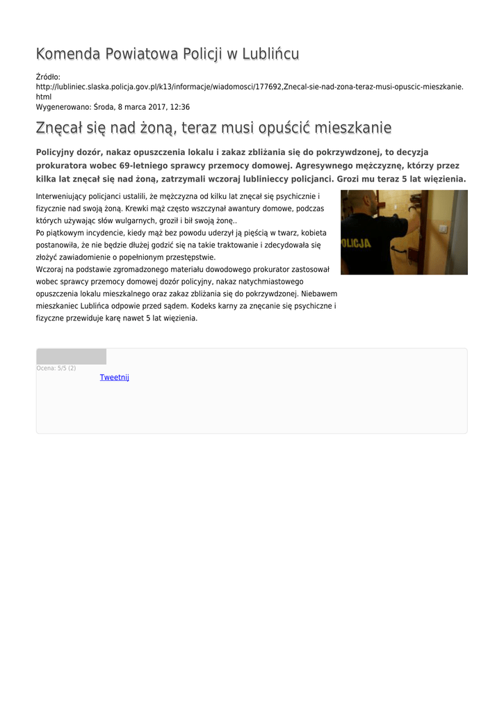 Komenda Powiatowa Policji w Lublińcu Źródło: http://lubliniec.slaska.policja.gov.pl/k13/informacje/wiadomosci/177692,Znecal-sie-nad-zona-teraz-musi-opuscic-mieszkanie. html Wygenerowano: Środa, 8 marca 2017, 12:36 Znęcał się nad żoną, teraz musi opuścić mieszkanie Policyjny dozór, nakaz opuszczenia lokalu i zakaz zbliżania się do pokrzywdzonej, to decyzja prokuratora wobec 69-letniego sprawcy przemocy domowej. Agresywnego mężczyznę, którzy przez kilka lat znęcał się nad żoną, zatrzymali wczoraj lublinieccy policjanci. Grozi mu teraz 5 lat więzienia. Interweniujący policjanci ustalili, że mężczyzna od kilku lat znęcał się psychicznie i fizycznie nad swoją żoną. Krewki mąż często wszczynał awantury domowe, podczas których używając słów wulgarnych, groził i bił swoją żonę.. Po piątkowym incydencie, kiedy mąż bez powodu uderzył ją pięścią w twarz, kobieta postanowiła, że nie będzie dłużej godzić się na takie traktowanie i zdecydowała się złożyć zawiadomienie o popełnionym przestępstwie. Wczoraj na podstawie zgromadzonego materiału dowodowego prokurator zastosował wobec sprawcy przemocy domowej dozór policyjny, nakaz natychmiastowego opuszczenia lokalu mieszkalnego oraz zakaz zbliżania się do pokrzywdzonej. Niebawem mieszkaniec Lublińca odpowie przed sądem. Kodeks karny za znęcanie się psychiczne i fizyczne przewiduje karę nawet 5 lat więzienia. Ocena: 5/5 (2) Tweetnij