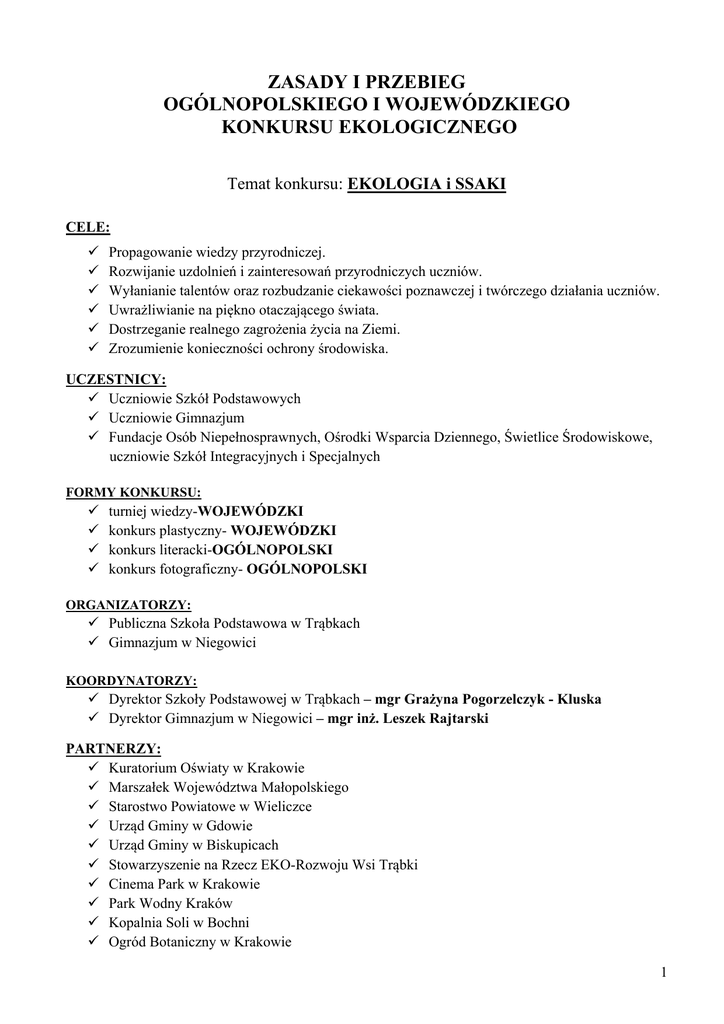 ZASADY I PRZEBIEG OGÓLOPOLSKIEGO I WOJEWÓDZKIEGO KOKURSU EKOLOGICZEGO Temat konkursu: EKOLOGIA i SSAKI CELE: Propagowanie wiedzy przyrodniczej. Rozwijanie uzdolnień i zainteresowań przyrodniczych uczniów. Wyłanianie talentów oraz rozbudzanie ciekawości poznawczej i twórczego działania uczniów. Uwrażliwianie na piękno otaczającego świata. Dostrzeganie realnego zagrożenia życia na Ziemi. Zrozumienie konieczności ochrony środowiska. UCZESTICY: Uczniowie Szkół Podstawowych Uczniowie Gimnazjum Fundacje Osób Niepełnosprawnych, Ośrodki Wsparcia Dziennego, Świetlice Środowiskowe, uczniowie Szkół Integracyjnych i Specjalnych FORMY KOKURSU: turniej wiedzy-WOJEWÓDZKI konkurs plastyczny- WOJEWÓDZKI konkurs literacki-OGÓLOPOLSKI konkurs fotograficzny- OGÓLOPOLSKI ORGAIZATORZY: Publiczna Szkoła Podstawowa w Trąbkach Gimnazjum w Niegowici KOORDYATORZY: Dyrektor Szkoły Podstawowej w Trąbkach – mgr Grażyna Pogorzelczyk - Kluska Dyrektor Gimnazjum w Niegowici – mgr inż. Leszek Rajtarski PARTERZY: Kuratorium Oświaty w Krakowie Marszałek Województwa Małopolskiego Starostwo Powiatowe w Wieliczce Urząd Gminy w Gdowie Urząd Gminy w Biskupicach Stowarzyszenie na Rzecz EKO-Rozwoju Wsi Trąbki Cinema Park w Krakowie Park Wodny Kraków Kopalnia Soli w Bochni Ogród Botaniczny w Krakowie 1 Harmonogram konkursu Termin Zadanie do 04.03.2015r. Zgłoszenie udziału w turnieju wiedzy wypełnić kartę zgłoszeniową (zał. nr 1) i wysłać pocztą na adres: (środa) Publiczna Szkoła Podstawowa Trąbki 312 32-020 Wieliczka Gimnazjum w Niegowici Niegowić 62 32 – 420 Gdów [email protected] 06.03.2015 r. (piątek) godz. 10.00 Turniej wiedzy Szkoły Podstawowe - Szkoła Podstawowa w Trąbkach Gimnazja – Gimnazjum w Niegowici rejestracja uczestników 9.00 – 9.45 06.03.2015 r. (piątek) Termin oddawania prac: plastycznych, literackich i fotograficznych. Miejsce: Szkoła Podstawowa w Trąbkach Trąbki 312 32-020 Wieliczka Gimnazjum w Niegowici Niegowić 62 32 – 420 Gdów 11.03.2015r. (środa) Ocena i wybór najlepszych prac plastycznych, literackich i fotograficznych przez komisję powołaną przez organizatorów. 13.03.2015 r. (piątek) W tym dniu zapraszamy chętnych uczestników konkursu wraz z opiekunami do udziału w głosowaniu na specjalną agrodę Publiczności Miejsce: Urząd Gminy Biskupice – Tomaszkowice 455 25.03.2015 r. (środa) GALA KOKURSU wręczenie nagród i dyplomów wystawa nagrodzonych prac Miejsce: CIEMA PARK W KRAKOWIE Informacje o konkursie można uzyskać pod nr telefonu: Szkoła Podstawowa w Trąbkach tel: 12 250 50 55 Gimnazjum w Niegowici tel: 12 251 95 15 lub Janina Świeży tel : 501 355 804 TERMINY MOGĄ ULEC NIEZNACZNEJ KOREKCIE 2 KOKURS PLASTYCZY-WOJEWÓDZKI KATEGORIA prace płaskie format: A2 (420mm x 594mm) technika: dowolna prace przestrzenne format: max.(60cm x 60cm x 60cm) technika: dowolna GRUPA WIEKOWA • • • • SP – kl. I SP – kl. II – III SP – kl. IV – VI Gimnazjum – kl. I – III • • • • SP – kl. I SP – kl. II – III SP – kl. IV – VI Gimnazjum – kl. I – III • Fundacje Osób Niepełnosprawnych • Ośrodki Wsparcia Dziennego • Świetlice Środowiskowe • Szkoły Integracyjne i Specjalne KOKURS LITERACKI- OGÓLOPOLSKI KATEGORIA praca literacka opowiadanie format: max. 1 strona A4 GRUPA WIEKOWA • SP – kl. I - III • SP – kl. IV – VI • Gimnazjum – kl. I – III KOKURS FOTOGRAFICZY-OGÓLOPOLSKI KATEGORIA GRUPA WIEKOWA tylko jedno zdjęcie format: A4 • SP – kl. I – VI • Gimnazjum – kl. I – III Każda szkoła może przesłać jedną pracę z każdej grupy wiekowej z wymienionych wyżej kategorii. Autorem jednej pracy konkursowej może być tylko jeden uczeń. Wszystkie prace konkursowe: plastyczne, literackie i fotograficzne muszą być opisane na odwrocie zgodnie z podanym wzorem metryczki: Kategoria: ………………………………………..………..……………… Imię i nazwisko:…………………….…………………………………….. Klasa: ………………………………………………………………….….. Szkoła: ………………………..……………………………………………. Opiekun: …………………………………………………………………… Telefon: ……………………………………………………………………. Prace niezgodne z regulaminem zostaną odrzucone. Prace po zakończeniu konkursu można odebrać u organizatorów do 30.04.2015 r. ZAPRASZAMY DO UDZIAŁU, A FIALISTÓW CZEKAJĄ ATRAKCYJE AGRODY ! 3 TURIEJ WIEDZY – SZKOŁA PODSTAWOWA Każdą Szkołę Podstawową może reprezentować tylko jeden uczeń kategorii tzn. jeden uczeń z klas I, jeden uczeń z klas II-III oraz jeden uczeń z klas IV-VI KLASY I - III Uczniowie klas I wezmą udział w turnieju wiedzy - w formie ustnej oraz testu wyboru – obrazki. Natomiast uczniów klas II-III będzie obowiązywał pisemny test wyboru. Czas rozwiązania: 45 minut. OGÓLNE ZAGADNIENIA Ekologia: • pojęcia ekologiczne: recykling, ekologia, zanieczyszczenie, środowisko; • współczesne zagrożenia dla świata przyrody; • ochrona przyrody • wpływ człowieka na zanieczyszczenie wody Świat zwierząt: • ssaki: cechy charakterystyczne • przystosowanie ssaków do życia na lądzie • budowa zewnętrzna ssaków • nazwy zawodów związanych ze światem zwierząt i ich hodowlą. Literatura: 1. Realizowany program nauczania edukacji w Szkole Podstawowej zgodny z podstawą programową. 2. „Atlas zwierząt Polski Bolka i Lolka”, wyd. Dragon Sp. z o.o.Władysław Nehrebecki (klasy 0 – I) 3. „Szkolna Encyklopedia Przyrody”, rozdz.6 (SSAKI), wyd. SAMP Edukacja i Informacja, 2004 (klasy II – III) KLASY IV - VI Turniej przeprowadzony jest w formie testu (zadania zamknięte i otwarte). Czas rozwiązania 45 minut. OGÓLNE ZAGADNIENIA 1. 2. 3. 4. Ekologia i ochrona środowiska Formy ochrony przyrody w Pols