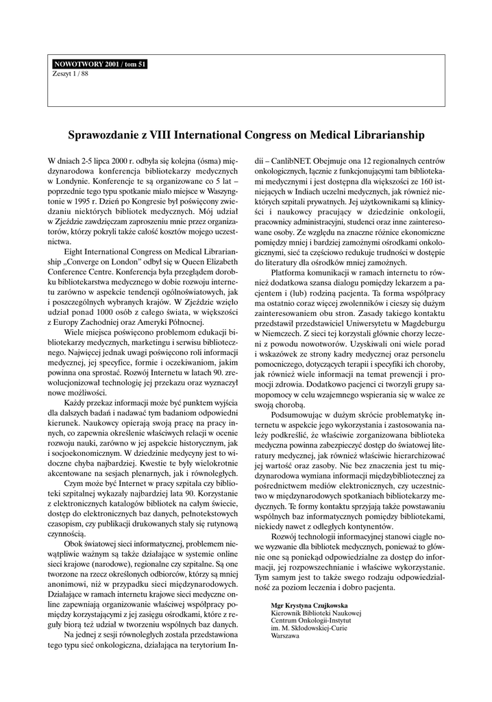 NOWOTWORY 2001 / tom 51 Zeszyt 1 / 88 Sprawozdanie z VIII International Congress on Medical Librarianship W dniach 2-5 lipca 2000 r. odby∏a si´ kolejna (ósma) mi´dzynarodowa konferencja bibliotekarzy medycznych w Londynie. Konferencje te sà organizowane co 5 lat – poprzednie tego typu spotkanie mia∏o miejsce w Waszyngtonie w 1995 r. Dzieƒ po Kongresie by∏ poÊwi´cony zwiedzaniu niektórych bibliotek medycznych. Mój udzia∏ w Zjeêdzie zawdzi´czam zaproszeniu mnie przez organizatorów, którzy pokryli tak˝e ca∏oÊç kosztów mojego uczestnictwa. Eight International Congress on Medical Librarianship „Converge on London” odby∏ si´ w Queen Elizabeth Conference Centre. Konferencja by∏a przeglàdem dorobku bibliotekarstwa medycznego w dobie rozwoju internetu zarówno w aspekcie tendencji ogólnoÊwiatowych, jak i poszczególnych wybranych krajów. W Zjeêdzie wzi´∏o udzia∏ ponad 1000 osób z ca∏ego Êwiata, w wi´kszoÊci z Europy Zachodniej oraz Ameryki Pó∏nocnej. Wiele miejsca poÊwi´cono problemom edukacji bibliotekarzy medycznych, marketingu i serwisu bibliotecznego. Najwi´cej jednak uwagi poÊwi´cono roli informacji medycznej, jej specyfice, formie i oczekiwaniom, jakim powinna ona sprostaç. Rozwój Internetu w latach 90. zrewolucjonizowa∏ technologi´ jej przekazu oraz wyznaczy∏ nowe mo˝liwoÊci. Ka˝dy przekaz informacji mo˝e byç punktem wyjÊcia dla dalszych badaƒ i nadawaç tym badaniom odpowiedni kierunek. Naukowcy opierajà swojà prac´ na pracy innych, co zapewnia okreÊlenie w∏aÊciwych relacji w ocenie rozwoju nauki, zarówno w jej aspekcie historycznym, jak i socjoekonomicznym. W dziedzinie medycyny jest to widoczne chyba najbardziej. Kwestie te by∏y wielokrotnie akcentowane na sesjach plenarnych, jak i równoleg∏ych. Czym mo˝e byç Internet w pracy szpitala czy biblioteki szpitalnej wykaza∏y najbardziej lata 90. Korzystanie z elektronicznych katalogów bibliotek na ca∏ym Êwiecie, dost´p do elektronicznych baz danych, pe∏notekstowych czasopism, czy publikacji drukowanych sta∏y si´ rutynowà czynnoÊcià. Obok Êwiatowej sieci informatycznej, problemem niewàtpliwie wa˝nym sà tak˝e dzia∏ajàce w systemie online sieci krajowe (narodowe), regionalne czy szpitalne. Sà one tworzone na rzecz okreÊlonych odbiorców, którzy sà mniej anonimowi, ni˝ w przypadku sieci mi´dzynarodowych. Dzia∏ajàce w ramach internetu krajowe sieci medyczne online zapewniajà organizowanie w∏aÊciwej wspó∏pracy pomi´dzy korzystajàcymi z jej zasi´gu oÊrodkami, które z regu∏y biorà te˝ udzia∏ w tworzeniu wspólnych baz danych. Na jednej z sesji równoleg∏ych zosta∏a przedstawiona tego typu sieç onkologiczna, dzia∏ajàca na terytorium In- dii – CanlibNET. Obejmuje ona 12 regionalnych centrów onkologicznych, ∏àcznie z funkcjonujàcymi tam bibliotekami medycznymi i jest dost´pna dla wi´kszoÊci ze 160 istniejàcych w Indiach uczelni medycznych, jak równie˝ niektórych szpitali prywatnych. Jej u˝ytkownikami sà klinicyÊci i naukowcy pracujàcy w dziedzinie onkologii, pracownicy administracyjni, studenci oraz inne zainteresowane osoby. Ze wzgl´du na znaczne ró˝nice ekonomiczne pomi´dzy mniej i bardziej zamo˝nymi oÊrodkami onkologicznymi, sieç ta cz´Êciowo redukuje trudnoÊci w dost´pie do literatury dla oÊrodków mniej zamo˝nych. Platforma komunikacji w ramach internetu to równie˝ dodatkowa szansa dialogu pomi´dzy lekarzem a pacjentem i (lub) rodzinà pacjenta. Ta forma wspó∏pracy ma ostatnio coraz wi´cej zwolenników i cieszy si´ du˝ym zainteresowaniem obu stron. Zasady takiego kontaktu przedstawi∏ przedstawiciel Uniwersytetu w Magdeburgu w Niemczech. Z sieci tej korzystali g∏ównie chorzy leczeni z powodu nowotworów. Uzyskiwali oni wiele porad i wskazówek ze strony kadry medycznej oraz personelu pomocniczego, dotyczàcych terapii i specyfiki ich choroby, jak równie˝ wiele informacji na temat prewencji i promocji zdrowia. Dodatkowo pacjenci ci tworzyli grupy samopomocy w celu wzajemnego wspierania si´ w walce ze swojà chorobà. Podsumowujàc w du˝ym skrócie problematyk´ internetu w aspekcie jego wykorzystania i zastosowania nale˝y podkreÊliç, ˝e w∏aÊciwie zorganizowana biblioteka medyczna powinna zabezpieczyç dost´p do Êwiatowej literatury medycznej, jak równie˝ w∏aÊciwie hierarchizowaç jej wartoÊç oraz zasoby. Nie bez znaczenia jest tu mi´dzynarodowa wymiana informacji mi´dzybibliotecznej za poÊrednictwem mediów elektronicznych, czy uczestnictwo w mi´dzynarodowych spotkaniach bibliotekarzy medycznych. Te formy kontaktu sprzyjajà tak˝e powstawaniu wspólnych baz informatycznych pomi´dzy bibliotekami, niekiedy nawet z odleg∏ych kontynentów. Rozwój technologii informacyjnej stanowi ciàgle nowe wyzwanie dla bibliotek medycznych, poniewa˝ to g∏ównie one sà poniekàd odpowiedzialne za dost´p do informacji, jej rozpowszechnianie i w∏aÊciwe wykorzystanie. Tym samym jest to tak˝e swego rodzaju odpowiedzialnoÊç za poziom leczenia i dobro pacjenta. Mgr Krystyna Czujkowska Kierownik Biblioteki Naukowej Centrum Onkologii-Instytut im. M. Sk∏odowskiej-Curie Warszawa