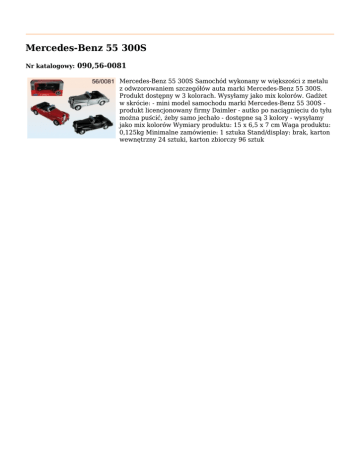 Mercedes-Benz 55 300S Nr katalogowy: 090,56-0081 Mercedes-Benz 55 300S Samochód wykonany w większości z metalu z odwzorowaniem szczegółów auta marki Mercedes-Benz 55 300S. Produkt dostępny w 3 kolorach. Wysyłamy jako mix kolorów. Gadżet w skrócie: - mini model samochodu marki Mercedes-Benz 55 300S produkt licencjonowany firmy Daimler - autko po naciągnięciu do tyłu można puścić, żeby samo jechało - dostępne są 3 kolory - wysyłamy jako mix kolorów Wymiary produktu: 15 x 6,5 x 7 cm Waga produktu: 0,125kg Minimalne zamówienie: 1 sztuka Stand/display: brak, karton wewnętrzny 24 sztuki, karton zbiorczy 96 sztuk