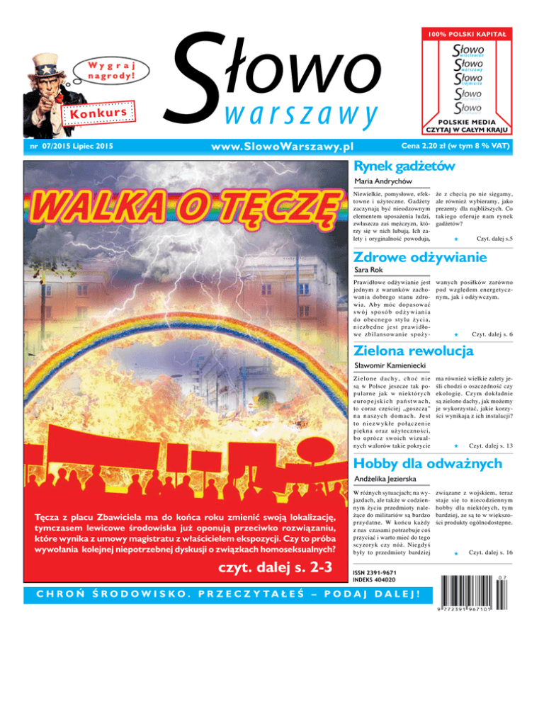 Słowo numeru str 1 100% polski kapitał Konkurs nr 07/2015 Lipiec 2015 Polskie media Czytaj w całym Kraju www.SlowoWarszawy.pl Cena 2.20 zł (w tym 8 % VAT) Rynek gadżetów Maria Andrychów Niewielkie, pomysłowe, efektowne i użyteczne. Gadżety zaczynają być nieodzownym elementem uposażenia ludzi, zwłaszcza zaś mężczyzn, którzy się w nich lubują. Ich zalety i oryginalność powodują, że z chęcią po nie sięgamy, ale również wybieramy, jako prezenty dla najbliższych. Co takiego oferuje nam rynek gadżetów? Czyt. dalej s.5 Zdrowe odżywianie Sara Rok Prawidłowe odżywianie jest wanych posiłków zarówno jednym z warunków zacho- pod względem energetyczwania dobrego stanu zdro- nym, jak i odżywczym. wia. Aby móc dopasować swój sposób odżywiania do obecnego stylu życia, niezbędne jest prawidłowe zbilansowanie spożyCzyt. dalej s. 6 Zielona rewolucja Sławomir Kamieniecki Zielone dachy, choć nie są w Polsce jeszcze tak popularne jak w niektórych europejskich państwach, to coraz częściej „goszczą” na naszych domach. Jest to niezwykłe połączenie piękna oraz użyteczności, bo oprócz swoich wizualnych walorów takie pokrycie ma również wielkie zalety jeśli chodzi o oszczędność czy ekologię. Czym dokładnie są zielone dachy, jak możemy je wykorzystać, jakie korzyści wynikają z ich instalacji? Czyt. dalej s. 13 Hobby dla odważnych Andżelika Jezierska Tęcza z placu Zbawiciela ma do końca roku zmienić swoją lokalizację, tymczasem lewicowe środowiska już oponują przeciwko rozwiązaniu, które wynika z umowy magistratu z właścicielem ekspozycji. Czy to próba wywołania kolejnej niepotrzebnej dyskusji o związkach homoseksualnych? czyt. dalej s. 2-3 W różnych sytuacjach; na wyjazdach, ale także w codziennym życiu przedmioty należące do militariów są bardzo przydatne. W końcu każdy z nas czasami potrzebuje coś przyciąć i warto mieć do tego scyzoryk czy nóż. Niegdyś były to przedmioty bardziej Czyt. dalej s. 16 ISSN 2391-9671 INDEKS 404020 C H R O Ń Ś R O D OW I S KO. P R Z E C Z Y TA Ł E Ś – P O DA J DA L E J ! Słowo Krakowa Gazeta lokalna związane z wojskiem, teraz staje się to niecodziennym hobby dla niektórych, tym bardziej, ze są to w większości produkty ogólnodostępne. czwartek, 24 marca 2011 Wstępniak Spis treści str 2 Lipiec Temat Numeru Antoni Sorocki – Tęcza zniknie z pl. Zbawiciela, ale lewica nie odpuści – s. 2-3 Co się działo W Poznaniu – s. 4 W Polsce – s. 5 W Gospodarce – s.5 Tęcza zniknie z placu Zbawiciela, ale lewica nie odpuści Antoni Sorocki Można powiedzieć, że tęcza z Placu Zbawiciela znowu płonie, choć tym razem jest to ogień emocji i dyskusji, który został rozpalony na nowo. Roznieciła go z jednej strony informacja o przeniesieniu instalacji w inne miejsce w Warszawie, z drugiej zaś decyzja Sądu Najwyższego USA nakazująca de facto wszystkim stanom zalegalizowanie małżeństw jednopłciowych, a która głośnym echem odbiła się również nad Wisłą. Styl Życia Maria Andrychów – Wakacje dla czworonogów – s. 6 Patrycja Jasińska – Podologia, czyli zdrowe stopy na co dzień – s. 19 Maria Andrychów – Zdrowie naszych stawów – s. 20 Twój Relax Marcin Polak – Paintball – s. 7 Marta Pietrzak – Miejsce, gdzie czas płynie wolniej – s. 9 Marian Bąk – Hel, czyli początek i koniec Polski – s. 10 Andżelika Jezierska – Hobby dla odważnych – s. 16 Sara Rok – Zalety hipoterapii. Park Gostynińsko-Włocławski – s. 18 Twój Dom Grażyna Kozak – Okna dla naszego domu – s. 11 Marcin Bartnicki – Nie pali się? – s. 12 Maria Andrychów – Obraz nie istnieje bez ramy – s. 13 Słowo dla Seniora Grażyna Kozak – Bariery architektoniczne przeszkodą w normalnym życiu – s. 21 Kryzysowa Zorba nad słoneczną Europą nie wskazuje na to, żeby miało to ulec zmianie, a instytucja już poszukuje nowej lokalizacji dla ekspozycji. Mówi się m. in. o placu przed Centrum Sztuki Współczesnej w pobliżu Zamku Ujazdowskiego. Kolorowy łuk od samego początku swojego „życia” budził wielkie kontrowersje, nie tylko w stolicy, ale również w całym kraju. Instalacja na Placu Zbawiciela pojawiła się w czerwcu 2012 roku, a zaproREKLAMA Będzie się działo Lipiec 2015 - s. 22-23 Właścicielem niechlubnej tęczy jest Instytut Adama Mickiewicza. Jego umowa ze stołecznym Ratuszem przewiduje, że na placu Zbawiciela obiekt będzie funkcjonował do końca bieżącego roku. Obecnie nic Mikołaj Kamiński Wokół nas już wakacje - piękny, słoneczny lipiec. Nowy numer Słowa Warszawy już w Państwa rękach i choć wydaje się, że czas ten winien być okresem tzw. sezonu ogórkowego, tym razem szykuje się przed nami lato gorące nie tylko ze względu na temperaturę powietrza wokół nas. Sytuacja w Polsce, której spokojnym przez wiele lat życiem, jakie wyznaczały słabe, choć popularne wśród Polaków rządy Platformy Obywatelskiej, wstrząsnęła dość mocno afera taśmowa reaktywowana aktami ujawnionymi przez Zbigniewa Stonogę, przede wszystkim zaś jednak chyba niespodziewane jeszcze parę miesięcy temu zwycięstwo Andrzeja Dudy, znacząco przyspiesza. Nie o tym jednak mówi dzisiaj cała Europa. Główny temat to tzw. Grexit – czyli zaostrzenie się sytuacji Grecji, której negocjacje z „przedstawicielami mocarstw” (bo tak to przecież, używając żargonu dwudziestolecia międzywojennego, trzeba nazwać) utknęły w martwym punkcie. Niektórzy złorzeczą na leniwych i roszczeniowych Greków, inni z kolei atakują światowy system bankowo-polityczny, nazywają go „banksterskim”. Obie grupy wydają się mieć racje – ale nie to jest w tym momencie najważniejsze. Czar prysł, bańka mydlana pęka na naszych oczach – co się stanie, kiedy ten moment przyjdzie także do nas, którzy nawet teraz żyjemy na niższym poziomie, niż Grecy w ostrym kryzysie, mimo swojej „zielonowyspowości”