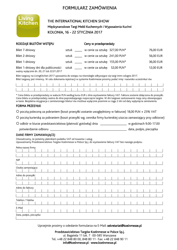 FORMULARZ ZAMÓWIENIA THE INTERNATIONAL KITCHEN SHOW Międzynarodowe Targi Mebli Kuchennych i Wyposażenia Kuchni KOLONIA, 16 16 - 22 STYCZNIA 2017 2017 RODZAJE BILETÓW WSTĘPU Ceny w przedsprzedaży Bilet 7-dniowy sztuk _____ w cenie za sztukę: 327,00 PLN* 76,00 EUR Bilet 2-dniowy sztuk _____ w cenie za sztukę: 241,00 PLN* 56,00 EUR Bilet 1-dniowy sztuk _____ w cenie za sztukę: 155,00 PLN* 36,00 EUR Bilet 1-dniowy dni dla publiczności sztuk _____ w cenie za sztukę: 52,00 PLN* 12,00 EUR ważny wyłącznie dn. 20, 21 lub 22.01.2017 Bilet targowy na LivingKitchen 2017 upoważnia do wstępu na równolegle odbywające się targi imm cologne 2017. Bilet targowy jest imienny. W celu dokonania rejestracji w systemie Koelnmesse prosimy podać imię i nazwisko uczestnika/-ów. * Cena biletu w przedsprzedaży w walucie PLN według kursu EUR z dnia wystawienia faktury VAT. Faktura zostanie dołączona do przesyłki. Cena biletu w przedsprzedaży ważna do dnia poprzedzającego rozpoczęcie targów. W dni targowe zastosowanie mają ceny obowiązujące w kasie. Bezpłatna rezygnacja z zamówionego biletu/-ów możliwa wyłącznie pisemnie w ciągu 2 dni od daty wpłynięcia zamówienia. FORMA PRZESYŁKI pocztą poleconą za pobraniem (koszt przesyłki zostanie uwzględniony w fakturze) 18,00 PLN + 23% VAT pocztą kurierską za pobraniem (koszt przesyłki wg. cennika firmy kurierskiej uiszcza zamawiający przy odbiorze) odbiór w biurze przedstawicielstwa (płatność gotówką) dnia __________________ w godzinach 9.00-17.00 potwierdzenie odbioru ____________________________________________________ data, podpis, pieczątka DANE FIRMY ZAMAWIAJĄCEJ Oświadczamy, że jesteśmy płatnikiem podatku VAT od towarów i usług. Upoważniamy Przedstawicielstwo Targów Koelnmesse w Polsce Sp.j. do wystawienia faktury VAT bez naszego podpisu. Pełna nazwa firmy NIP Osoba zamawiająca Adres do przesyłki Adres do faktury Telefon / Telefax E-Mail Data, podpis, pieczątka Uprzejmie prosimy o odesłanie formularza na E-Mail: [email protected] Przedstawicielstwo Targów Koelnmesse w Polsce Sp.j. ul. Bagatela 11 lok. 7 · 00-585 Warszawa Tel. +48 22 848 80 00, 848 80 11 · Fax: +48 22 848 90 11 [email protected] · www.koelnmesse.pl