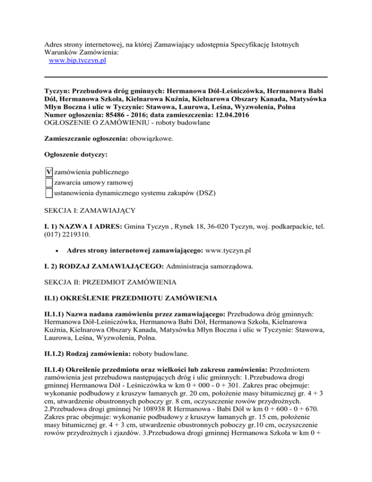 Adres strony internetowej, na której Zamawiający udostępnia Specyfikację Istotnych Warunków Zamówienia: www.bip.tyczyn.pl Tyczyn: Przebudowa dróg gminnych: Hermanowa Dół-Leśniczówka, Hermanowa Babi Dół, Hermanowa Szkoła, Kielnarowa Kuźnia, Kielnarowa Obszary Kanada, Matysówka Młyn Boczna i ulic w Tyczynie: Stawowa, Laurowa, Leśna, Wyzwolenia, Polna Numer ogłoszenia: 85486 - 2016; data zamieszczenia: 12.04.2016 OGŁOSZENIE O ZAMÓWIENIU - roboty budowlane Zamieszczanie ogłoszenia: obowiązkowe. Ogłoszenie dotyczy: V zamówienia publicznego zawarcia umowy ramowej ustanowienia dynamicznego systemu zakupów (DSZ) SEKCJA I: ZAMAWIAJĄCY I. 1) NAZWA I ADRES: Gmina Tyczyn , Rynek 18, 36-020 Tyczyn, woj. podkarpackie, tel. (017) 2219310. Adres strony internetowej zamawiającego: www.tyczyn.pl I. 2) RODZAJ ZAMAWIAJĄCEGO: Administracja samorządowa. SEKCJA II: PRZEDMIOT ZAMÓWIENIA II.1) OKREŚLENIE PRZEDMIOTU ZAMÓWIENIA II.1.1) Nazwa nadana zamówieniu przez zamawiającego: Przebudowa dróg gminnych: Hermanowa Dół-Leśniczówka, Hermanowa Babi Dół, Hermanowa Szkoła, Kielnarowa Kuźnia, Kielnarowa Obszary Kanada, Matysówka Młyn Boczna i ulic w Tyczynie: Stawowa, Laurowa, Leśna, Wyzwolenia, Polna. II.1.2) Rodzaj zamówienia: roboty budowlane. II.1.4) Określenie przedmiotu oraz wielkości lub zakresu zamówienia: Przedmiotem zamówienia jest przebudowa następujących dróg i ulic gminnych: 1.Przebudowa drogi gminnej Hermanowa Dół - Leśniczówka w km 0 + 000 - 0 + 301. Zakres prac obejmuje: wykonanie podbudowy z kruszyw łamanych gr. 20 cm, położenie masy bitumicznej gr. 4 + 3 cm, utwardzenie obustronnych poboczy gr. 8 cm, oczyszczenie rowów przydrożnych. 2.Przebudowa drogi gminnej Nr 108938 R Hermanowa - Babi Dół w km 0 + 600 - 0 + 670. Zakres prac obejmuje: wykonanie podbudowy z kruszyw łamanych gr. 15 cm, położenie masy bitumicznej gr. 4 + 3 cm, utwardzenie obustronnych poboczy gr.10 cm, oczyszczenie rowów przydrożnych i zjazdów. 3.Przebudowa drogi gminnej Hermanowa Szkoła w km 0 + 000 - 0 + 268.Zakres prac obejmuje: regulację studzienek, wykonanie koryta drogi, wykonanie podbudowy z kruszyw łamanych gr. 20 + 15 cm, położenie masy bitumicznej gr. 4 + 3 cm, utwardzenie obustronnych poboczy gr. 8 cm, oczyszczenie rowów przydrożnych i przepustów. 4.Przebudowa drogi gminnej Nr 108925R Kielnarowa Kuźnia w km 0 + 400 - 0 + 607. Zakres prac obejmuje: wykonanie podbudowy z kruszyw łamanych gr. 15 cm, położenie masy bitumicznej gr. 4 + 3 cm, utwardzenie obustronnych poboczy gr. 8 cm, oczyszczenie rowów z namułu ułożenie korytek ściekowych, oczyszczenie zjazdów. 5.Przebudowa drogi gminnej Nr 108927 R Kielnarowa Obszary Kanada w km 0 + 000 - 0 + 086. Zakres prac obejmuje: rozebranie nawierzchni z płyt drogowych, podbudowa z kruszyw łamanych gr. 20 + 15 cm, położenie masy bitumicznej gr. 4 + 3 cm, utwardzenie poboczy gr. 8 cm, ułożenie ścieków z elementów betonowych, utwardzenie zjazdów. 6. Przebudowa drogi gminnej Matysówka Młyn Boczna w km 0 + 220 - 0 + 490. Zakres prac obejmuje: profilowanie koryta drogi, wykonanie podbudowy z kruszyw łamanych gr. 15 cm, położenie masy bitumicznej gr. 4 + 3 cm, utwardzenie poboczy gr. 8 cm, wykonanie zjazdów podbudowa z kruszyw gr. 15 cm, wykonanie mijanek 22,7 m2, ułożenie ścieków z elementów betonowych, oczyszczenie rowu z namułu. 7.Przebudowa drogi gminnej - ul. Stawowej w Tyczynie w km 0 + 193 - 0 + 442. Zakres prac obejmuje: regulację pionową studzienek, profilowanie koryta drogi, wykonanie podbudowy z kruszyw łamanych gr. 15 cm, położenie masy bitumicznej gr. 4 + 3 cm, utwardzenie obustronnych poboczy gr. 8 cm, wykonanie mijanek 48,84 m2,wykonanie zjazdów, oczyszczenie rowu z namułu, ułożenie ścieków z elementów betonowych. 8.Przebudowa drogi gminnej - ul. Laurowej w Tyczynie w km 0 + 000 - 0 111. Zakres prac obejmuje: rozebranie krawężników betonowych 45,5 m, profilowanie koryta drogi, wykonanie podbudowy z kruszyw łamanych gr. 8 cm, położenie masy bitumicznej gr. 4 + 3 cm, utwardzenie zjazdów, utwardzenie obustronnych poboczy gr. 8 cm. 9.Przebudowa drogi gminnej - ul. Leśnej w Tyczynie w km 0 + 637 - 0 + 940. Zakres prac obejmuje: wykonanie poszerzeń, profilowanie koryta drogi, wykonanie podbudowy z kruszyw gr. 15 + 8 cm, położenie masy bitumicznej gr. 4 + 3 cm, utwardzenie obustronnych poboczy gr. 8 cm, przebudowę przepustów, utwardzenie zjazdów. 10.Przebudowa drogi gminnej - ul. Wyzwolenia w Tyczynie w km 0+333 - 0+565. Zakres prac obejmuje: roboty przygotowawcze i rozbiórkowe, roboty ziemne, wykonanie podbudowy pospółka gr. 15 cm, stabilizacja gruntu gr. 15 cm, ułożenie krawężnika 360 mb, położenie masy bitumicznej gr. 4 + 3 cm, wykonanie obustronnych poboczy gr. 7 cm, wykonanie odwodnienia, roboty wykończeniowe. 11.Przebudowa drogi gminnej - ul. Polnej w Tyczynie w km 0+577 0+834.Zakres prac obejmuje: profilowanie koryta drogi, wykonanie podbudowy z kruszyw łamanych gr. 5+ 15 cm, położenie masy bitumicznej gr. 4 + 3 cm, wykonanie obustronnych poboczy gr. 7 cm, oczyszczenie rowu z namułu. Szczegółowy opis przedmiotu zamówienia został określony w projektach technicznych, specyfikacji technicznej wykonania i odbioru robót budowlanych oraz w przedmiarach robót, dokumenty te stanowią załączniki do SIWZ.. II.1.5) V przewiduje się udzielenie zamówień uzupełniających: Określenie przedmiotu oraz wielkości lub zakresu zamówień uzupełniających Zamawiający przewiduje udzielenie zamówień uzupełniających, o których mowa w art. 67 ust. 1 pkt 6 ustawy Pzp do wysokości 15% wartości zamówienia podstawowego, polegających na powtórzeniu tego samego rodzaju robót II.1.6) Wspólny Słownik Zamówień (CPV): 45.23.31.41-9, 45.23.31.42-6. II.1.7) Czy dopuszcza się złożenie oferty częściowej: nie. II.1.8) Czy dopuszcza się złożenie oferty wariantowej: nie. II.2) CZAS TRWANIA ZAMÓWIENIA LUB TERMIN WYKONANIA: Zakończeni