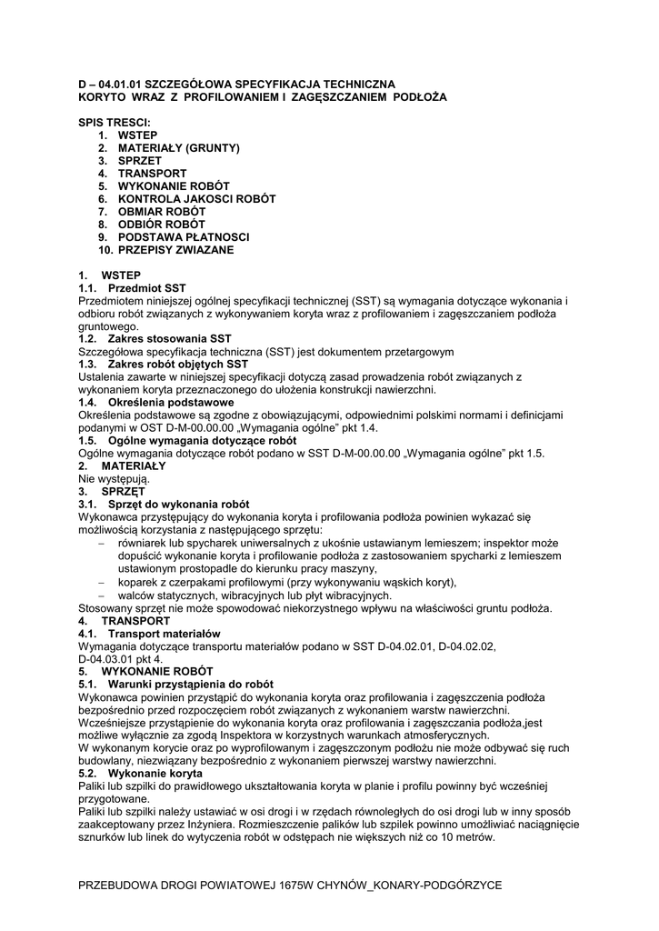 D – 04.01.01 SZCZEGÓŁOWA SPECYFIKACJA TECHNICZNA KORYTO WRAZ Z PROFILOWANIEM I ZAGĘSZCZANIEM PODŁOŻA SPIS TRESCI: 1. WSTEP 2. MATERIAŁY (GRUNTY) 3. SPRZET 4. TRANSPORT 5. WYKONANIE ROBÓT 6. KONTROLA JAKOSCI ROBÓT 7. OBMIAR ROBÓT 8. ODBIÓR ROBÓT 9. PODSTAWA PŁATNOSCI 10. PRZEPISY ZWIAZANE 1. WSTEP 1.1. Przedmiot SST Przedmiotem niniejszej ogólnej specyfikacji technicznej (SST) są wymagania dotyczące wykonania i odbioru robót związanych z wykonywaniem koryta wraz z profilowaniem i zagęszczaniem podłoża gruntowego. 1.2. Zakres stosowania SST Szczegółowa specyfikacja techniczna (SST) jest dokumentem przetargowym 1.3. Zakres robót objętych SST Ustalenia zawarte w niniejszej specyfikacji dotyczą zasad prowadzenia robót związanych z wykonaniem koryta przeznaczonego do ułożenia konstrukcji nawierzchni. 1.4. Określenia podstawowe Określenia podstawowe są zgodne z obowiązującymi, odpowiednimi polskimi normami i definicjami podanymi w OST D-M-00.00.00 „Wymagania ogólne” pkt 1.4. 1.5. Ogólne wymagania dotyczące robót Ogólne wymagania dotyczące robót podano w SST D-M-00.00.00 „Wymagania ogólne” pkt 1.5. 2. MATERIAŁY Nie występują. 3. SPRZĘT 3.1. Sprzęt do wykonania robót Wykonawca przystępujący do wykonania koryta i profilowania podłoża powinien wykazać się możliwością korzystania z następującego sprzętu: równiarek lub spycharek uniwersalnych z ukośnie ustawianym lemieszem; inspektor może dopuścić wykonanie koryta i profilowanie podłoża z zastosowaniem spycharki z lemieszem ustawionym prostopadle do kierunku pracy maszyny, koparek z czerpakami profilowymi (przy wykonywaniu wąskich koryt), walców statycznych, wibracyjnych lub płyt wibracyjnych. Stosowany sprzęt nie może spowodować niekorzystnego wpływu na właściwości gruntu podłoża. 4. TRANSPORT 4.1. Transport materiałów Wymagania dotyczące transportu materiałów podano w SST D-04.02.01, D-04.02.02, D-04.03.01 pkt 4. 5. WYKONANIE ROBÓT 5.1. Warunki przystąpienia do robót Wykonawca powinien przystąpić do wykonania koryta oraz profilowania i zagęszczenia podłoża bezpośrednio przed rozpoczęciem robót związanych z wykonaniem warstw nawierzchni. Wcześniejsze przystąpienie do wykonania koryta oraz profilowania i zagęszczania podłoża,jest możliwe wyłącznie za zgodą Inspektora w korzystnych warunkach atmosferycznych. W wykonanym korycie oraz po wyprofilowanym i zagęszczonym podłożu nie może odbywać się ruch budowlany, niezwiązany bezpośrednio z wykonaniem pierwszej warstwy nawierzchni. 5.2. Wykonanie koryta Paliki lub szpilki do prawidłowego ukształtowania koryta w planie i profilu powinny być wcześniej przygotowane. Paliki lub szpilki należy ustawiać w osi drogi i w rzędach równoległych do osi drogi lub w inny sposób zaakceptowany przez Inżyniera. Rozmieszczenie palików lub szpilek powinno umożliwiać naciągnięcie sznurków lub linek do wytyczenia robót w odstępach nie większych niż co 10 metrów. PRZEBUDOWA DROGI POWIATOWEJ 1675W CHYNÓW_KONARY-PODGÓRZYCE Rodzaj sprzętu, a w szczególności jego moc należy dostosować do rodzaju gruntu, w którym prowadzone są roboty i do trudności jego odspojenia. Koryto można wykonywać ręcznie, gdy jego szerokość nie pozwala na zastosowanie maszyn, na przykład na poszerzeniach lub w przypadku robót o małym zakresie. Sposób wykonania musi być zaakceptowany przez Inżyniera. Grunt odspojony w czasie wykonywania koryta powinien być wykorzystany zgodnie z ustaleniami dokumentacji projektowej i SST, tj. wbudowany w nasyp lub odwieziony na odkład w miejsce wskazane przez Inżyniera. Profilowanie i zagęszczenie podłoża należy wykonać zgodnie z zasadami określonymi w pkt 5.4. 5.3. Profilowanie i zagęszczanie podłoża Przed przystąpieniem do profilowania podłoże powinno być oczyszczone ze wszelkich zanieczyszczeń. Po oczyszczeniu powierzchni podłoża należy sprawdzić, czy istniejące rzędne terenu umożliwiają uzyskanie po profilowaniu zaprojektowanych rzędnych podłoża. Zaleca się, aby rzędne terenu przed profilowaniem były o co najmniej 5 cm wyższe niż projektowane rzędne podłoża. Jeżeli powyższy warunek nie jest spełniony i występują zaniżenia poziomu w podłożu przewidzianym do profilowania, Wykonawca powinien spulchnić podłoże na głębokość zaakceptowaną przez Inżyniera, dowieźć dodatkowy grunt spełniający wymagania obowiązujące dla górnej strefy korpusu, w ilości koniecznej do uzyskania wymaganych rzędnych wysokościowych i zagęścić warstwę do uzyskania wartości wskaźnika zagęszczenia, określonych w tablicy 1. Do profilowania podłoża należy stosować równiarki. Ścięty grunt powinien być wykorzystany w robotach ziemnych lub w inny sposób zaakceptowany przez Inżyniera. Bezpośrednio po profilowaniu podłoża należy przystąpić do jego zagęszczania. Zagęszczanie podłoża należy kontynuować do osiągnięcia wskaźnika zagęszczenia nie mniejszego od podanego w tablicy 1. Wskaźnik zagęszczenia należy określać zgodnie z BN-77/8931-12 [5]. Tablica 1. Minimalne wartości wskaźnika zagęszczenia podłoża (Is) Strefa korpusu Górna warstwa o grubości 20 cm Na głębokości od 20 do 50 cm od powierzchni podłoża Minimalna wartość Is dla: Autostrad i dróg Innych dróg ekspresowych Ruch Ruch mniejszy ciężki od ciężkiego i bardzo ciężki 1,03 1,00 1,00 1,00 1,00 0,97 W przypadku, gdy gruboziarnisty materiał tworzący podłoże uniemożliwia przeprowadzenie badania zagęszczenia, kontrolę zagęszczenia należy oprzeć na metodzie obciążeń płytowych. Należy określić pierwotny i wtórny moduł odkształcenia podłoża według BN-64/8931-02 [3]. Stosunek wtórnego i pierwotnego modułu odkształcenia nie powinien przekraczać 2,2. Wilgotność gruntu podłoża podczas zagęszczania powinna być równa wilgotności optymalnej z tolerancją od -20% do +10%. 5.4. Utrzymanie koryta oraz wypr