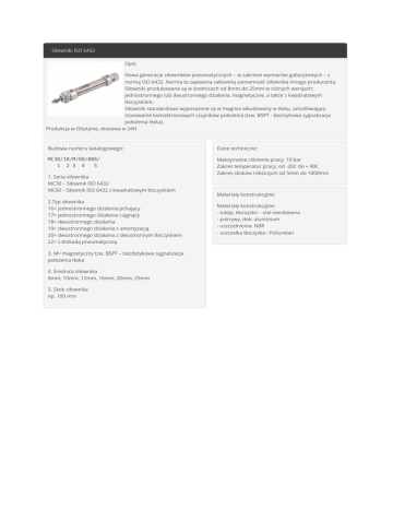 Siłowniki ISO 6432 Opis: Nowa generacja siłowników pneumatycznych – w zakresie wymiarów gabarytowych – z normą ISO 6432. Norma ta zapewnia całkowitą zamienność siłownika innego producenta. Siłowniki produkowane są w średnicach od 8mm do 25mm w różnych wersjach: jednostronnego lub dwustronnego działania, magnetyczne, a także z kwadratowym tłoczyskiem. Siłowniki standardowo wyposażone są w magnes wbudowany w tłoku, umożliwiający stosowanie kontaktronowych czujników położenia (tzw. BSPT - bezstykowa sygnalizacja położenia tłoka). Produkcja w Olsztynie, dostawa w 24H Budowa numeru katalogowego: Dane techniczne: MC30/18/M/00/000/ 1 2 3 4 5 Maksymalne ciśnienie pracy: 10 bar Zakres temperatur pracy: od -20C do + 90C Zakres skoków roboczych od 5mm do 1000mm 1. Seria siłownika MC30 – Siłownik ISO 6432 MC60 - Siłownik ISO 6432 z kwadratowym tłoczyskiem 2.Typ siłownika 16= jednostronnego działania pchający 17= jednostronnego działania ciągnący 18= dwustronnego działania 19= dwustronnego działania z amortyzacją 20= dwustronnego działania z dwustronnym tłoczyskiem 22= z blokadą pneumatyczną 3. M= magnetyczny tzw. BSPT – bezdotykowa sygnalizacja położenia tłoka 4. Średnica siłownika 8mm, 10mm, 12mm, 16mm, 20mm, 25mm 5. Skok siłownika np. 100 mm Materiały konstrukcyjne: Materiały konstrukcyjne: - tuleja, tłoczysko – stal nierdzewna - pokrywy, tłok: aluminium - uszczelnienia: NBR - uszczelka tłoczyska : Poliuretan Rysunek techniczny: