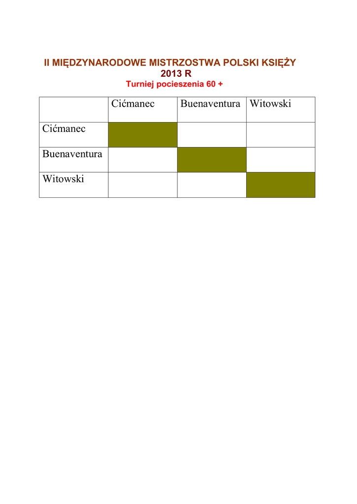 II MIĘDZYNARODOWE MISTRZOSTWA POLSKI KSIĘŻY 2013 R Turniej pocieszenia 60 + Cićmanec Cićmanec Buenaventura Witowski Buenaventura Witowski