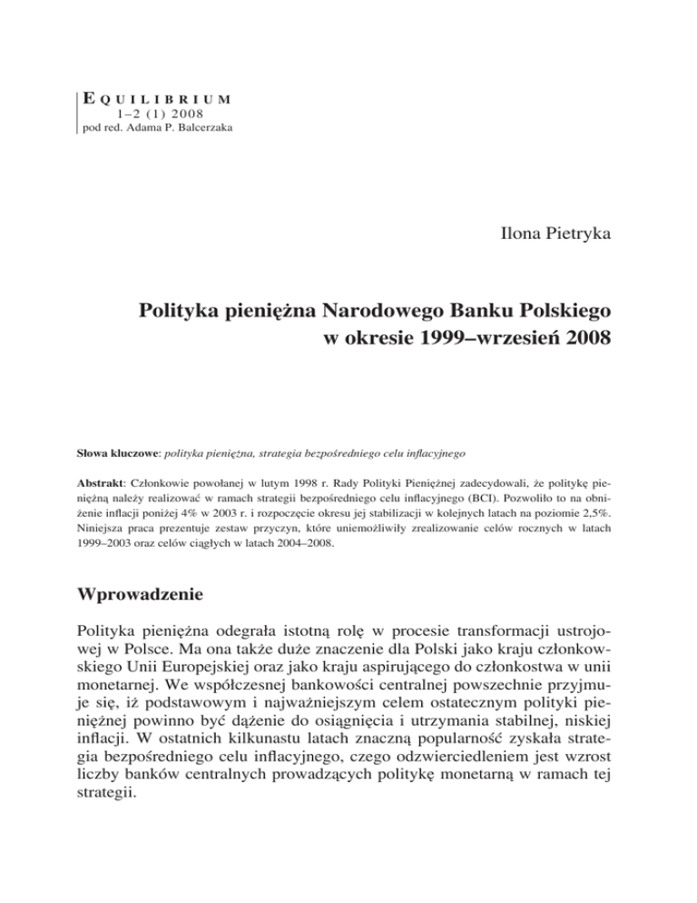 Equilibrium 1–2 (1) 2008 pod red. Adama P. Balcerzaka Ilona Pietryka Polityka pieniężna Narodowego Banku Polskiego w okresie 1999–wrzesień 2008 Słowa kluczowe: polityka pieniężna, strategia bezpośredniego celu inflacyjnego Abstrakt: Członkowie powołanej w lutym 1998 r. Rady Polityki Pieniężnej zadecydowali, że politykę pieniężną należy realizować w ramach strategii bezpośredniego celu inflacyjnego (BCI). Pozwoliło to na obniżenie inflacji poniżej 4% w 2003 r. i rozpoczęcie okresu jej stabilizacji w kolejnych latach na poziomie 2,5%. Niniejsza praca prezentuje zestaw przyczyn, które uniemożliwiły zrealizowanie celów rocznych w latach 1999–2003 oraz celów ciągłych w latach 2004–2008. Wprowadzenie Polityka pieniężna odegrała istotną rolę w procesie transformacji ustrojowej w Polsce. Ma ona także duże znaczenie dla Polski jako kraju członkowskiego Unii Europejskiej oraz jako kraju aspirującego do członkostwa w unii monetarnej. We współczesnej bankowości centralnej powszechnie przyjmuje się, iż podstawowym i najważniejszym celem ostatecznym polityki pieniężnej powinno być dążenie do osiągnięcia i utrzymania stabilnej, niskiej inflacji. W ostatnich kilkunastu latach znaczną popularność zyskała strategia bezpośredniego celu inflacyjnego, czego odzwierciedleniem jest wzrost liczby banków centralnych prowadzących politykę monetarną w ramach tej strategii. 24 Ilona Pietryka Celem pracy jest ocena realizacji celu inflacyjnego oraz stosowania strategii bezpośredniego celu inflacyjnego w Polsce w poszczególnych latach okresu 1999–2008, jak również w perspektywie długookresowej. Materiał źródłowy niniejszej pracy stanowiły publikacje poświęcone polityce pieniężnej, systemowi bankowemu i rynkowi pieniężnemu. Wykorzystano również publikowane rokrocznie raporty Narodowego Banku Polskiego, założenia polityki pieniężnej i sprawozdania z jej realizacji. Realizacja celu inflacyjnego w Polsce w okresie 1999–wrzesień 2008 Rok 1997 zakończył pewien etap w ewolucji strategii polityki pieniężnej w Polsce. Wskutek nowo uchwalonej Konstytucji RP, która weszła w życie 17 października 1997 r., oraz nowej ustawy o NBP obowiązującej od 1 stycznia 1998 r., polityka pieniężna była realizowana w nowych ramach prawnych i instytucjonalnych1. Nowy organ decyzyjny – Rada Polityki Pieniężnej ukonstytuowała się na mocy ustawy dopiero w lutym 1998 r., założenia polityki pieniężnej na rok 1998 zostały sformułowane i przyjęte przez Prezesa i Zarząd NBP w październiku 1997 r. Wykazują one, że NBP deklarował kontynuację strategii monetarnej: celem finalnym będzie inflacja, celem pośrednim – podaż pieniądza, celem operacyjnym – krótkoterminowe stopy procentowe. Na pierwszym spotkaniu, pod koniec lutego 1998 r., RPP wprowadziła nową strategię polityki monetarnej, tj. strategię bezpośredniego celu inflacyjnego (BCI). Formalnie nie była ona wdrażana w 1998 r., jednakże zarówno podjęte decyzje, jak i same deklaracje RPP do przyjęcia BCI wskazują, że w 1998 r. NBP powoli przechodził na tę strategię2. Strategia bezpośredniego celu inflacyjnego (BCI) zakłada brak celów pośrednich. Bank centralny nie koncentruje się na pojedynczym wskaźniku, bierze natomiast pod uwagę każdą dostępną informację o czynnikach, zagrażających wykonaniu przyjętego na dany rok celu inflacyjnego. Realizując ten cel, bank centralny wykorzystuje wszelkie dostępne instrumenty polityki pieniężnej3. RPP uznała, że jest to najkorzystniejsze rozwiązanie ze względu na wzrost stopnia integracji Polski z gospodarką światową (UE 1 Sprawozdanie z wykonania założeń polityki pieniężnej w 1998 roku, NBP, Warszawa 1999, s. 154. 2 Na podstawie W. Przybylska-Kapuścińska, Ocena realizacji polityki pieniężnej Narodowego Banku Polskiego, [w:] Ład instytucjonalny w gospodarce, seria: Ekonomia i Praca, t. II, pod red. B. Polszakiewicz i J. Boehlke, Wydawnictwo UMK, Toruń 2006, s. 240–241 oraz R. Kokoszczyński, Współczesna polityka pieniężna w Polsce, Polskie Wydawnictwo Ekonomiczne, Warszawa 2004, s. 238. 3 Średniookresowa strategia polityki pieniężnej na lata 1999–2003, NBP, Warszawa 1998, s. 8. Polityka pieniężna Narodowego Banku Polskiego... 25 i Unia Gospodarcza i Walutowa) oraz konieczność przełamywania oczekiwań inflacyjnych4. Otwarcie polskiej gospodarki zwiększyło stopień zależności podmiotów gospodarczych od krajowych i międzynarodowych rynków finansowych oraz prowadzonej polityki makroekonomicznej. W celu zwiększenia stopnia przejrzystości polityki pieniężnej, które będzie skutkowało podejmowaniem bardziej racjonalnych decyzji, rozwojem rynku pieniężnego i walutowego oraz instrumentów na nich wykorzystanych, RPP opublikowała Średniookresową strategię polityki pieniężnej na lata 1999–2003. Zdefiniowano tam cel inflacyjny w horyzoncie średniookresowym, co było kluczowym wymaganiem, jeśli chodzi o realizację strategii BCI5. Celem Rady było bowiem osiągnięcie do 2003 r. 4% inflacji. Natomiast 4% poziom inflacji miał być zrealizowany przez osiąganie corocznych celów, determinowanych w Założeniach polityki pieniężnej na dany rok. Cele te powinny mieć postać wąskiego przedziału docelowego inflacji, ustalonego od razu na rok 1999 na poziomie 8–8,5%. Podstawowym miernikiem inflacji pozostał roczny (licząc od grudnia do grudnia) przyrost indeksu cen towarów i usług (CPI), jako wskaźnik najsilniej zakorzeniony w świadomości społecznej, a jednocześnie konstruowany i ogłaszany przez ośrodek niezależny od NBP (GUS)6. Przyjęta strategia inflacyjna nie miała charakteru formalnego, gdyż nie opierała się na prognozowanej inflacji. Problemy związane z transformowaniem gospodarki oraz zbyt krótkimi szeregami czasowymi danych uniemożliwiły stworzenie wiarygodnej prognozy inflacyjnej. Analitycy z NBP mogli operować wyłącznie 