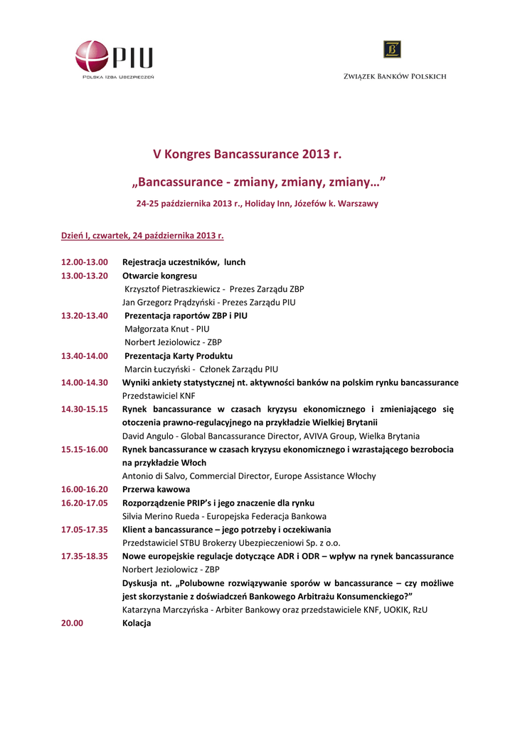 V Kongres Bancassurance 2013 r. „Bancassurance - zmiany, zmiany, zmiany…” 24-25 października 2013 r., Holiday Inn, Józefów k. Warszawy Dzień I, czwartek, 24 października 2013 r. 12.00-13.00 13.00-13.20 13.20-13.40 13.40-14.00 14.00-14.30 14.30-15.15 15.15-16.00 16.00-16.20 16.20-17.05 17.05-17.35 17.35-18.35 20.00 Rejestracja uczestników, lunch Otwarcie kongresu Krzysztof Pietraszkiewicz - Prezes Zarządu ZBP Jan Grzegorz Prądzyński - Prezes Zarządu PIU Prezentacja raportów ZBP i PIU Małgorzata Knut - PIU Norbert Jeziolowicz - ZBP Prezentacja Karty Produktu Marcin Łuczyński - Członek Zarządu PIU Wyniki ankiety statystycznej nt. aktywności banków na polskim rynku bancassurance Przedstawiciel KNF Rynek bancassurance w czasach kryzysu ekonomicznego i zmieniającego się otoczenia prawno-regulacyjnego na przykładzie Wielkiej Brytanii David Angulo - Global Bancassurance Director, AVIVA Group, Wielka Brytania Rynek bancassurance w czasach kryzysu ekonomicznego i wzrastającego bezrobocia na przykładzie Włoch Antonio di Salvo, Commercial Director, Europe Assistance Włochy Przerwa kawowa Rozporządzenie PRIP’s i jego znaczenie dla rynku Silvia Merino Rueda - Europejska Federacja Bankowa Klient a bancassurance – jego potrzeby i oczekiwania Przedstawiciel STBU Brokerzy Ubezpieczeniowi Sp. z o.o. Nowe europejskie regulacje dotyczące ADR i ODR – wpływ na rynek bancassurance Norbert Jeziolowicz - ZBP Dyskusja nt. „Polubowne rozwiązywanie sporów w bancassurance – czy możliwe jest skorzystanie z doświadczeń Bankowego Arbitrażu Konsumenckiego?” Katarzyna Marczyńska - Arbiter Bankowy oraz przedstawiciele KNF, UOKIK, RzU Kolacja Dzień II, piątek, 25 października 2013 r. 8.45-9.00 9.00-9.30 9.30-10.00 10.00-11.00 11.00-11.20 11.20-12.00 12.00-12.30 12.30-13.30 13.30-14.00 14.00 Poranna kawa Konieczne zmiany prawne w zakresie wymiany informacji pomiędzy sektorem ubezpieczeniowym a bankowym Sławomir Grzelczak, Wiceprezes Zarządu BIK S.A. Aktualne trendy i rozwiązania w ochronie konsumenta na rynku usług finansowych w Europie (Polska na tym tle) Małgorzata Surdek - kancelaria Cameron McKenna Założenia merytoryczne dla spodziewanej rekomendacji bancassurance KNF Wojciech Kwaśniak - Zastępca Przewodniczącego KNF Przerwa kawowa Skutki deregulacji zawodu agenta dla działalności bancassurance Katarzyna Przewalska - Zastępca Dyrektora Departamentu Rozwoju Rynku Finansowego, Ministerstwo Finansów z udziałem przedstawiciela ZBP i PIU Ocena polskiego rynku bancassurance z punktu widzenia regulatora, polski punkt widzenia na spodziewaną legislację europejską Katarzyna Przewalska - Zastępca Dyrektora Departamentu Rozwoju Rynku Finansowego, Ministerstwo Finansów Panel nt. przyszłości rynku bancassurance z udziałem prezesów banków i zakładów ubezpieczeń oraz Katarzyny Przewalskiej - Zastępcy Dyrektora Departamentu Rozwoju Rynku Finansowego, Ministerstwo Finansów Podsumowanie kongresu Lunch
