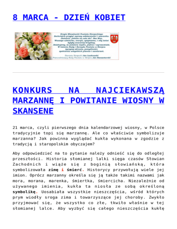 8 MARCA - DZIEŃ KOBIET KONKURS NA NAJCIEKAWSZĄ MARZANNĘ I POWITANIE WIOSNY W SKANSENE 21 marca, czyli pierwszego dnia kalendarzowej wiosny, w Polsce tradycyjnie topi się marzannę. Ale co właściwie symbolizuje marzanna? Jak powinna wyglądać kukła wykonana w zgodzie z tradycją i staropolskim obyczajem? Aby odpowiedzieć na to pytanie należy odnieść się do odległej przeszłości. Historia słomianej lalki sięga czasów Słowian Zachodnich i wiąże się z boginią słowiańską, która symbolizowała zimę i śmierć. Historycy przywołują wiele jej imion. Oprócz marzanny określa się ją także takimi nazwami jak mora, morana, marenka, śmiertka, śmiercicha. Niezależnie od używanego imienia, kukła ta niosła ze sobą określoną symbolikę. Uosabiała wszystkie nieszczęścia, wśród których prym wiodły sroga zima i towarzyszące jej choroby. Zwykło przyjmować się, że wszystko co złe, tkwiło właśnie w tej słomianej lalce. Aby wyzbyć się całego nieszczęścia kukłę topiono bądź palono. A najczęściej wykonywano i jedną i drugą czynność. Ot tak, dla pewności. Z topieniem Marzanny, również obecnie, związane są różne przesądy: nie wolno dotknąć pływającej w wodzie kukły, bo grozi to uschnięciem ręki, obejrzenie się za siebie w drodze powrotnej może spowodować chorobę, a potknięcie i upadek – śmierć w ciągu najbliższego roku. Osobną kwestię stanowił wygląd kukły. Marzanna musiała być ubrana według konkretnych zasad i choć elementy stroju mogły być odmienne dla danej społeczności, stałym elementem była zawsze biała koszula, stanowiąca prawdopodobnie ślad słowiańskiej białej chusty żałobnej. Zimową maszkarę ubierano często w strój druhny weselnej, czyli: białą bluzkę, gorset, kwiecistą spódnicę, fartuch, chustę na ramiona, korale, dziewczęcy wianek z kwiatów, a w słomiane warkocze wplatano barwne wstążki. Co ciekawe, w wielu miejscowościach Śląska Opolskiego dziewczęta uczestniczące w obrzędzie miały stroje i wianki identyczne jak marzanna. Przebiegowi uroczystości towarzyszyło śpiewanie pieśni. Obrzęd kończył się przyniesieniem do wsi, również przy wtórze pieśni, ustrojonego gaika, zwanego też Maikiem, Nowym Latem czy Latkiem, Lateczkiem. Była to gałąź sosnowa lub świerkowa, ozdobiona wstążkami, papierowymi ozdobami, świecidełkami, wydmuszkami, kwiatami, czasem z lalką przymocowaną do wierzchołka. Tak przybrany gaik – symbol wiosny, obnosiły dziewczęta chodząc po wsi od chaty do chaty, otrzymując w zamian od gospodyń obwarzanki, kawałki ciasta, jajka, niekiedy drobne pieniądze. Oprowadzanie gaika miało sprowokować szybsze przybycie wiosny wraz z całą jej płodnością, a tym samym rozpocząć nowy cykl życia. Aby ta efektowna i jakże barwna tradycja wykonywania kukieł symbolizujących zimę nie odeszła w zapomnienie nie potrzeba wbrew pozorom wiele wysiłku. Wystarczy ją kultywować. Dlatego 21 marca 2017 r. w skansenie odbędzie się konkurs na „Najciekawszą Marzannę” oraz towarzysząca mu impreza „Powitanie wiosny”. Serdecznie zachęcamy dzieci i młodzież do zabawy polegającej na wspólnym wykonywaniu słomianej lalki i zgłoszeniu uczestnictwa w konkursie. Przed przystąpieniem do pracy zachęcamy do zapoznania się z regulaminem konkursu, dostępnym na stronie www.mwmskasen.pl. Grupa zgłaszająca pracę do konkursu powinna liczyć co najmniej 3 osoby (zachęcamy do wykonywania prac np. wśród uczniów jednej klasy lub grupy świetlicowej). Z pewnością bardzo szybko przekonacie się, że wspólne tworzenie Marzanny to doskonała zabawa, a jednocześnie okazja do urzeczywistnienia najbardziej oryginalnych pomysłów. Zgodnie z regulaminem konkursu prace powinny nawiązywać do zmiany pór roku – odejścia zimy i przybycia wiosny oraz symbolizować nieszczęścia, choroby, czy też zmartwienia trapiące ludzi w okresie zimowym. Kukły można wykonać w oparciu o dowolną technikę – wszystkie pomysły są mile widziane. Należy jednak pamiętać, że poszczególne części pracy muszą być odpowiednio połączone, by uniknąć jej rozpadu. Wszystkich wykonawców kukieł zachęcamy do zgłoszenia uczestnictwa i udziału w imprezie „Powitanie wiosny w skansenie”, w dniu 21 marca w godz. 10.00 – 14.00. Właśnie wtedy wspólnie, w pięknych okolicznościach przyrody pożegnamy zimę i powitamy wiosnę. Program imprezy przewiduje wiele atrakcji, między innymi: zwiedzanie terenu ekspozycji z przewodnikiem, przejażdżkę wozem i ognisko, przy którym będzie można upiec kiełbaski. Nie zabraknie również prezentacji zgłoszonych do konkursu Marzann i wspólnego przemarszu nad rzekę, gdzie oficjalnie pożegnamy zimę poprzez zatopienie kukły. Komisja Konkursowa wybierze trzy najwierniej uosabiające odchodzącą zimę Marzanny. Wykonawcy najciekawszych prac otrzymają nagrody grupowe oraz dyplomy pamiątkowe. Koszt udziału w imprezie wynosi 11 zł od osoby. Zapraszamy ! Program imprezy „Powitanie wiosny” obejmuje: wstęp na teren skansenu konkurs na najciekawszą Marzannę – parada Marzann (konkurencja grupowa) przybliżenie obrzędowości okresu wiosennego topienie Marzanny w rzece jako symboliczne “wypędzenie” zimy ogłoszenie wyników konkursu, wręczenie nagród zwiedzanie z przewodnikiem ekspozycji prezentowanej w 10 chałupach chłopskich z przełomu XIX i XX wieku oraz ekspozycji stałych prezentowanych w galerii rzeźby, powozowni oraz dworze projekcję prezentacji multimedialnej “Zwyczaje i obrzędy wiosenne na Mazowszu” przejazd wozem po terenie ekspozycji muzealnej ognisko, pieczenie kiełbasek. (Kiełbaski można przynieść ze sobą lub zamówić telefonicznie w skansenowskiej karczmie – najlepiej na kilka dni przed imprezą. Kontakt: 603 063 545). Agnieszka Jezierska – Chalicka Kolorowe origami, czyli trening dla ręki i umysłu 13 lutego, czyli pierwszego dnia ferii zimowyc