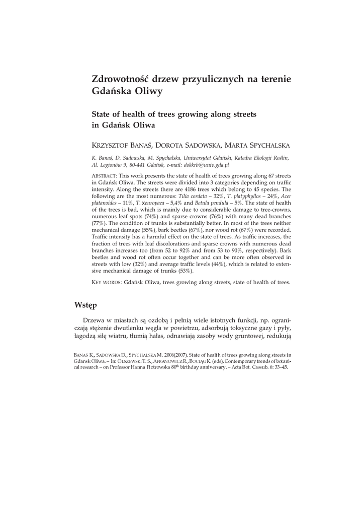 Zdrowotnoœæ drzew przyulicznych na terenie Gdañska Oliwy State of health of trees growing along streets in Gdañsk Oliwa KRZYSZTOF BANAŒ, DOROTA SADOWSKA, MARTA SPYCHALSKA K. Banaœ, D. Sadowska, M. Spychalska, Uniwersytet Gdañski, Katedra Ekologii Roœlin, Al. Legionów 9, 80-441 Gdañsk, e-mail: [email protected] ABSTRACT: This work presents the state of health of trees growing along 67 streets in Gdañsk Oliwa. The streets were divided into 3 categories depending on traffic intensity. Along the streets there are 4186 trees which belong to 45 species. The following are the most numerous: Tilia cordata – 32%, T. platyphyllos – 24%, Acer platanoides – 11%, T. Neuropaea – 5,4% and Betula pendula – 5%. The state of health of the trees is bad, which is mainly due to considerable damage to tree-crowns, numerous leaf spots (74%) and sparse crowns (76%) with many dead branches (77%). The condition of trunks is substantially better. In most of the trees neither mechanical damage (55%), bark beetles (67%), nor wood rot (67%) were recorded. Traffic intensity has a harmful effect on the state of trees. As traffic increases, the fraction of trees with leaf discolorations and sparse crowns with numerous dead branches increases too (from 52 to 92% and from 53 to 90%, respectively). Bark beetles and wood rot often occur together and can be more often observed in streets with low (32%) and average traffic levels (44%), which is related to extensive mechanical damage of trunks (53%). KEY WORDS: Gdañsk Oliwa, trees growing along streets, state of health of trees. Wstêp Drzewa w miastach s¹ ozdob¹ i pe³ni¹ wiele istotnych funkcji, np. ograniczaj¹ stê¿enie dwutlenku wêgla w powietrzu, adsorbuj¹ toksyczne gazy i py³y, ³agodz¹ si³ê wiatru, t³umi¹ ha³as, odnawiaj¹ zasoby wody gruntowej, redukuj¹ BANA K., SADOWSKA D., SPYCHALSKA M. 2006(2007). State of health of trees growing along streets in Gdansk Oliwa. In: OLSZEWSKI T. S., AFRANOWICZ R., BOCI¥G K. (eds), Contemporary trends of botanical research on Professor Hanna Piotrowska 80 birthday anniversary. Acta Bot. Cassub. 6: 3345. JD 34 Krzysztof Bana, Dorota Sadowska, Marta Spychalska sp³yw wody opadowej, latem ³agodz¹ temperaturê i chroni¹ powietrze przed utrat¹ wilgoci (Szczepanowska 2001). Skutecznoœæ tych funkcji zale¿y m.in. od stanu zdrowotnoœci drzew. Utrzymanie drzew wzd³u¿ ulic du¿ych miast napotyka na coraz wiêksze trudnoœci. Drzewa s¹ bowiem wra¿liwe na ró¿nego rodzaju zanieczyszczenia, zw³aszcza na zasolenie gleb podczas usuwania go³oledzi. Szkodliwy wp³yw wywieraj¹ tak¿e wysokie stê¿enia spalin w powietrzu. Najcenniejszym drzewem przydro¿nym jest lipa, która od dawna zreszt¹ jest szeroko stosowana w ró¿nych formach zadrzewieñ. Warto przy tej okazji zaznaczyæ, ¿e w miastach coraz czêœciej sadzone s¹ przypadkowe i ma³o wartoœciowe gatunki drzew (Buga³a 1991). Jedne z najstarszych i najcenniejszych zadrzewnieñ w Trójmieœcie znajduj¹ siê na terenie starej Oliwy. Jest ona jedn¹ z trzydziestu dzielnic Gdañska, zajmuje powierzchniê 18,23 km i liczy prawie 20 000 mieszkañców. Miasto le¿y na p³aszczyŸnie ci¹gn¹cej siê u stóp Wysoczyzny Gdañskiej, porozcinanej licznymi dolinami. Ponad dna dolin wznosz¹ siê utwory morenowe. KrawêdŸ wysoczyzny poroœniêta jest fragmentami lasów, g³ównie buczyn lub lasów mieszanych z udzia³em sosny i buka. Gdañsk Oliwa jest dzielnic¹ bardzo zró¿nicowan¹ pod wzglêdem struktury szlaków komunikacyjnych, natê¿enia ruchu ulicznego, a tak¿e gêstoœci i rodzaju przyulicznych zadrzewieñ. Wystêpuj¹ tutaj szerokie i ruchliwe ulice o œrednim natê¿eniu komunikacyjnym, a tak¿e w¹skie, brukowane uliczki w ró¿nym stopniu obsadzone drzewami. Celem pracy jest ocena stanu zdrowotnoœci przyulicznych drzew na terenie Gdañska Oliwy w 2004 roku, a tak¿e porównanie tego stanu, tam gdzie jest to mo¿liwe, ze stwierdzonym podczas badañ wykonanych przez Piotrowsk¹ (1972) oraz Piotrowsk¹ i Stasiak (1975). 1. Metody Prace prowadzono na terenie Gdañska Oliwy w 2003 i 2004 r., zawsze w lipcu i sierpniu. Badano drzewa przyuliczne z wy³¹czeniem rosn¹cych na terenach prywatnych, za p³otami i parkanami, w parkach i zieleñcach wewn¹trz osiedli. Drzewa oznaczano za pomoc¹ kluczy Koœcielnego i Sêkowskiego (1971) oraz Senety i Dolatowskiego (1997). Drzewa stwierdzono przy 67 ulicach, które podzielono na 3 kategorie zale¿nie od natê¿enia ruchu komunikacyjnego (œredniej liczby samochodów w godzinach szczytu): 1) o ma³ym natê¿eniu: Asnyka, Bitwy Oliwskiej, Bobrowa, Czarnowskieg, Dickmana, Doroszewskiego, Dro¿yny, Drzyma³y, Flisacka, G³ogowska, Gryglewskiego, Husa, Jelenia, Karpacka, Kaszubska, Krêckiego, Kurzyñskiego, Macierzy Szkolnej, Majkowskiego, Miraua, Nadwodna, Noakowskiego, Orkana, Or³owskiego, Paneckiego, Paw³a Gdañca, Rodakowskiego, Siemiradzkiego S³oneczna, Œwierkowa, Tatrzañska, W¹sowicza, Witkiewicza, Zacisze, Zajêcza i ¯ubrowa; 2) o przeciêtnym natê¿eniu: Ceynowy, Che³moñskiego, Cystersów, Derdowskiego, Grottgera, Ho³du Pruskiego, Kaprów, Kasprowicza, Kwietna, Leœna, Liczmañ- Zdrowotnoæ drzew przyulicznych na terenie Gdañska Oliwy 35 skiego, Micha³owskiego, Norblina, Opacka, Poczty Gdañskiej, Podhalañska, Tetmajera, ulica VII Dwór i ¯eromskiego; 3) g³ówne ci¹gi komunikacyjne o du¿ym natê¿eniu ruchu: Abrahama, Ba¿yñskiego, Czy¿ewskiego, Aleja Grunwaldzka, Obroñców Westerplatte, Opata Jacka Rybiñskiego, Piastowska, Polanki, Pomorska, Stary Rynek Oliwski, Wita Stwosza i Aleja Wojska Polskiego. Analizê wp³ywu natê¿enia ruchu komunikacyjnego na zdrowotnoœæ drzew dokonano na podstawie porównania takich cech drzew, jak: plamistoœæ liœci, procentowy udzia³ martwej korony i stopieñ jej przerzedzenia, a tak¿e wystêpowanie uszkodzeñ mechanicznych pni, obecnoœæ korników i próchnicy. Cechy te odzwierciedlaj¹ ogólny stan zdrowotnoœci zadrzewieñ oraz jeg
