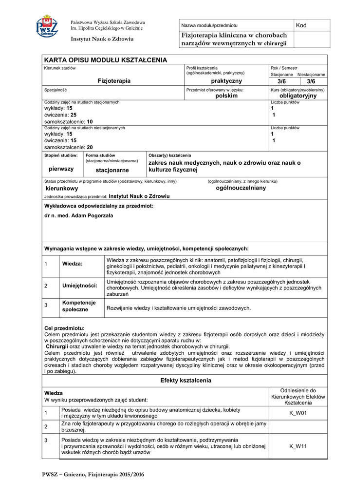 PWSZ – Gniezno, Fizjoterapia 2015/2016