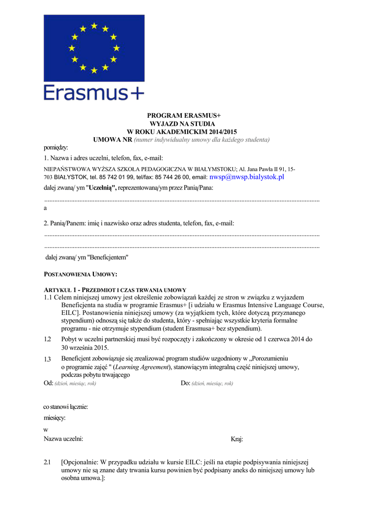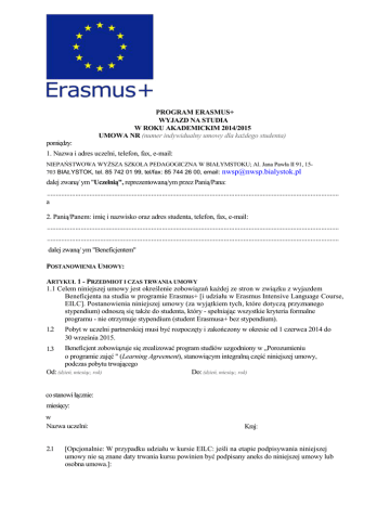 PROGRAM ERASMUS+ WYJAZD NA STUDIA W ROKU AKADEMICKIM 2014/2015 UMOWA NR (numer indywidualny umowy dla każdego studenta) pomiędzy: 1. Nazwa i adres uczelni, telefon, fax, e-mail: NIEPAŃSTWOWA WYŻSZA SZKOŁA PEDAGOGICZNA W BIAŁYMSTOKU; Al. Jana Pawła II 91, 15703 BIAŁYSTOK, tel. 85 742 01 99, tel/fax: 85 744 26 00, email: [email protected] dalej zwaną/ ym "Uczelnią", reprezentowaną/ym przez Panią/Pana: ..................................................................................................................................................................... a 2. Panią/Panem: imię i nazwisko oraz adres studenta, telefon, fax, e-mail: ..................................................................................................................................................................... ..................................................................................................................................................................... dalej zwaną/ ym "Beneficjentem" POSTANOWIENIA UMOWY: ARTYKUŁ 1 - PRZEDMIOT I CZAS TRWANIA UMOWY 1.1 Celem niniejszej umowy jest określenie zobowiązań każdej ze stron w związku z wyjazdem Beneficjenta na studia w programie Erasmus+ [i udziału w Erasmus Intensive Language Course, EILC]. Postanowienia niniejszej umowy (za wyjątkiem tych, które dotyczą przyznanego stypendium) odnoszą się także do studenta, który - spełniając wszystkie kryteria formalne programu - nie otrzymuje stypendium (student Erasmusa+ bez stypendium). 1.2 Pobyt w uczelni partnerskiej musi być rozpoczęty i zakończony w okresie od 1 czerwca 2014 do 30 września 2015. Beneficjent zobowiązuje się zrealizować program studiów uzgodniony w „Porozumieniu o programie zajęć " (Learning Agreement), stanowiącym integralną część niniejszej umowy, podczas pobytu trwającego Od: (dzień, miesiąc, rok) Do: (dzień, miesiąc, rok) 1.3 co stanowi łącznie: miesięcy: w Nazwa uczelni: 2.1 Kraj: [Opcjonalnie: W przypadku udziału w kursie EILC: jeśli na etapie podpisywania niniejszej umowy nie są znane daty trwania kursu powinien być podpisany aneks do niniejszej umowy lub osobna umowa.]: 2.2 Kurs EILC rozpocznie się najwcześniej [data] i zakończy najpóźniej [data]. ARTYKUŁ 2 - FINANSOWANIE I PRZEZNACZENIE STYPENDIUM 2.1 Stypendium będące dofinansowaniem kosztów związanych z wyjazdem i pobytem na studiach [i kursem EILC] wynosi maksymalnie ….EUR. 2.2 Końcowa kwota stypendium zostanie określona w następujących sposób: liczba miesięcy rzeczywistego czasu pobytu z dokładnością do 0,5 [0,25] miesiąca x miesięczna stawka wynosząca . …..EUR. Beneficjent zobowiązany jest dostarczyć zaświadczenie z instytucji przyjmującej z datą rozpoczęcia i zakończenia pobytu na studiach. Uczelnia gwarantuje wypłatę stypendium na pierwotnie uzgodniony okres pobytu w uczelni partnerskiej. Stypendium jest przyznane na zrealizowanie wyjazdu wymienionego w pkt. 1.3. Otrzymane stypendium z budżetu programu Erasmus jest przeznaczone na pokrycie dodatkowych, a nie pełnych kosztów związanych z wyjazdem i pobytem w uczelni partnerskiej. 2.3 Wypłacenie stypendium będzie następowało w miesięcznych/ dwumiesięcznych/ trzymiesięcznych ratach (proszę określić liczbę rat), w sposób uzgodniony pomiędzy stronami (proszę sprecyzować sposób przekazywania stypendium). 2.4 Rozliczenie wypłaconego stypendium nastąpi po przedłożeniu przez Beneficjenta dokumentów wymienionych w pkt. 4.4 i 4.5. ARTYKUŁ 3 - UBEZPIECZENIE 3.1 Beneficjent oświadcza, że został poinformowany o zasadach związanych z ubezpieczeniem. Obowiązkowe ubezpieczenie to [tu wskazać], zalecane to [tu wskazać]. Za zapewnienia ubezpieczenia obowiązkowego jest odpowiedzialna [należy wskazać właściwe: uczelnia przyjmująca, uczelnia macierzysta czy Beneficjent]. [opcjonalnie i zalecane: zaleca się wskazanie w umowie numery polisy ubezpieczeniowej oraz nazwy ubezpieczyciela] 3.2 Ubezpieczenie kosztów leczenia Beneficjent oświadcza, że posiada ubezpieczenie kosztów leczenia oraz zna zakres tego ubezpieczenia: [Należy określić rodzaj ubezpieczenia, np. Europejska Karta Ubezpieczenia Zdrowotnego w przypadku wyjazdu do kraj UE i/lub prywatne ubezpieczenie o równorzędnym zakresie w przypadku wyjazdu do kraju nie będącego członkiem UE.]. Zaleca się wykupienie przez Beneficjenta dodatkowego ubezpieczenia prywatnego obejmującego koszty ewentualnych dodatkowych interwencji medycznych bądź transportu do kraju. ARTYKUŁ 4 - ZOBOWIĄZANIA STRON UMOWY 4.1 Beneficjent oświadcza, że zapoznał się z kryteriami formalnymi, które powinni spełniać studenci zakwalifikowani na wyjazd w programie Erasmus+ i że spełnia te kryteria. 4.2 Beneficjent oświadcza, że zapoznał się z zasadami programu odnoszącymi się do wyjazdów studentów (załącznik do umowy pomiędzy uczelnią a Narodową Agencją) i że będzie przestrzegał tych zasad. 4.3 Beneficjent zobowiązuje się do zrealizowania programu studiów uzgodnionego przed wyjazdem w „Porozumieniu o programie zajęć" (LA). O jakichkolwiek zmianach w LA Beneficjent musi bezzwłocznie powiadomić Uczelnię. Jeżeli Uczelnia wyrazi zgodę na proponowane zmiany, wprowadzona zostanie odpowiednia pisemna poprawka do LA. 4.4 Beneficjent zobowiązuje się dostarczyć Uczelni w terminie do (dzień, miesiąc, rok) .............. zaświadczenie z uczelni partnerskiej potwierdzające okres pobytu w uczelni partnerskiej oraz że zaplanowany program studiów został zrealizowany w czasie określonym w pkt. 1.3, a także informację o zaliczonych przedmiotach, zdanych egzaminach i uzyskanych ocenach („Wykaz zaliczeń" - TR). 4.5 Beneficjent zobowiązuje się wypełnić Ankietę Stypendysty Erasmusa według wzoru i w formie wymaganej przez Uczelnię. 4.6 Na podstawie dostarczonego „Wykazu zaliczeń" Uczelnia zobowiązuje się zapewnić Beneficjentowi zaliczenie okresu studiów/przedmiotów/egzamin
