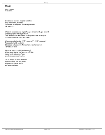 Witamy! Maria Autor: Robert 14.02.2007. Siedzisz w kuchni, liczysz kartofle: przy tobie brat, starszy: rachunek w sklepiku, podarte pantofle: nie starczy... W dzieñ sprzedajesz myde³ka, po znajomych, po obcych (dlaczego przestali byæ mili?). "Nie trzeba? Do widzenia." I znajdziesz siê w kropce: do innych zadzwonisz po chwili. Wieczorem kelnerka. "Pó³ czarnej?", "Pó³ czarnej." Podasz i chwilê spokój. Stoisz ze sztucznym u¶miechem i z charme'em, i z ³ezk± w oku. Mo¿e w nocy przyjdzie Gestapo? Wstaniesz blada, z p³acz±c± córk±, kiedy bêd± plugaw± ³ap± przetrz±saæ moje biurko. Co ta wojna w tobie zabi³a? Nie ma mnie, nie ma teatru... Wo³am do ciebie, mi³a, wo³aniem wiatru. http://www.e-guerilla.nazwa.pl/joomla Kreator PDF Utworzono 8 March, 2017, 11:37
