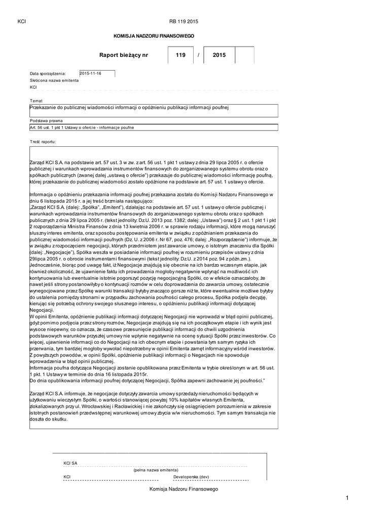 KCI RB 119 2015 KOMISJA NADZORU FINANSOWEGO Raport bieżący nr Data sporządzenia: 119 / 2015 2015-11-16 Skróc ona nazwa emitenta KCI Temat Przekazanie do publicznej wiadomości informacji o opóźnieniu publikacji informacji poufnej Podstawa prawna Art. 56 ust. 1 pkt 1 Ustawy o oferc ie - informac je poufne Treść raportu: Zarząd KCI S.A. na podstawie art. 57 ust. 3 w zw. z art. 56 ust. 1 pkt 1 ustawy z dnia 29 lipca 2005 r. o ofercie publicznej i warunkach wprowadzania instrumentów finansowych do zorganizowanego systemu obrotu oraz o spółkach publicznych (zwanej dalej „ustawą o ofercie”) przekazuje do publicznej wiadomości informację poufną, której przekazanie do publicznej wiadomości zostało opóźnione na podstawie art. 57 ust. 1 ustawy o ofercie. Informacja o opóźnieniu przekazania informacji poufnej przekazana została do Komisji Nadzoru Finansowego w dniu 6 listopada 2015 r. a jej treść brzmiała następująco: „Zarząd KCI S.A. (dalej: „Spółka”, „Emitent”), działając na podstawie art. 57 ust. 1 ustawy o ofercie publicznej i warunkach wprowadzania instrumentów finansowych do zorganizowanego systemu obrotu oraz o spółkach publicznych z dnia 29 lipca 2005 r. (tekst jednolity: Dz.U. 2013 poz. 1382; dalej: „Ustawa”) oraz § 2 ust. 1 pkt 1 i pkt 2 rozporządzenia Ministra Finansów z dnia 13 kwietnia 2006 r. w sprawie rodzaju informacji, które mogą naruszyć słuszny interes emitenta, oraz sposobu postępowania emitenta w związku z opóźnianiem przekazania do publicznej wiadomości informacji poufnych (Dz. U. z 2006 r. Nr 67, poz. 476; dalej: „Rozporządzenie”) informuje, że w związku z rozpoczęciem negocjacji, których przedmiotem jest zawarcie umowy, o istotnym znaczeniu dla Spółki (dalej: „Negocjacje”), Spółka weszła w posiadanie informacji poufnej w rozumieniu przepisów ustawy z dnia 29lipca 2005 r. o obrocie instrumentami finansowymi (tekst jednolity: Dz.U. z 2014 poz. 94 z późn.zm.). Jednocześnie, biorąc pod uwagę fakt, iż Negocjacje znajdują się obecnie na ich bardzo wczesnym etapie, jak również okoliczność, że ujawnienie faktu ich prowadzenia mogłoby negatywnie wpłynąć na możliwość ich kontynuowania lub ewentualnie istotnie pogorszyć pozycję negocjacyjną Spółki, co w efekcie oznaczałoby, że nawet jeśli strony postanowiłyby o kontynuacji rozmów w celu doprowadzenia do zawarcia umowy, ostatecznie wynegocjowane przez Spółkę warunki transakcji byłyby znacząco gorsze niż te, które ewentualnie możliwe byłyby do ustalenia pomiędzy stronami w przypadku zachowania poufności całego procesu, Spółka podjęła decyzję, kierując się potrzebą ochrony swojego słusznego interesu, o opóźnieniu publikacji informacji dotyczącej Negocjacji. W opinii Emitenta, opóźnienie publikacji informacji dotyczącej Negocjacji nie wprowadzi w błąd opinii publicznej, gdyż pomimo podjęcia przez strony rozmów, Negocjacje znajdują się na ich początkowym etapie i ich wynik jest wysoce niepewny, co oznacza, że czasowe przesunięcie publikacji informacji do chwili uzgodnienia podstawowych warunków przyszłej umowy nie wpłynie negatywnie na ocenę sytuacji Spółki przez inwestorów. Co więcej, ujawnienie informacji co do Negocjacji na ich obecnym etapie i powstania tym samym ryzyka ich przerwania, tym bardziej mogłoby wywołać niepotrzebny w opinii Emitenta zamęt informacyjny wśród inwestorów. Z powyższych powodów, w opinii Spółki, opóźnienie publikacji informacji o Negacjach nie spowoduje wprowadzenia w błąd opinii publicznej. Informacja poufna dotycząca Negocjacji zostanie opublikowana przez Emitenta w trybie określonym w art. 56 ust. 1 pkt. 1 Ustawy w terminie do dnia 16 listopada 2015r. Do dnia opublikowania informacji poufnej dotyczącej Negocjacji, Spółka zapewni zachowanie jej poufności.” Zarząd KCI S.A. informuje, że negocjacje dotyczyły zawarcia umowy sprzedaży nieruchomości będących w użytkowaniu wieczystym Spółki, o wartości stanowiącej powyżej 10% kapitałów własnych Emitenta, zlokalizowanych przy ul. Wrocławskiej i Racławickiej i nie zakończyły się osiągnięciem porozumienia w zakresie istotnych postanowień przedwstępnej warunkowej umowy zbycia w/w nieruchomości. Tym samym transakcja nie doszła do skutku. KCI SA (pełna nazwa emitenta) KCI Developerska (dev) Komisja Nadzoru Finansowego 1 KCI RB 119 2015 (skróc ona nazwa emitenta) 30-011 (sektor wg. klasyfikac ji GPW w W-wie) Kraków (kod poc ztowy) (miejscowość) Wrocławska 53 (ulica) (numer) +48 12 423 33 74 +48 12 423 33 75 (telefon) (fax) www.kc i.pl [email protected] (e-mail) (www) 071011304 551 000 77 42 (NIP) (REGON) PODPISY OSÓB REPREZENTUJĄCYCH SPÓŁKĘ Data Imię i Nazwisko Stanowisko/Funkc ja 2015-11-16 Grzegorz Hajdarowic z Prezes Zarządu 2015-11-16 Agata Kalińska Wic eprezes Zarządu Podpis Komisja Nadzoru Finansowego 2