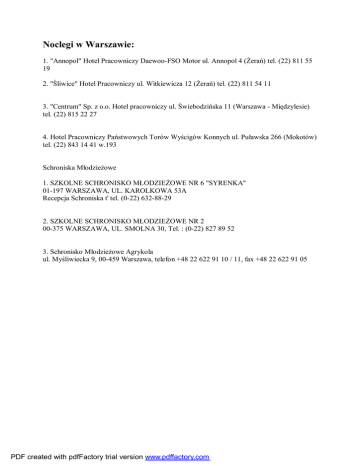 Noclegi w Warszawie: 1. "Annopol" Hotel Pracowniczy Daewoo-FSO Motor ul. Annopol 4 (Żerań) tel. (22) 811 55 19 2. "Śliwice" Hotel Pracowniczy ul. Witkiewicza 12 (Żerań) tel. (22) 811 54 11 3. "Centrum" Sp. z o.o. Hotel pracowniczy ul. Świebodzińska 11 (Warszawa - Międzylesie) tel. (22) 815 22 27 4. Hotel Pracowniczy Państwowych Torów Wyścigów Konnych ul. Puławska 266 (Mokotów) tel. (22) 843 14 41 w.193 Schroniska Młodzieżowe 1. SZKOLNE SCHRONISKO MŁODZIEŻOWE NR 6 "SYRENKA" 01-197 WARSZAWA, UL. KAROLKOWA 53A Recepcja Schroniska ť tel. (0-22) 632-88-29 2. SZKOLNE SCHRONISKO MŁODZIEŻOWE NR 2 00-375 WARSZAWA, UL. SMOLNA 30, Tel. : (0-22) 827 89 52 3. Schronisko Młodzieżowe Agrykola ul. Myśliwiecka 9, 00-459 Warszawa, telefon +48 22 622 91 10 / 11, fax +48 22 622 91 05 PDF created with pdfFactory trial version www.pdffactory.com