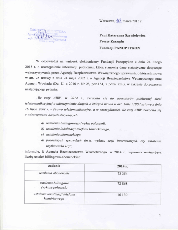 W odniesieniu zal do pytania dotycz4cego ,,siqgania przez ABW po dane