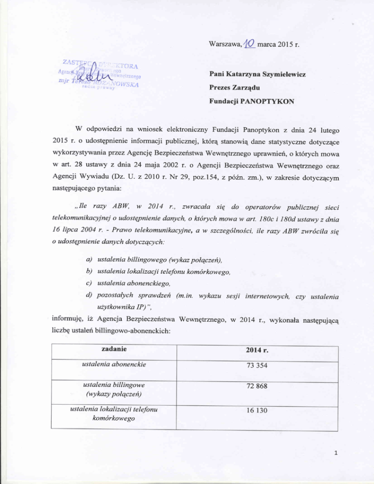 ,,Ile razy ABW, w 2014 r., nvracala siQ. do operator6w publicznej sieci