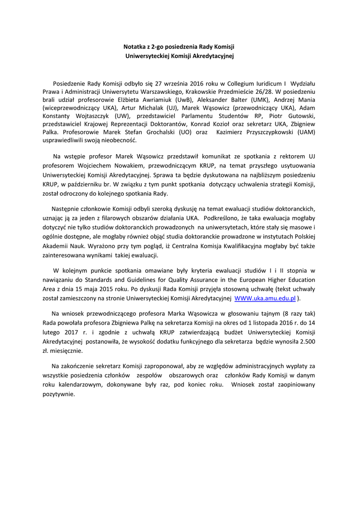 Notatka z 2-go posiedzenia Rady Komisji Uniwersyteckiej Komisji Akredytacyjnej Posiedzenie Rady Komisji odbyło się 27 września 2016 roku w Collegium Iuridicum I Wydziału Prawa i Administracji Uniwersytetu Warszawskiego, Krakowskie Przedmieście 26/28. W posiedzeniu brali udział profesorowie Elżbieta Awriamiuk (UwB), Aleksander Balter (UMK), Andrzej Mania (wiceprzewodniczący UKA), Artur Michalak (UJ), Marek Wąsowicz (przewodniczący UKA), Adam Konstanty Wojtaszczyk (UW), przedstawiciel Parlamentu Studentów RP, Piotr Gutowski, przedstawiciel Krajowej Reprezentacji Doktorantów, Konrad Kozioł oraz sekretarz UKA, Zbigniew Palka. Profesorowie Marek Stefan Grochalski (UO) oraz Kazimierz Przyszczypkowski (UAM) usprawiedliwili swoją nieobecność. Na wstępie profesor Marek Wąsowicz przedstawił komunikat ze spotkania z rektorem UJ profesorem Wojciechem Nowakiem, przewodniczącym KRUP, na temat przyszłego usytuowania Uniwersyteckiej Komisji Akredytacyjnej. Sprawa ta będzie dyskutowana na najbliższym posiedzeniu KRUP, w październiku br. W związku z tym punkt spotkania dotyczący uchwalenia strategii Komisji, został odroczony do kolejnego spotkania Rady. Następnie członkowie Komisji odbyli szeroką dyskusję na temat ewaluacji studiów doktoranckich, uznając ją za jeden z filarowych obszarów działania UKA. Podkreślono, że taka ewaluacja mogłaby dotyczyć nie tylko studiów doktoranckich prowadzonych na uniwersytetach, które stały się masowe i ogólnie dostępne, ale mogłaby również objąć studia doktoranckie prowadzone w instytutach Polskiej Akademii Nauk. Wyrażono przy tym pogląd, iż Centralna Komisja Kwalifikacyjna mogłaby być także zainteresowana wynikami takiej ewaluacji. W kolejnym punkcie spotkania omawiane były kryteria ewaluacji studiów I i II stopnia w nawiązaniu do Standards and Guidelines for Quality Assurance in the European Higher Education Area z dnia 15 maja 2015 roku. Po dyskusji Rada Komisji przyjęła stosowną uchwałę (tekst uchwały został zamieszczony na stronie Uniwersyteckiej Komisji Akredytacyjnej WWW.uka.amu.edu.pl ). Na wniosek przewodniczącego profesora Marka Wąsowicza w głosowaniu tajnym (8 razy tak) Rada powołała profesora Zbigniewa Palkę na sekretarza Komisji na okres od 1 listopada 2016 r. do 14 lutego 2017 r. i zgodnie z uchwałą KRUP zatwierdzającą budżet Uniwersyteckiej Komisji Akredytacyjnej postanowiła, że wysokość dodatku funkcyjnego dla sekretarza będzie wynosiła 2.500 zł. miesięcznie. Na zakończenie sekretarz Komisji zaproponował, aby ze względów administracyjnych wypłaty za wszystkie posiedzenia członków zespołów obszarowych oraz członków Rady Komisji w danym roku kalendarzowym, dokonywane były raz, pod koniec roku. Wniosek został zaopiniowany pozytywnie.
