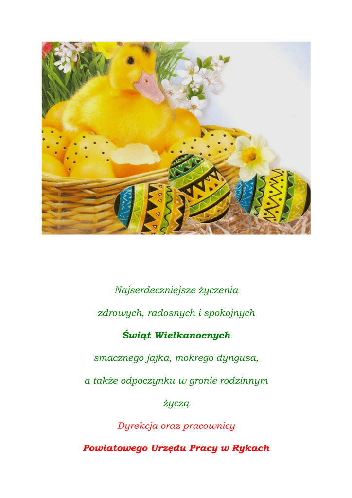 Najserdeczniejsze życzenia zdrowych, radosnych i spokojnych Świąt Wielkanocnych smacznego jajka, mokrego dyngusa, a także odpoczynku w gronie rodzinnym życzą Dyrekcja oraz pracownicy Powiatowego Urzędu Pracy w Rykach