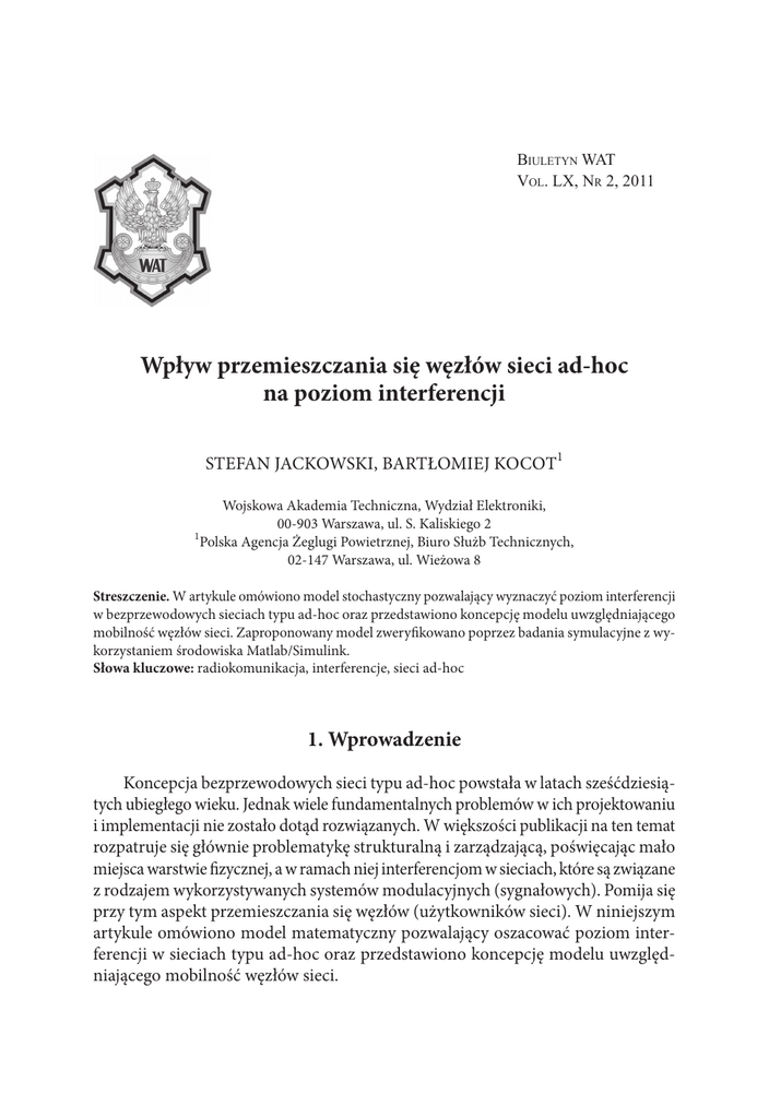Biuletyn WAT Vol. LX, Nr 2, 2011 Wpływ przemieszczania się węzłów sieci ad-hoc na poziom interferencji Stefan Jackowski, Bartłomiej Kocot1 Wojskowa Akademia Techniczna, Wydział Elektroniki, 00-903 Warszawa, ul. S. Kaliskiego 2 1 Polska Agencja Żeglugi Powietrznej, Biuro Służb Technicznych, 02-147 Warszawa, ul. Wieżowa 8 Streszczenie. W artykule omówiono model stochastyczny pozwalający wyznaczyć poziom interferencji w bezprzewodowych sieciach typu ad-hoc oraz przedstawiono koncepcję modelu uwzględniającego mobilność węzłów sieci. Zaproponowany model zweryfikowano poprzez badania symulacyjne z wykorzystaniem środowiska Matlab/Simulink. Słowa kluczowe: radiokomunikacja, interferencje, sieci ad-hoc 1. Wprowadzenie Koncepcja bezprzewodowych sieci typu ad-hoc powstała w latach sześćdziesiątych ubiegłego wieku. Jednak wiele fundamentalnych problemów w ich projektowaniu i implementacji nie zostało dotąd rozwiązanych. W większości publikacji na ten temat rozpatruje się głównie problematykę strukturalną i zarządzającą, poświęcając mało miejsca warstwie fizycznej, a w ramach niej interferencjom w sieciach, które są związane z rodzajem wykorzystywanych systemów modulacyjnych (sygnałowych). Pomija się przy tym aspekt przemieszczania się węzłów (użytkowników sieci). W niniejszym artykule omówiono model matematyczny pozwalający oszacować poziom interferencji w sieciach typu ad-hoc oraz przedstawiono koncepcję modelu uwzględniającego mobilność węzłów sieci. 84 S. Jackowski, B. Kocot 2. Modele interferencyjne Poziom interferencji w sieciach typu ad-hoc można określić z wykorzystaniem modelu deterministycznego lub stochastycznego. Podział ten wynika z przyjmowanego założenia dotyczącego rozmieszczenia węzłów sieci. W modelu deterministycznym węzły sieci rozmieszczone są w strukturze heksagonalnej, natomiast w modelu stochastycznym przyjmuje się założenie, iż rozmieszczenie węzłów na powierzchni koła o określonym promieniu można przedstawić za pomocą modelu opisanego procesem stochastycznym (w większości przypadków procesem Poissona). Model deterministyczny został szczegółowo omówiony w [1]. 2.1. Model stochastyczny Przyjęto następujące, upraszczające założenia: −Węzły sieci ad-hoc są równomiernie rozmieszczone na powierzchni koła o promieniu r, z gęstością rozmieszczenia węzłów na jednostkę powierzchni. −Transmisja między węzłami odbywa się poprzez kanały radiowe z zanikami. Zaniki modelowane są rozkładem logarytmiczno-normalnym (log-normalnym). Dokonajmy oszacowania poziomu sygnału interferującego docierającego do węzła odniesienia rozmieszczonego w środku koła o promieniu r. Oszacowanie to można podzielić na kilka zagadnień: −Oszacowanie liczby węzłów interferujących. −Oszacowanie rozmieszczenia węzłów interferujących względem węzła odniesienia. −Oszacowanie poziomów sygnałów interferujących pochodzących z węzłów rozmieszczonych w różnej odległości od węzła odniesienia. −Oszacowanie wartości średniej oraz wariancji wynikowego sygnału zakłócającego z wykorzystaniem różnych metod aproksymacji (FW — Fenton-Wilkinson, SW — Schwarz-Yeh). Liczba węzłów interferujących oraz gęstość ich rozmieszczenia zależy od liczby wszystkich węzłów tworzących sieć (gęstości ich rozmieszczenia na jednostce powierzchni ), współczynnika propagacji , definiowanego jako stosunek odchylenia standardowego wokół logarytmu ze średniego poziomu mocy odbieranego sygnału do współczynnika zaników oraz typu protokołu MAC (ang. Medium Access Control). Na podstawie badań oraz przeprowadzonych symulacji [6] gęstość rozmieszczenia węzłów interferujących można wyznaczyć z zależności [6]: Wpływ przemieszczania się węzłów sieci ad-hoc na poziom interferencji 85 0,3466 + 0,1658log ( ) dla MAC klasa I ≈ 0, 2403 + 0,0910log ( ) dla MAC klasa II 0, 2634 + 0,1741log ( ) dla MAC klasa III. (1) Protokoły MAC w sieciach bezprzewodowych typu ad-hoc można podzielić na trzy klasy, ze względu na sposoby rozwiązywania przez nie problematyki węzłów ukrytych i odkrytych: a) klasa I — protokoły zorientowane na nadajnik; b) klasa II — protokoły zorientowane na nadajnik i odbiornik; c) klasa III — protokoły zorientowane na odbiornik. Zależność gęstości rozmieszczenia węzłów interferujących od klasy protokołu MAC w bezprzewodowych sieciach ad-hoc została przedstawiona na rysunku 1. Rys. 1. Zależność gęstości rozmieszczenia węzłów interferujących od klasy protokołu MAC w bezprzewodowych sieciach ad-hoc Przyjmijmy, że węzły interferujące są równomiernie rozmieszczone z gęstością wokół węzła odniesienia. Oznaczmy przez rm odległość m-tego węzła zakłócającego od węzła odniesienia. Na podstawie [6]: E [rm ] ≈ m . π ⋅ν (2) Sygnał nadawany przez każdy m-ty węzeł interferujący rozmieszczony w odległości rm od węzła odniesienia może nie stanowić interferencji dla węzła odniesienia 86 S. Jackowski, B. Kocot z prawdopodobieństwem 1- p(rm), gdzie p(rm) jest prawdopodobieństwem połączenia między węzłem interferującym a węzłem odniesienia określonym zależnością [6]: 1 p (rm ) = ⋅ 1 − erf 2 ( ) , log rm u ⋅ (3) 10 , natomiast rm jest odległością znormalizowaną, wyrażoną 2 ⋅ log10 r poprzez zależność rm = m , gdzie R jest promieniem obszaru pokrycia węzła odR niesienia. gdzie u = Uwzględniając różne poziomy sygnałów zakłócających docierających do węzła odniesienia, należy więc przy oszacowywaniu całkowitego poziomu sygnału zakłócającego w węźle odniesienia sumować sygnały pochodzące od różnych węzłów zakłócających z odpowiednim współczynnikiem wagowym, proporcjonalnym do 1 – p(rm). Na podstawie badań i symulacji przedstawionych w [6] współczynnik ten można wyrazić zależnością w = (1 – p(rm)). Wsp