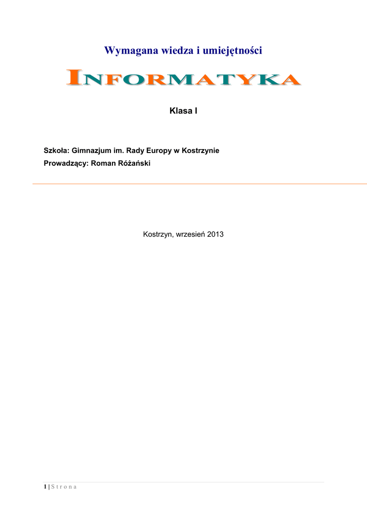 Wymagana wiedza i umiejętności Klasa I Szkoła: Gimnazjum im. Rady Europy w Kostrzynie Prowadzący: Roman Różański Kostrzyn, wrzesień 2013 1|Strona PODSTAWY UŻYTKOWANIA KOMPUTERA Lp. 1 2 Temat lekcji Spotkanie z informatyką Na czym polega działanie komputera? Liczba godzin 1 Wiedza i umiejętności podstawowe świadomie stosuje podstawowe zasady higieny i bezpieczeństwa pracy z komputerem; wskazuje przykłady zastosowania komputera w szkole, zakładach pracy i życiu społecznym 1 zna działanie komputera w podstawowym zakresie; omawia współczesne urządzenia oparte na technice komputerowej oraz wskazuje ich zastosowania w życiu codziennym rozumie, na czym polega instalowanie i uruchamianie programów; 1 wymienia obszary zastosowań informatyki jako dziedziny wiedzy potrafi dokładnie wyjaśnić rolę procesora; zna przeznaczenie podstawowych urządzeń współpracujących z komputerem 3 zna prawidłowe zasady organizacji komputerowego stanowiska pracy; określa przeznaczenie elementów składowych komputera; wie, jaka jest rola systemu operacyjnego; Na czym polega instalowanie i uruchamianie programu? rozszerzające wymienia rodzaje pamięci wewnętrznych komputera i nośniki pamięci zewnętrznej oraz omawia jednostki pojemności pamięci wyjaśnia dokładnie procesy zachodzące w czasie uruchamiania programu; określa pojemność pamięci, ilość wolnego i zajętego miejsca na dysku oraz wielkość plików; wie, jak reprezentowane są liczby w komputerze; 4 Kilka zasad pracy z programem komputerowym 1 zna podstawowe zasady pracy z programem komputerowym (uruchamianie, wybór opcji z menu, kończenie pracy z programem, umieszczanie skrótu programu na pulpicie); wie, że należy posiadać licencję na używany program komputerowy, chyba że ma odpowiedni status, np. shareware zna zasady tworzenia dokumentu komputerowego w programie graficznym; 5 Tworzenie dokumentu komputerowego 6. Zapisywanie dokumentu komputerowego wykorzystuje narzędzia programu do kreślenia prostokątów, elips, linii, wielokątów oraz używa gumki potrafi samodzielnie zainstalować program komputerowy; potrafi wymienić i krótko omówić rodzaje licencji na programy komputerowe tworzy złożone rysunki wykorzystując dowolne narzędzia edytora; wyjaśnia różnicę między grafiką rastrową i wektorową; określa własności edytorów grafiki 1 rozumie, dlaczego należy zapisać dokument na nośniku pamięci masowej; 1 potrafi zapisać dokument komputerowy w pliku w określonym miejscu (dysku, folderze); swobodnie porusza się po strukturze katalogów, korzystając z dowolnego programu; tworzy własne foldery 7. 8. Odczytywanie dokumentu komputerowego Operacje na blokach 2|Strona odszukuje, odczytuje rysunek zapisany w pliku z dowolnego miejsca (dysku, folderu), wprowadza zmiany i zapisuje ponownie; 1 2 rozróżnia pliki ze względu na ich rozszerzenia; zna podstawowe formaty plików graficznych; charakteryzuje formaty pików graficznych; zapisuje rysunek w innym formacie graficznym; drukuje rysunek samodzielnie dobiera parametry drukowania rozumie działanie Schowka; zaznacza, kopiuje (lub wycina) fragment rysunku i wkleja w innym miejscu tego samego dokumentu lub innego przygotowuje złożony projekt rysunku z wykorzystaniem elementów skopiowanych z innych dokumentów; samodzielnie wyszukuje w opcjach menu nieznane możliwości programu 9. 10. rozumie, dlaczego należy wykonywać kopie dokumentów; kopiuje, przenosi i kasuje pliki wybraną przez siebie metodą; Porządkowanie i ochrona dokumentów 2 Sprawdzian 1 kompresuje i dekompresuje pliki i foldery; utrzymuje na bieżąco porządek w komputerze; pamięta o tworzeniu na innym nośniku kopii ważniejszych plików; rozumie, jakie szkody może wyrządzić wirus komputerowy, i posługuje się programem antywirusowym w celu jego wykrycia omawia rodzaje zagrożeń (wirusy, konie trojańskie, programy szpiegujące) i uzasadnia ich szkodliwość – – EDYCJA TEKSTU Lp. 1. 2. 3. 4. 5. Temat lekcji Zasady pracy z dokumentem tekstowym Formatowanie tekstu Dostosowywanie formy tekstu do przeznaczenia Redagowanie dokumentu tekstowego Operacje na blokach tekstu Liczba godzin 1 1 1 Wiedza i umiejętności podstawowe przenosi poznane zasady zapisu i odczytu dokumentów graficznych na dokumenty tekstowe; tworzy nowy dokument formatując go według podanych reguł (parametry czcionek, wcięcia, odstęp między wierszami, centrowanie, justowanie, przesunięcie do marginesów); 2 świadomie stosuje zasady formatowania akapitu; wyjaśnia na przykładzie pojęcie akapitu stosuje, tam gdzie jest to wskazane, twardy podział wiersza; rozumie znaczenie odpowiedniego dostosowania tekstu do jego przeznaczenia; stosuje odpowiednie parametry czcionek w przykładowym tekście, np. zaproszeniu; poprawia błędy w istniejącym pliku według poleceń zawartych w ćwiczeniu, w tym stosuje słownik; kopiuje, wycina lub przenosi fragmenty tekstu w tym samym dokumencie lub innym korzystając ze Schowka; osadza rysunek w tekście, a następnie poprawia go; Wstawianie obrazów do tekstu dobiera odpowiednio format akapitu i uzasadnia jego wybór; sprawnie ustala parametry formatowania przed napisaniem tekstu lub po jego napisaniu drukuje dokumenty tekstowe 6. świadomie stosuje poznane zasady redagowania tekstu prawidłowo łamie wiersz tekstu, wstawia nowy wiersz, kasuje wiersz; zna zastosowanie malarza formatów, słownika synonimów i kreatora zadań 1 zna ogólne możliwości edytorów tekstu; zna zasady pracy z dokumentem tekstowym i podstawowe zasady redagowania tekstu wstawia obraz (np. ClipArt) do tekstu i zna podstawowe sposoby formatowania obrazu wstawionego do tekstu 1 rozszerzające wie, na czym polega mechanizm OLE i wstawia obraz z pliku wykorzystując mechanizm OLE; prawidłowo dobiera krój czcionki do danego tekstu; uzasadnia wybór czcionki szeryfowej i bezszeryfowej; potrafi samodzielnie odszukać dodatkowe możliwości formatowania obrazu wstawionego do tek