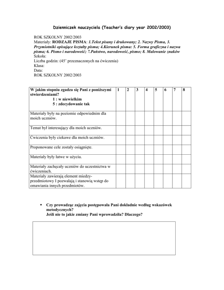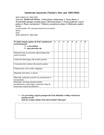 Dzienniczek nauczyciela (Teacher’s diary year 2002/2003) ROK SZKOLNY 2002/2003 Materiały: RODZAJE PISMA: 1.Tekst pisany i drukowany; 2. Nazwy Pisma, 3. Przymiotniki opisujące kształty pisma; 4.Kierunek pisma: 5. Forma graficzna i nazwa pisma; 6. Pismo i narodowość; 7.Państwo, narodowość, pismo; 8. Malowanie znaków Szkoła: Liczba godzin: (45’ przeznaczonych na ćwiczenia) Klasa: Data: ROK SZKOLNY 2002/2003 W jakim stopniu zgadza się Pani z poniższymi stwierdzeniami? 1 : w niewielkim 5 : zdecydowanie tak 1 2 3 4 5 6 Materiały były na poziomie odpowiednim dla moich uczniów. Temat był interesujący dla moich uczniów. Ćwiczenia były ciekawe dla moich uczniów. Proponowane cele zostały osiągnięte. Materiały były łatwe w użyciu. Materiały zachęcały uczniów do uczestnictwa w ćwiczeniach. Materiały zawierają element miedzyprzedmiotowy I pozwalają i stanowią wstęp do omawiania innych przedmiotów. ! Czy prowadząc zajęcia postępowała Pani dokładnie według wskazówek metodycznych? Jeśli nie to jakie zmiany Pani wprowadziła? Dlaczego? 7 8 ! Co sprawdziło się doskonale (np. temat, rodzaje ćwiczeń …) - Dla Pani? - Dla uczniów? Czy miała Pani jakieś trudności? Jakie? Czy uczniowie mieli jakieś trudności? Jakie? Czy jest w materiałach coś co powinno być wyrzucone, dodane lub zmodyfikowane. Jeśli tak, to proszę umieścić swoje sugestie poniżej. Sugestie : Jeśli Pani sobie życzy proszę wpisać swoje nazwisko: ______________________________